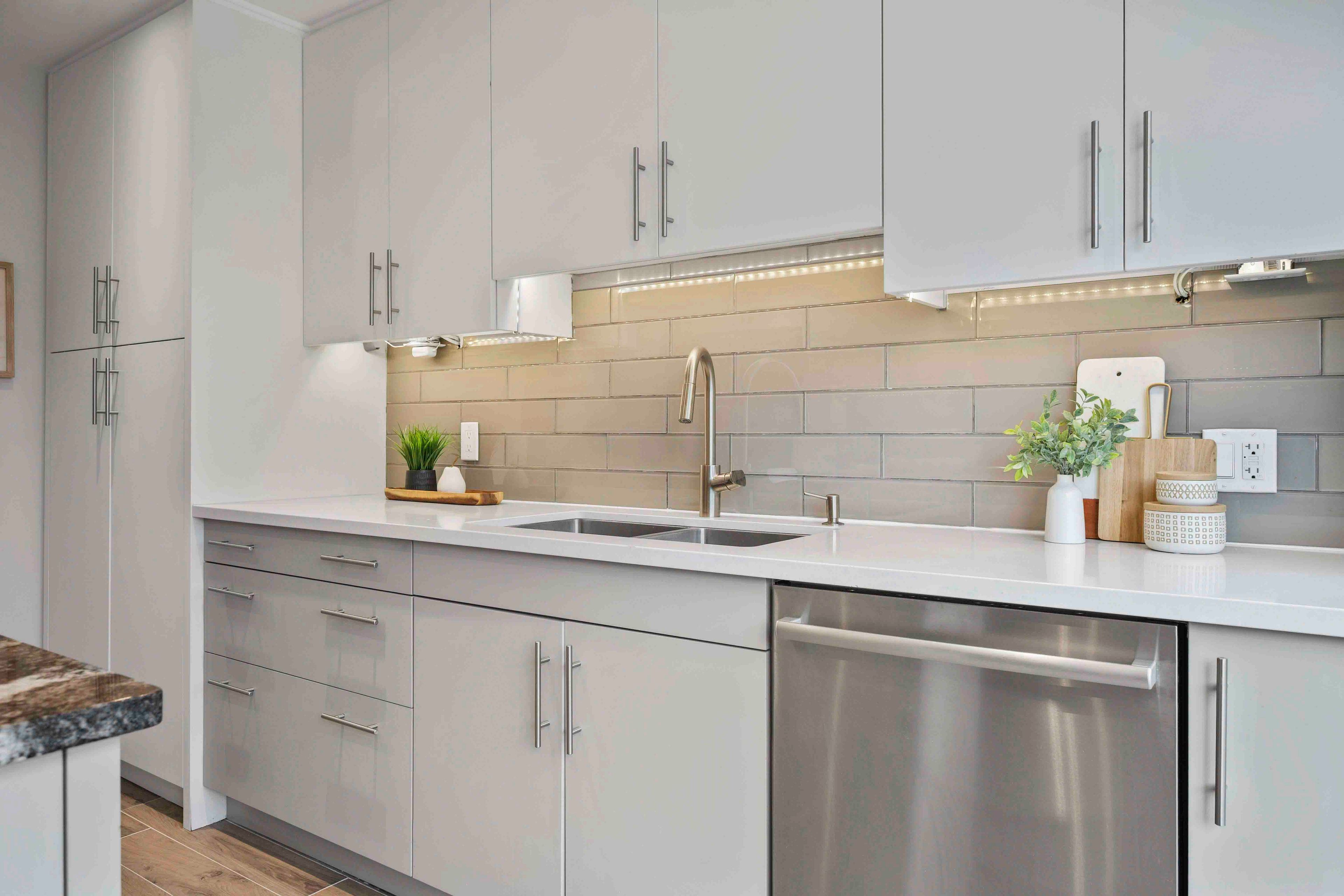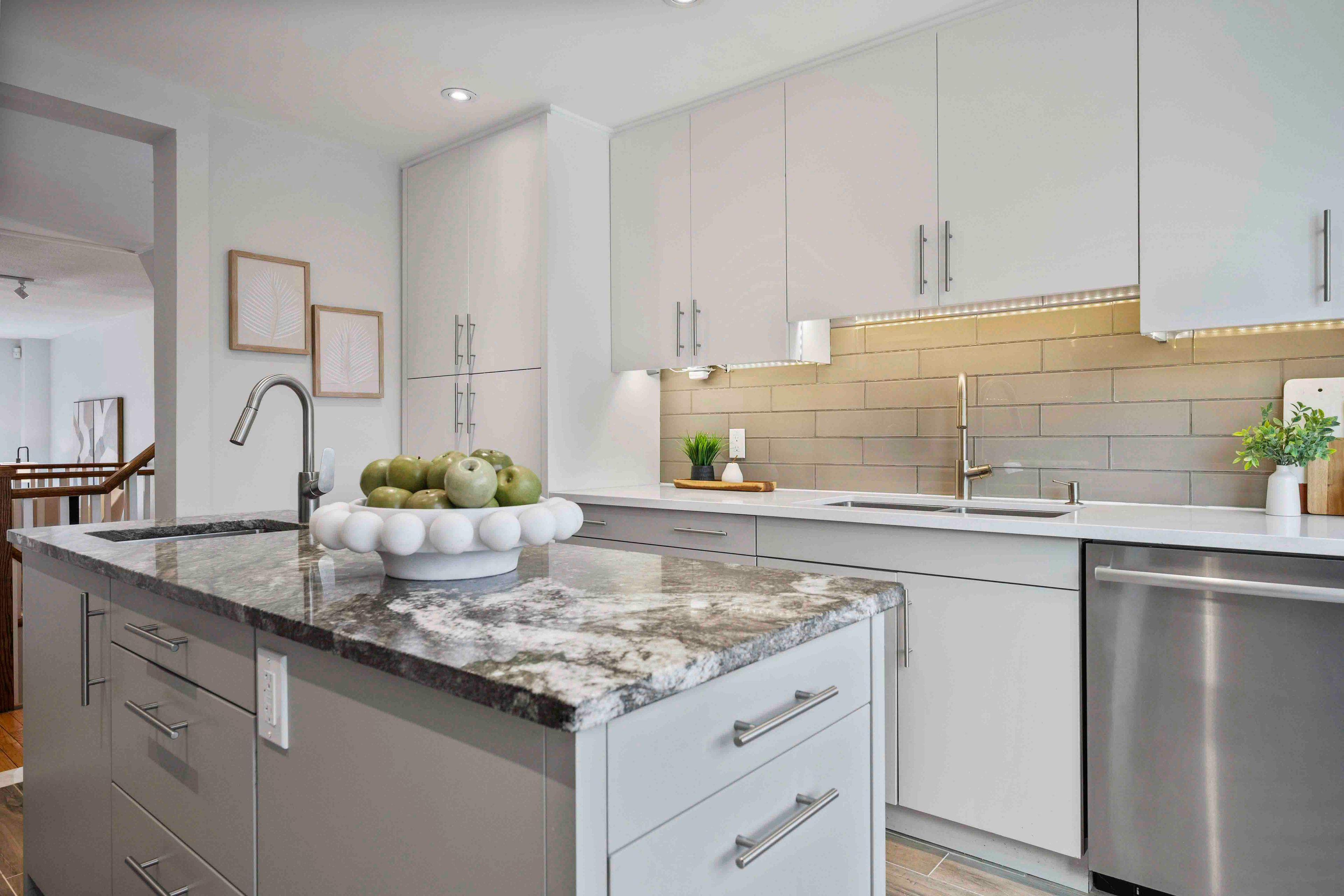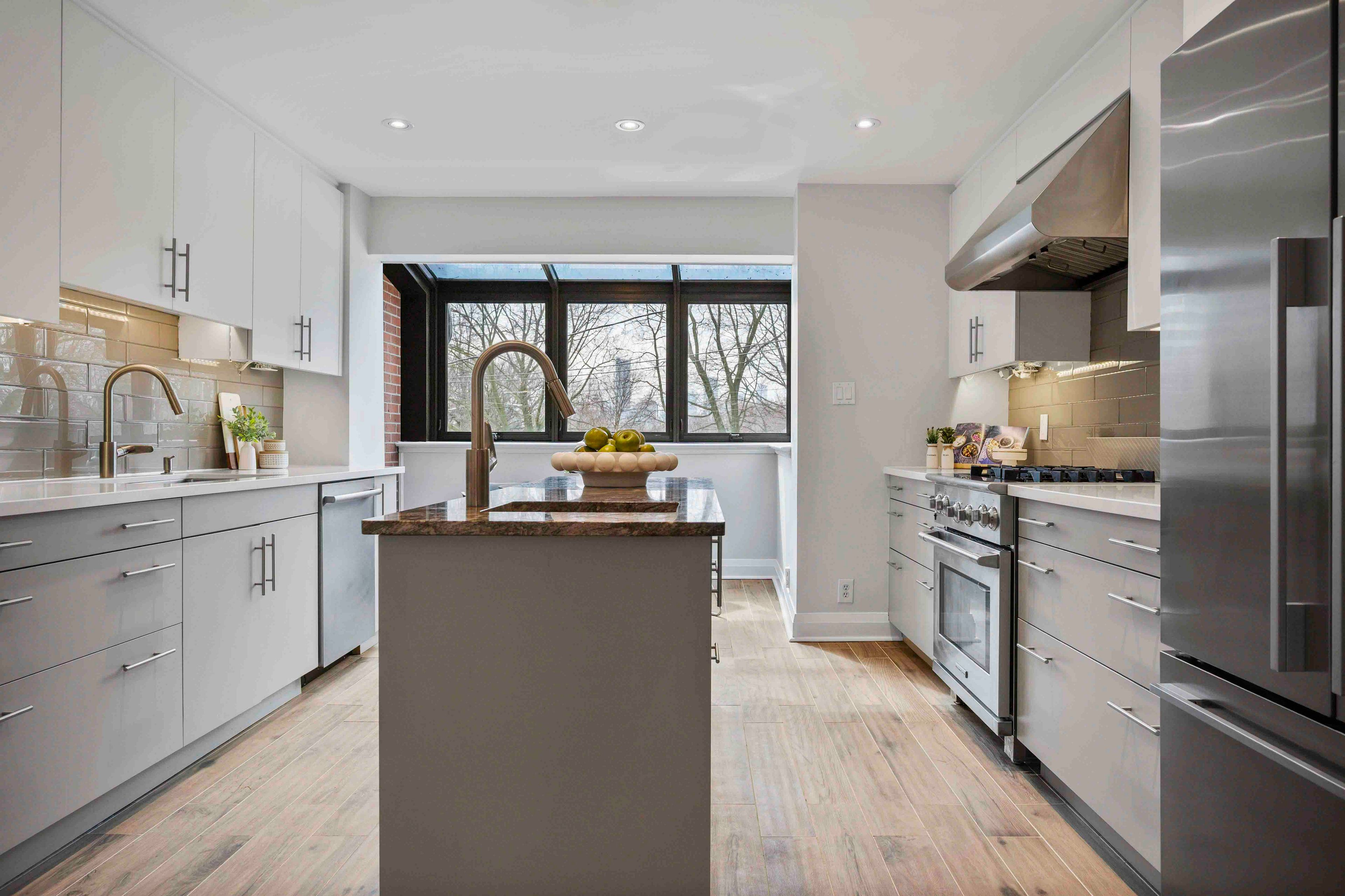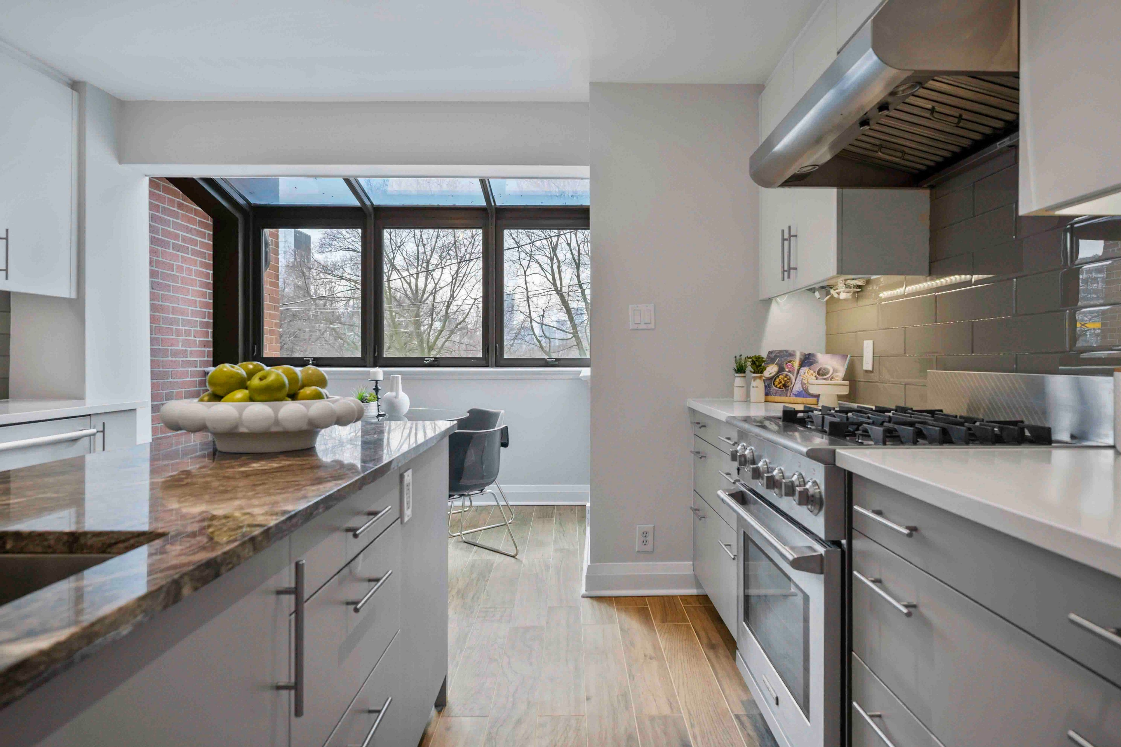• Renovated chef's kitchen with heated floors and spacious eat-in area.