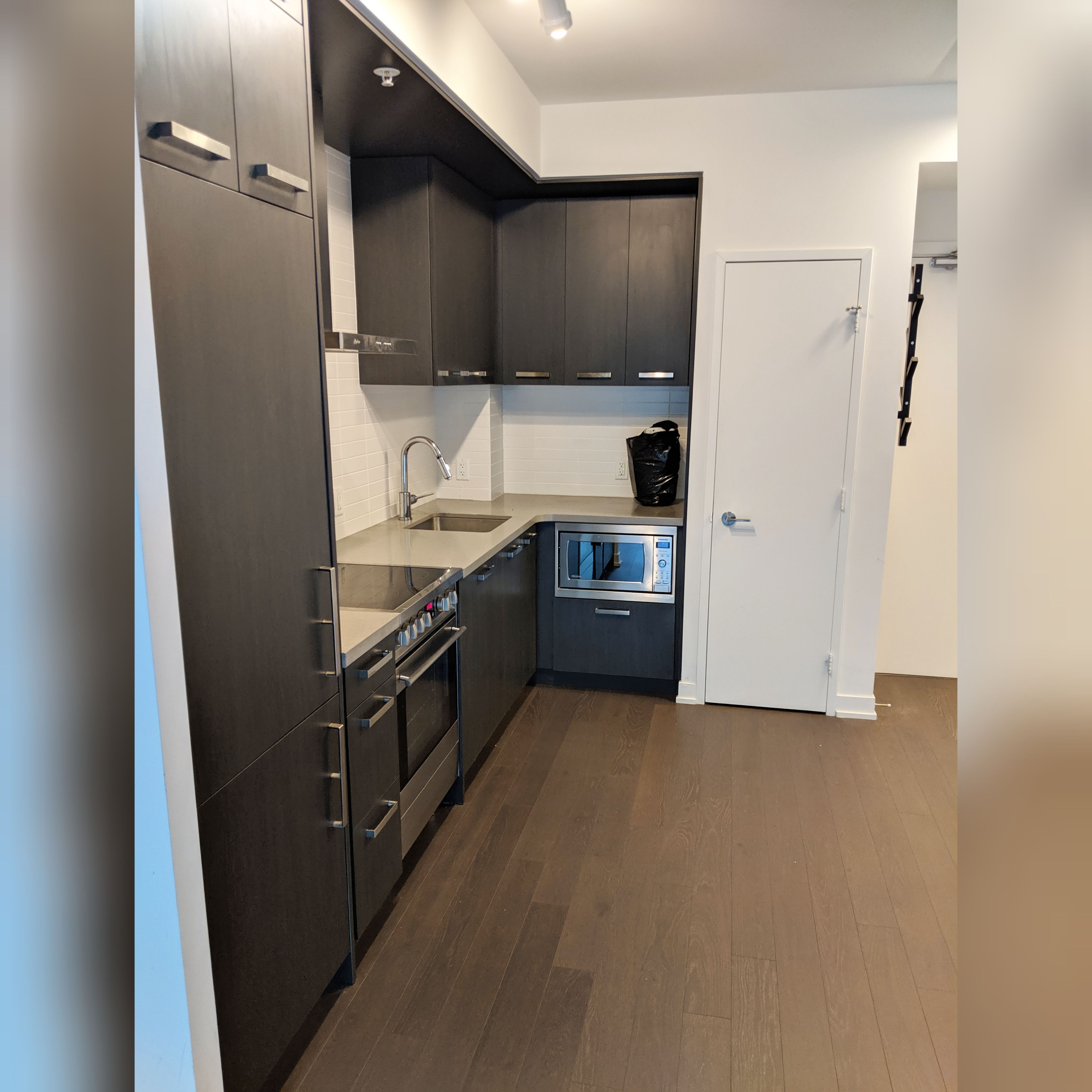 • Modern kitchen equipped with built-in appliances and hardwood floors.