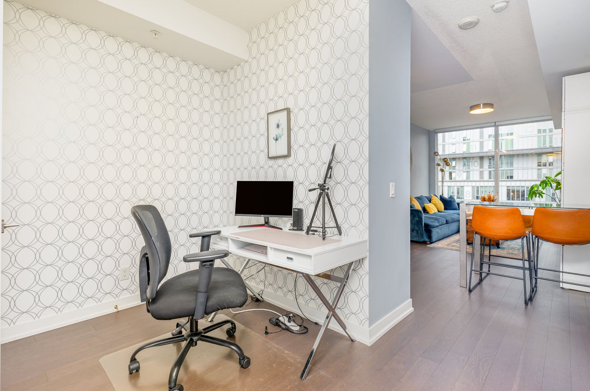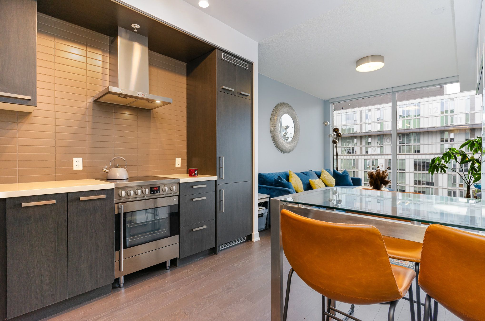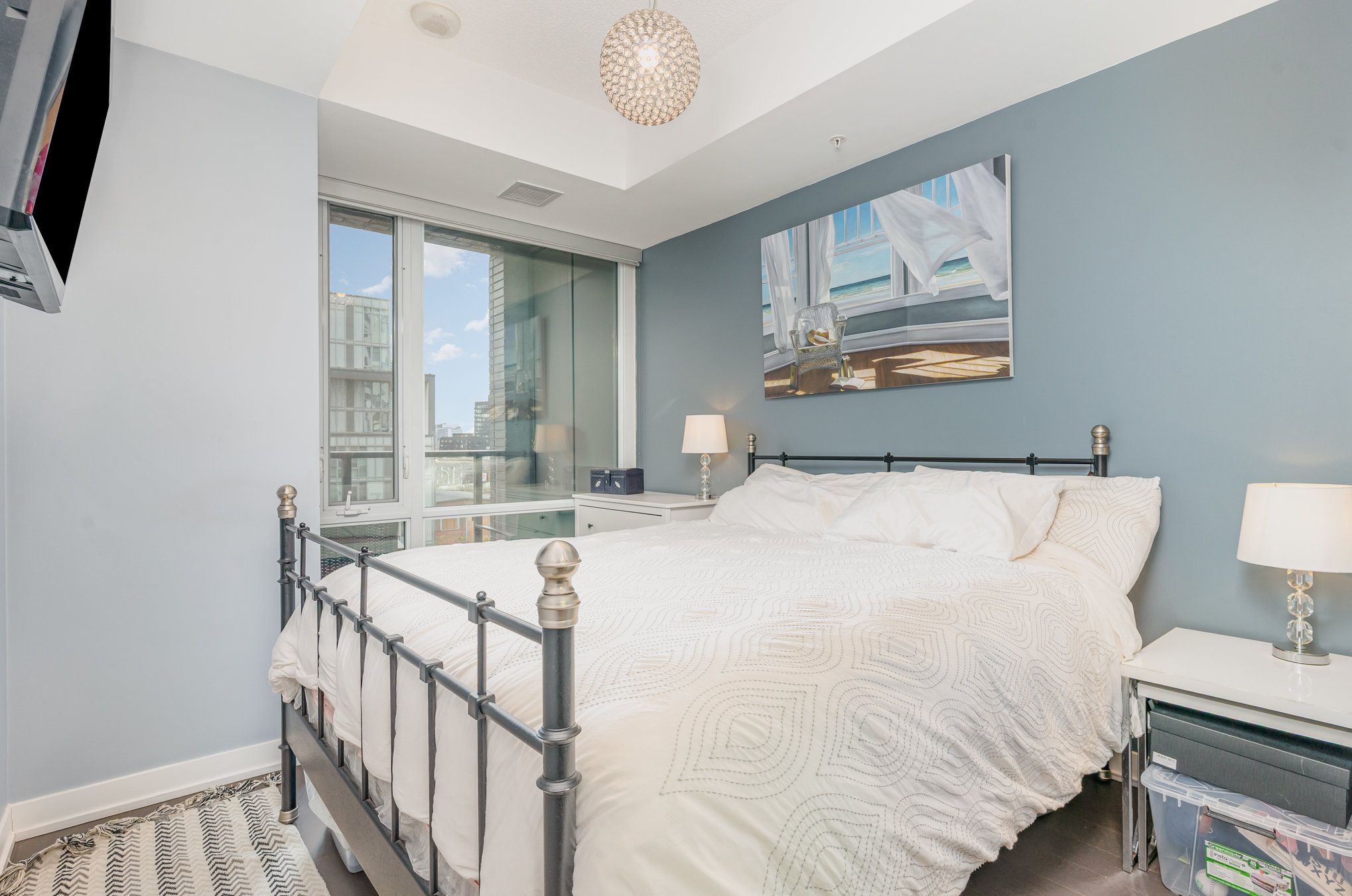 • Bright 1-bedroom + den suite with floor-to-ceiling windows and high ceilings.