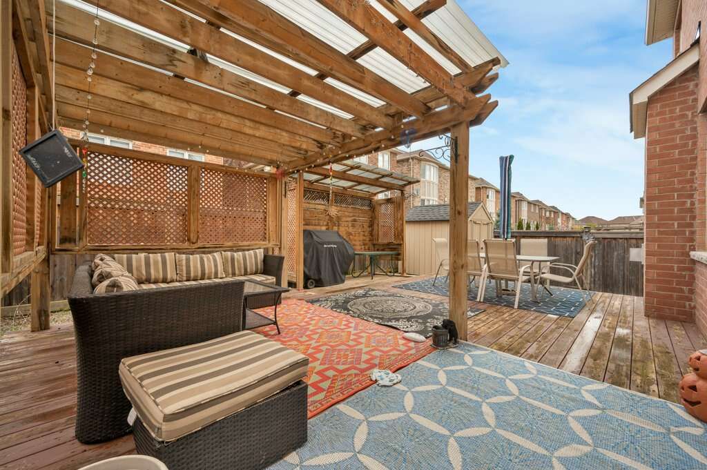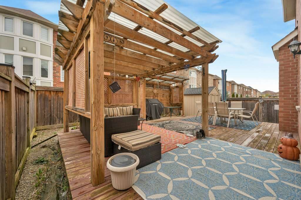 • Backyard includes a wood deck, pergola, and privacy fence.