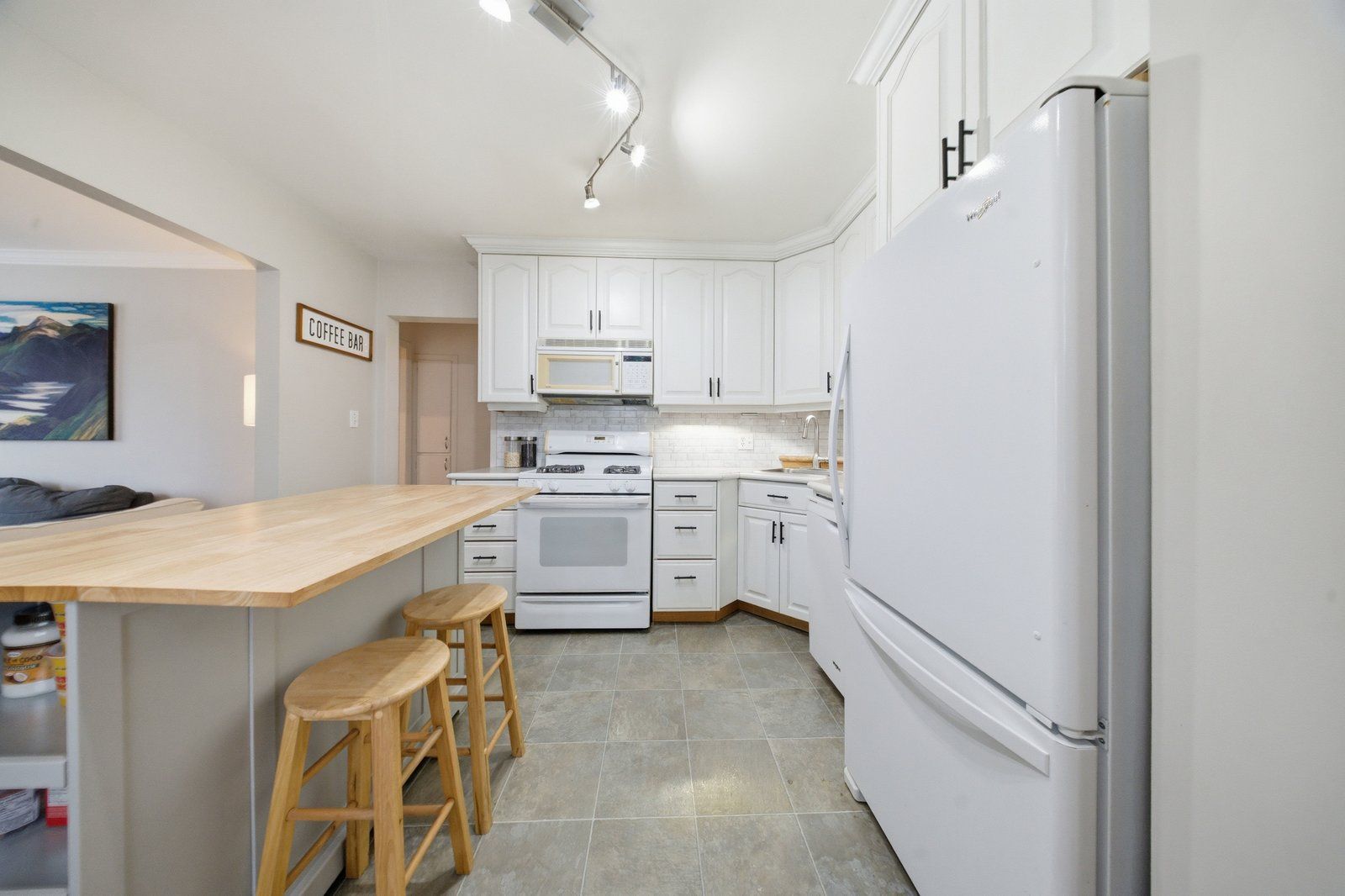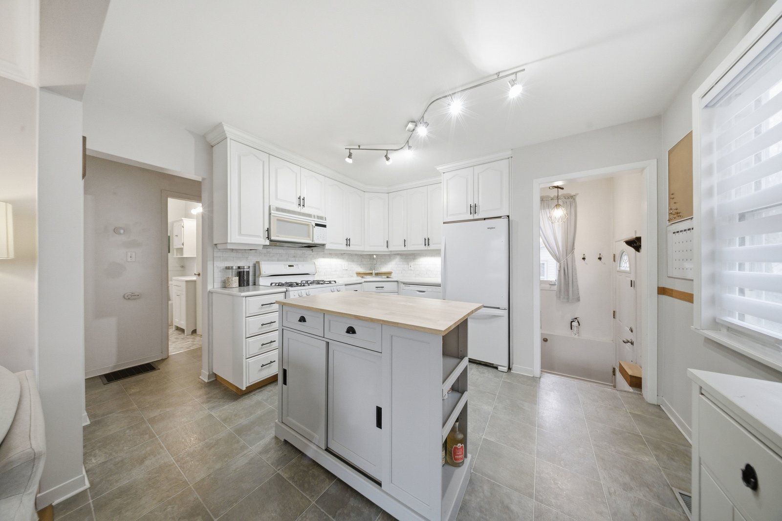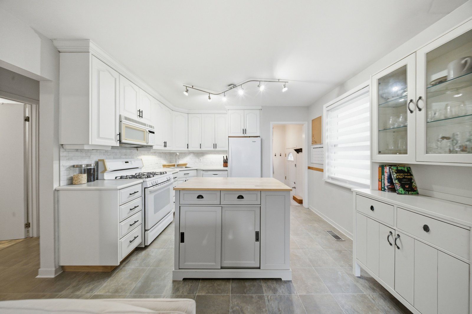 • White cabinetry and gas stove in a spacious kitchen with ample storage.