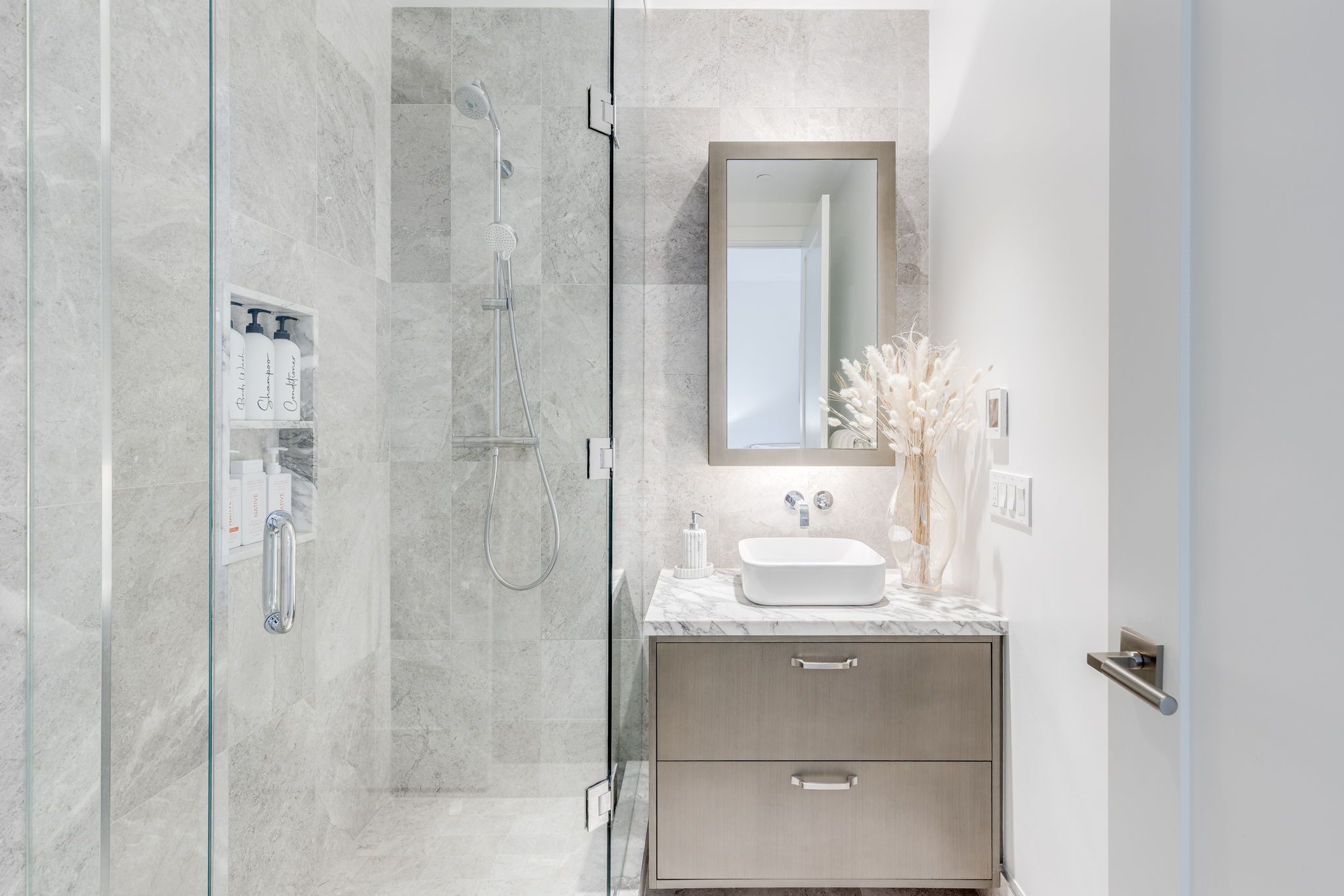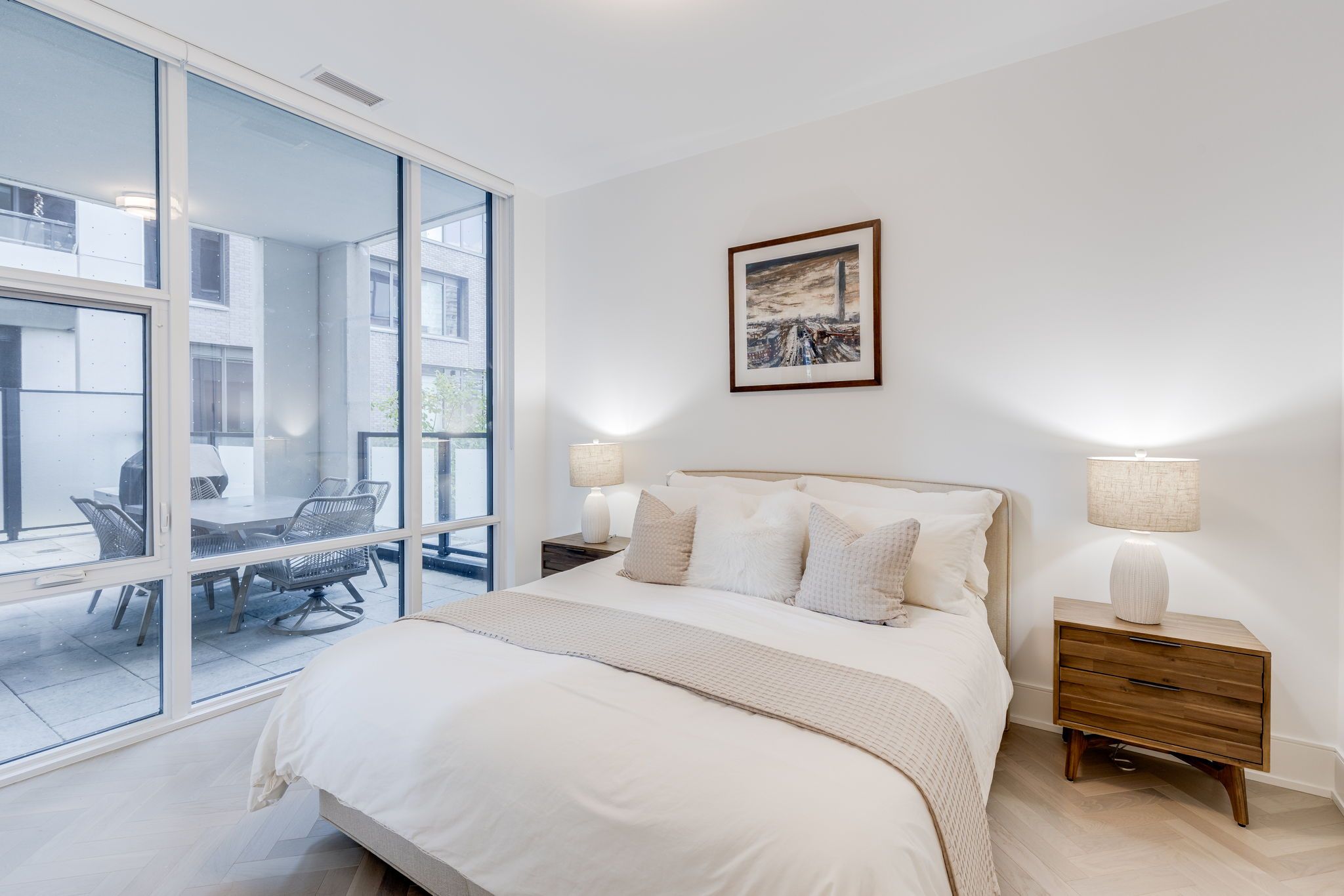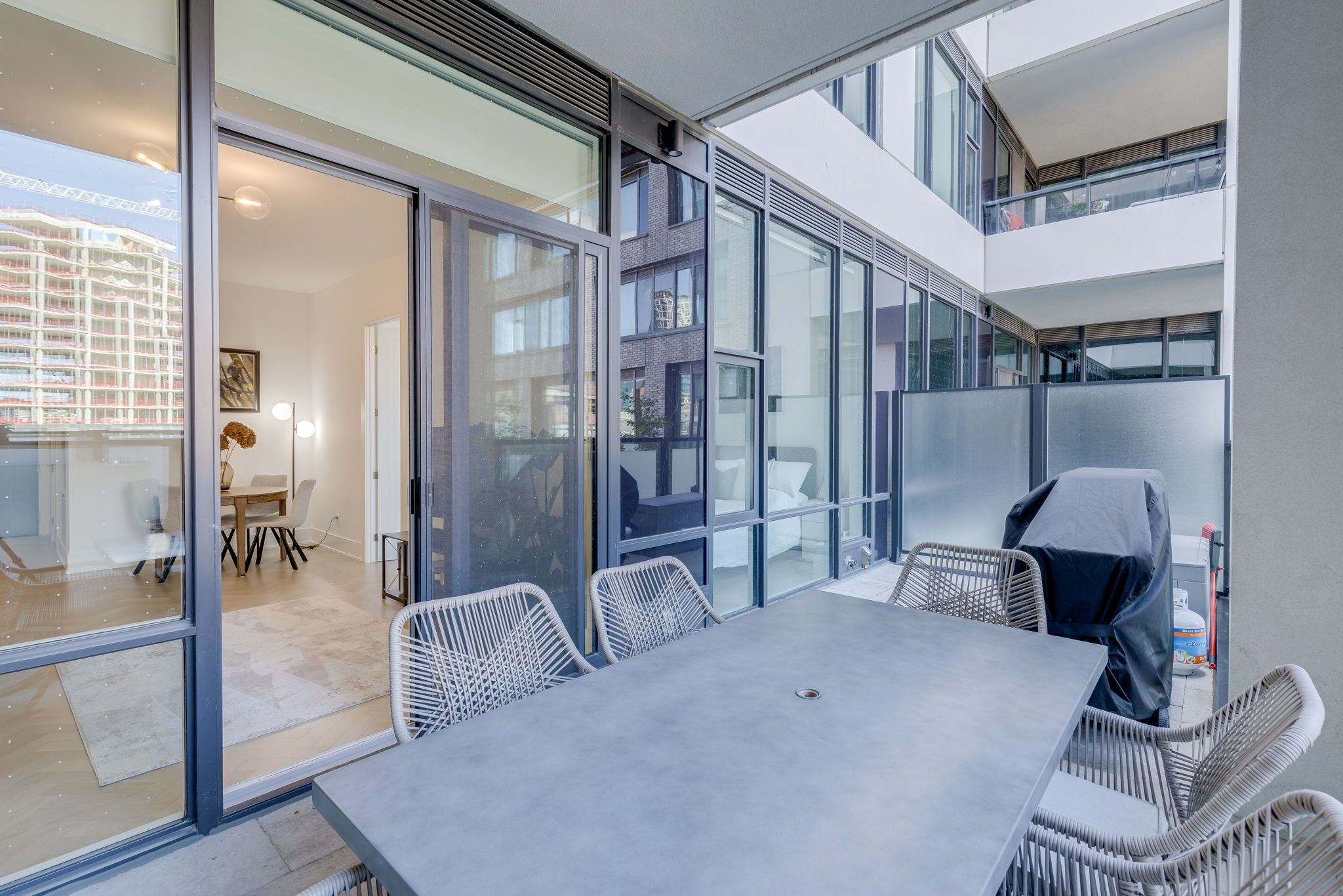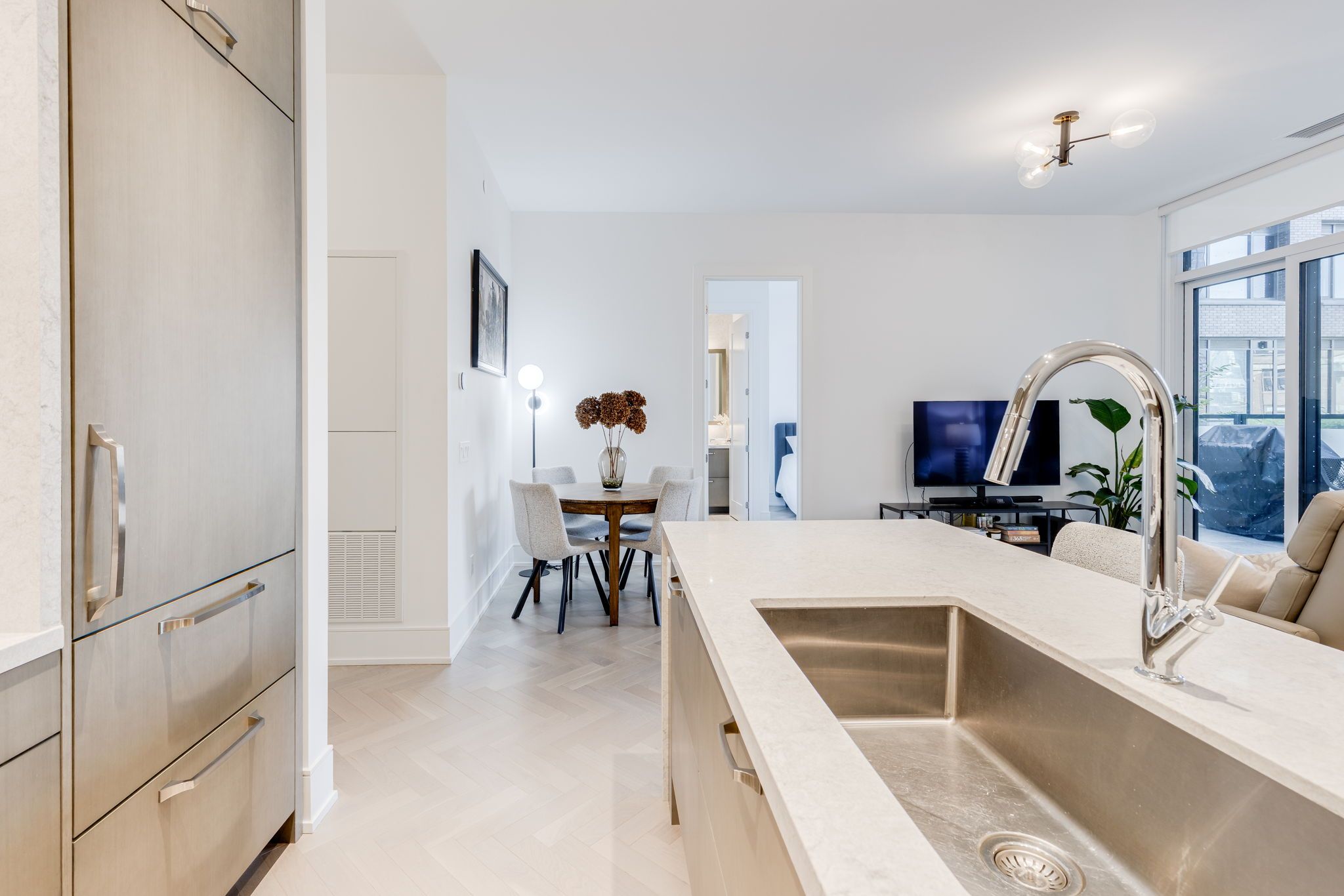 Welcome to the signature series at the well-a boutique luxury address by tridel in the heart of downtown toronto. This exceptional 2-bedroom, 3-bathroom executive residence offers approximately 1,100sq. Ft. Of refined interior living space, framed by floor-to-ceiling windows and soaring10-foot smooth ceilings throughout, enhancing the sense of light, volume, and architectural elegance. Thoughtfully crafted with elevated finishes at every turn, the suite features a gourmet chef's kitchen appointed with upgraded built-in miele appliances, a large breakfast island ideal for entertaining, and contemporary soft-close cabinetry. Herringbone-pattern hardwood floors run throughout the principal rooms, adding texture and warmth. The primary ensuite is enhanced with heated flooring and cascading marble walls, while both bedrooms offer private ensuites-creating a highly functional split-bedroom layout with optimal privacy for residents and guests. The open-concept living and dining area flows seamlessly to a rare 400 sq. Ft. North-facing private terrace complete with bbq gas hook-up and water line-an extraordinary extension of you rliving space for al fresco dining, summer entertaining, or quiet evenings overlooking the promenade. Located on the third floor, enjoy immediate access to world-class amenities including an outdoor swimming pool, landscaped garden with outdoor fireplace, entertainment lounge, private dining lounge, and fully equipped fitness studio. At street level, the well's curated outdoor promenade offers an unparalleled collection of restaurants, cafés, bakeries, bars, food markets, and boutique retail-placing toronto's most vibrant lifestyle destination right at your doorstep. Experience elevated urban living in one of downtown's most prestigious communities.