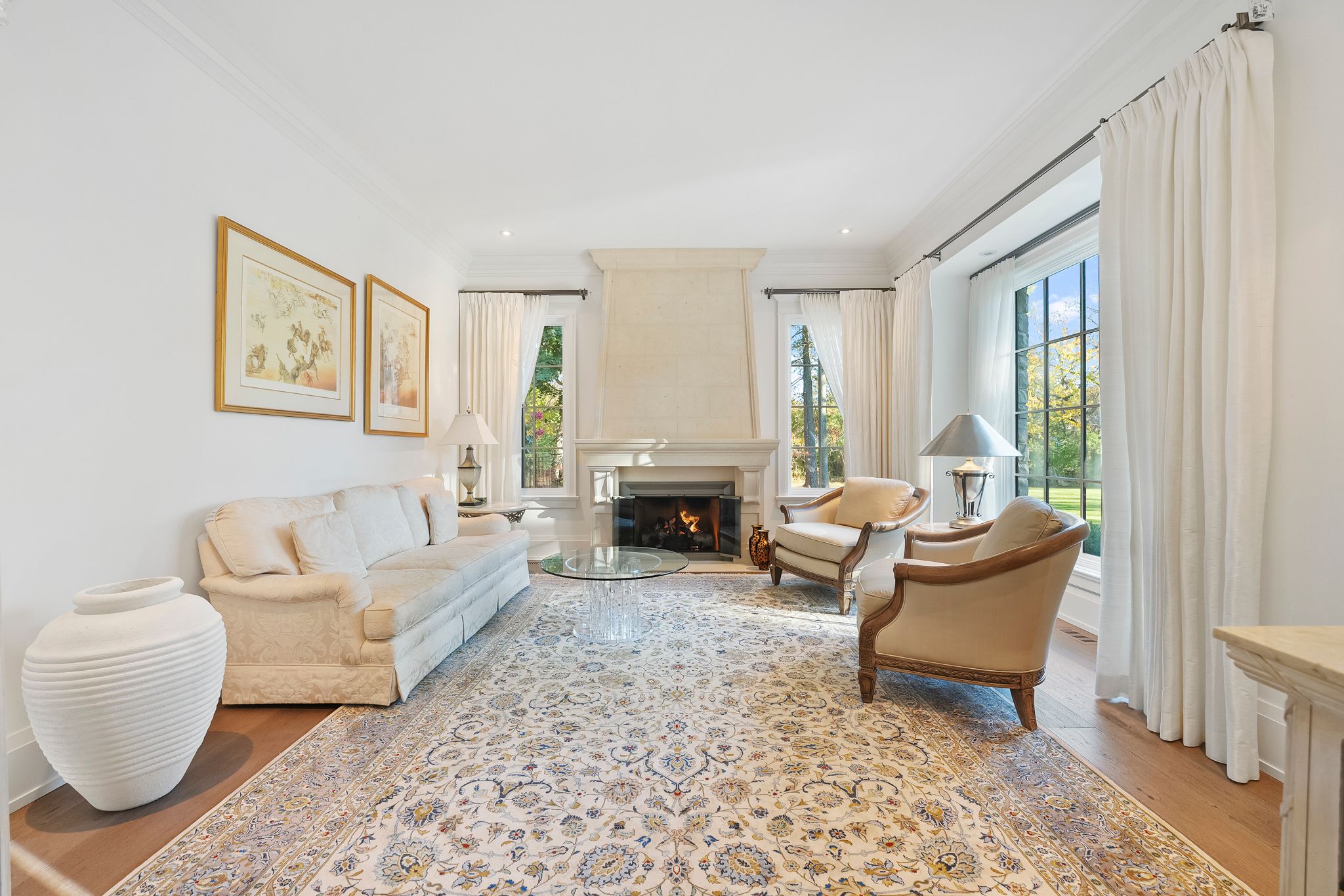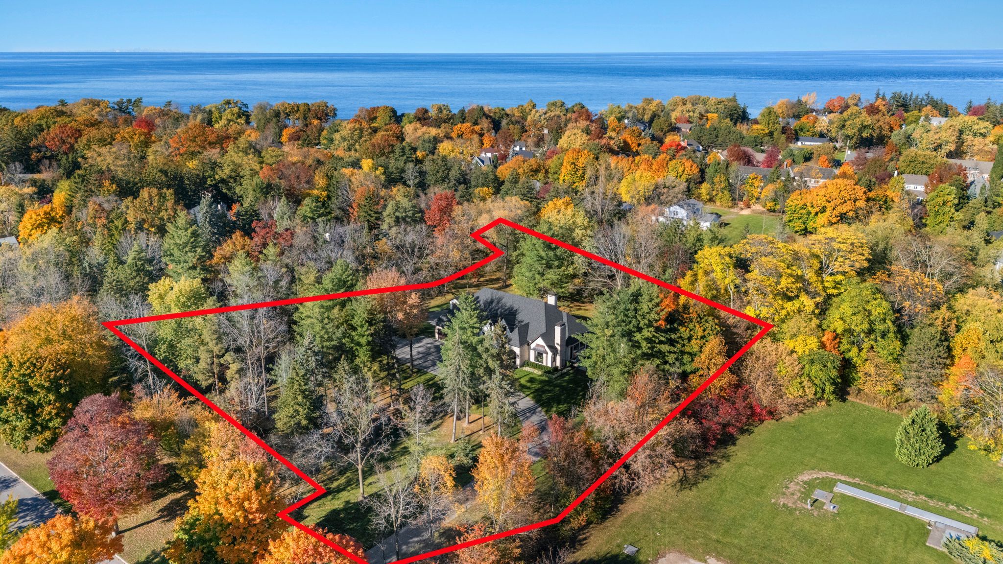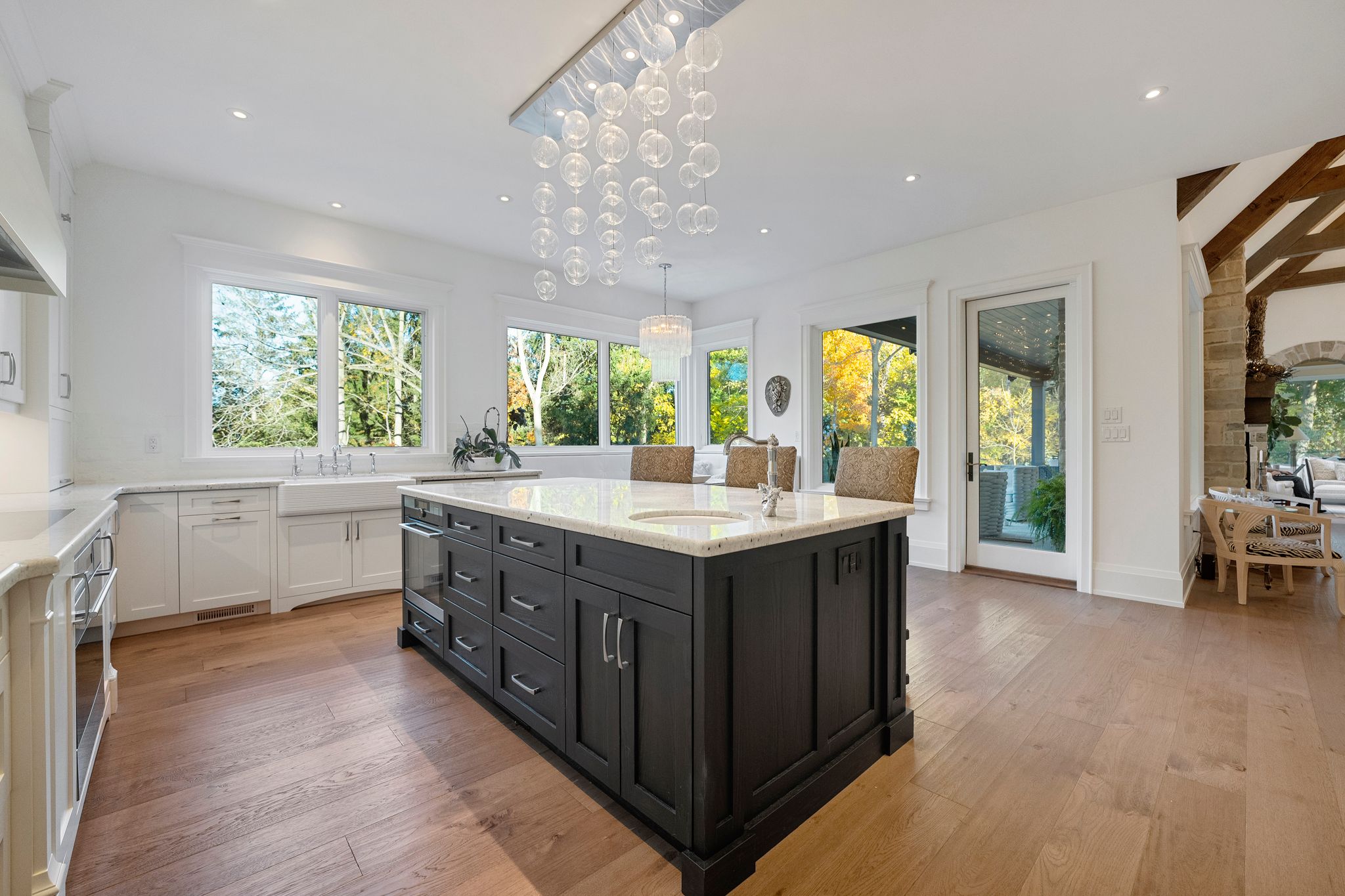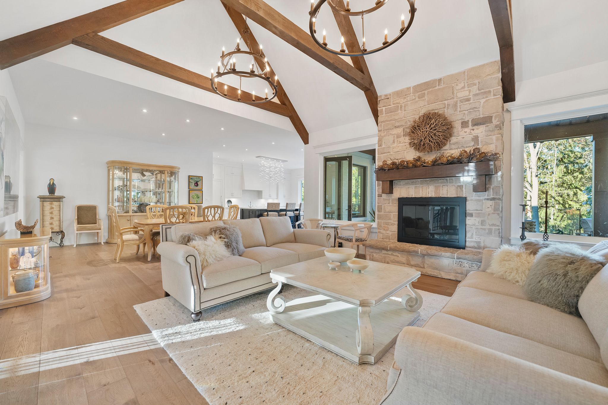 Experience refined living in this exquisite estate nestled in the heart of historic niagara on-the-lake. Set on nearly three acres of lush, wooded grounds, this custom-built home embraces a modern french country aesthetic and offers unparalleled privacy just moments from the lake. Stroll to nearby boutiques, acclaimed restaurants, theatres, and golf courses, and enjoy the vibrant lifestyle that makes this community so sought-after. Step through an impressive stone entryway into a grand foyer illuminated by sparkling crystal chandeliers, immediately setting a tone of sophistication. The formal living room invites cozy gatherings around a beautiful cast stone gas fireplace, while the expansive great room captivates with vaulted ceilings, exposed beams, and abundant natural light streaming through oversized windows. A charming sunroom offers a peaceful sanctuary for morning coffee, and the upper deck complete with a gas fireplace creates a perfect backdrop for intimate evenings under the stars. The gourmet kitchen is designed to inspire culinary creativity, featuring granite countertops, premium appliances including a sub-zero refrigerator and wolf induction cooktop, and a generous walk-in pantry. The main-level primary suite provides a serene retreat with spacious walk-in closets and a spa-inspired ensuite adorned with luxurious finishes. The lower level reveals an entertainers paradise with a family lounge, direct access to a pool deck, sauna, hot tub, and a temperature-controlled wine cellar. Four additional ensuite bedrooms ensure comfort and privacy for family and guests alike. Impeccably landscaped gardens surround the estate, offering a stunning outdoor setting ideal for entertaining or quiet relaxation. This extraordinary home seamlessly blends timeless elegance with modern comforts, making it truly one of a kind in niagara-on-the-lake