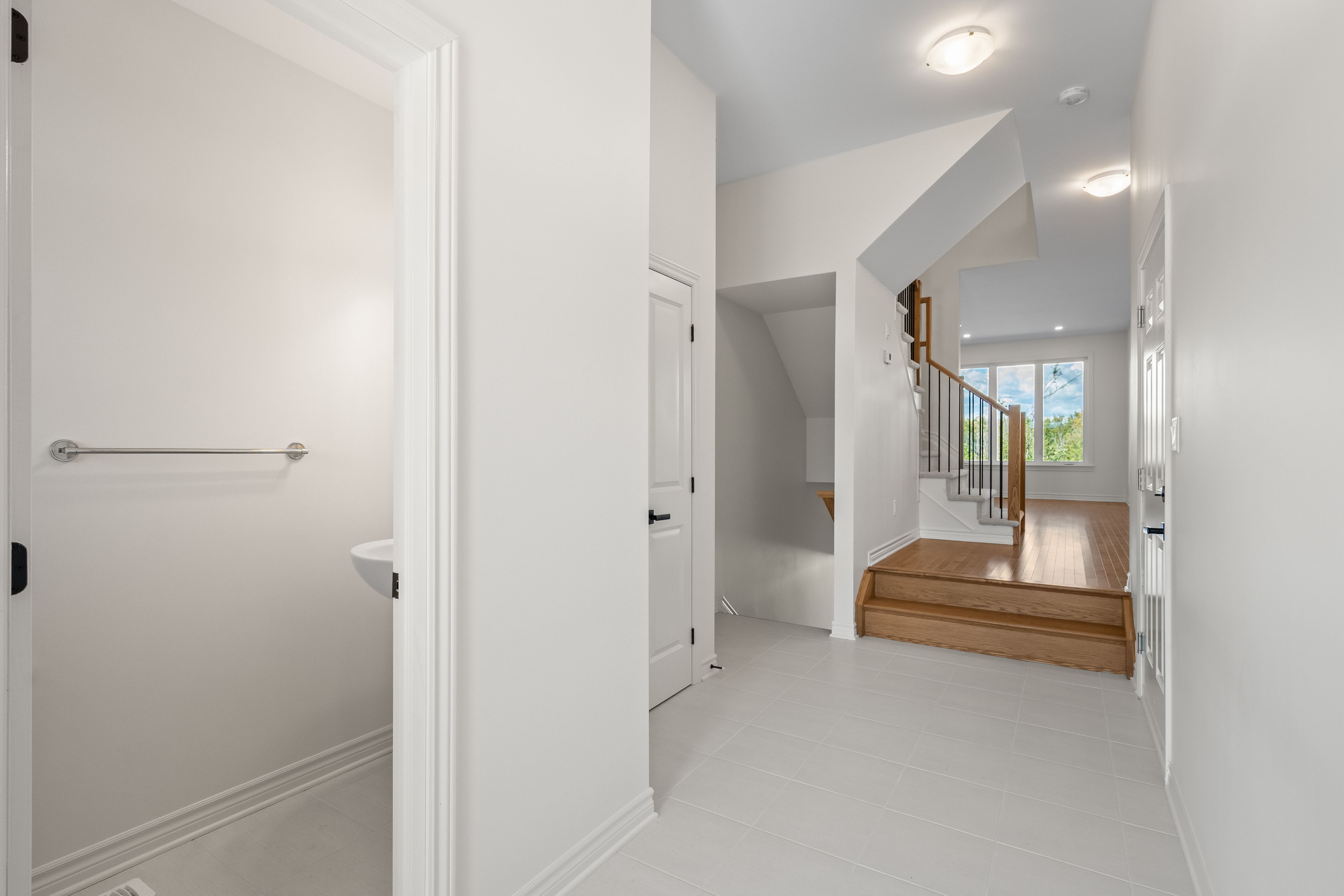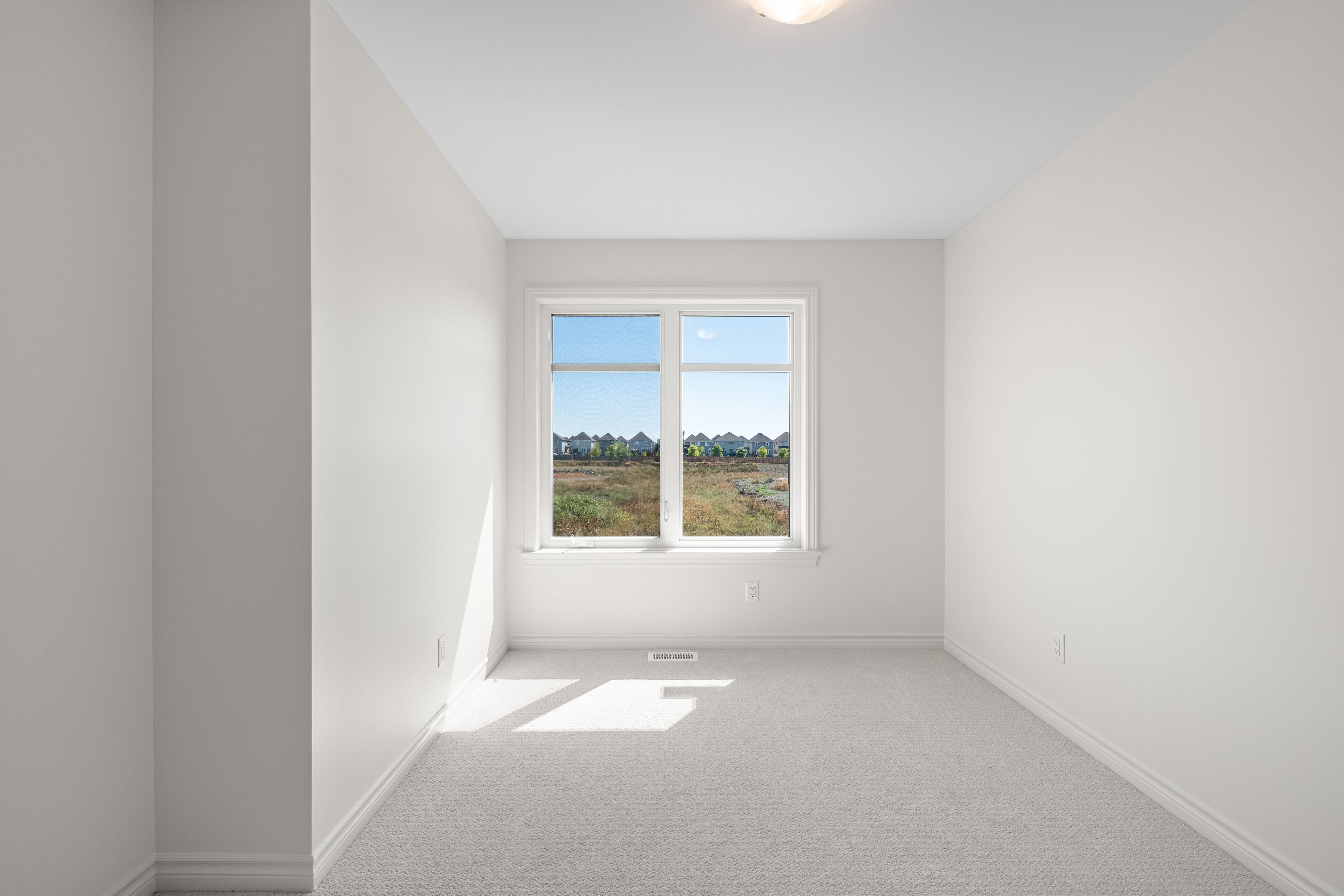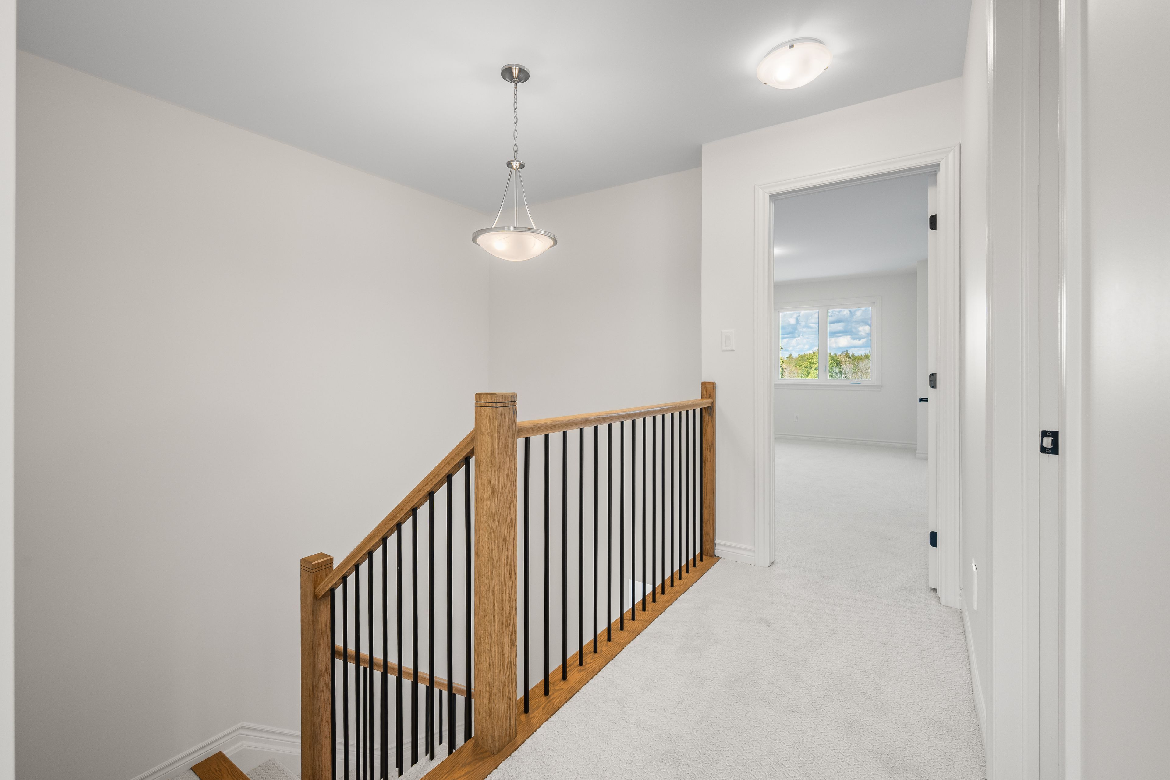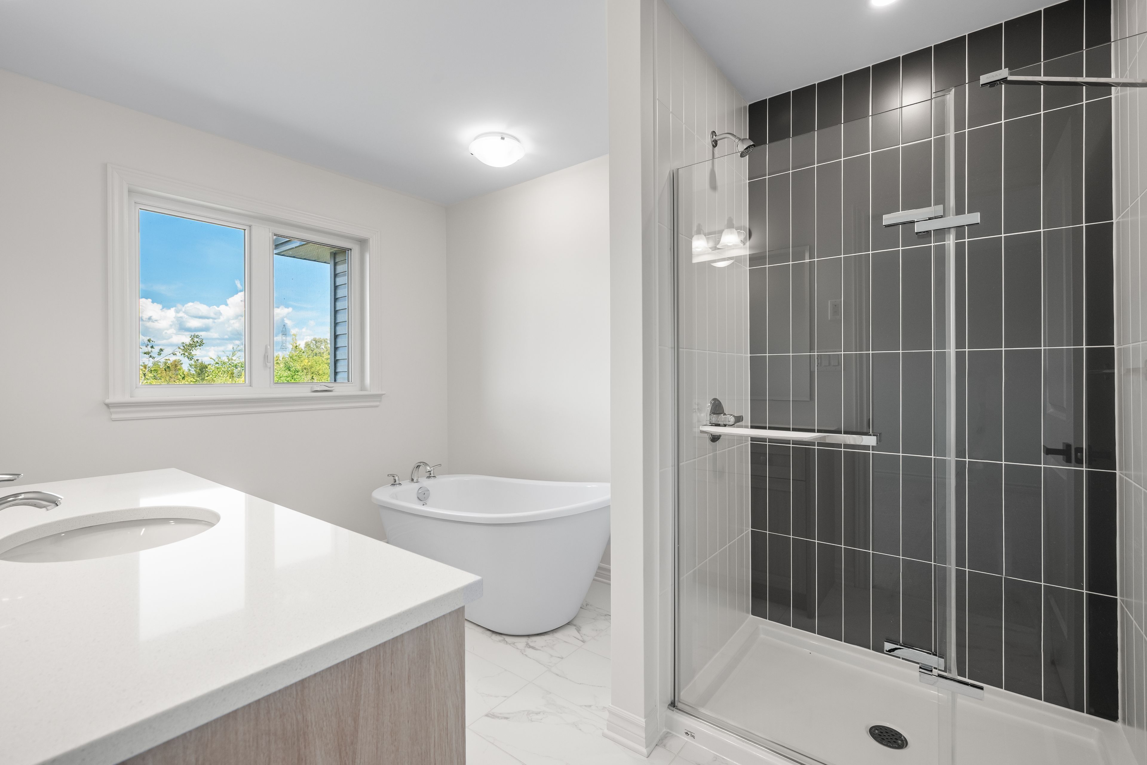 The abbey offers 1,855 sq ft of stylish living in kingstons west-end woodhaven community. The main floor showcases maple hardwood, a modern kitchen with quartz counters, white shaker cabinetry, an upgraded sink, and a spacious walk-in pantry. A cozy gas fireplace anchors the living area. Upstairs, the primary suite includes a luxurious 4-piece ensuite with a freestanding tub and a walk-in tile-and-glass shower. The home also features a finished walkout basement with a rough-in for a future bathroom, giving you plenty of extra living space and flexibility. Energy star certified for efficiency, this home is close to the invista centre, cataraqui centre, a new elementary school, parks, and a planned 14-acre community park.