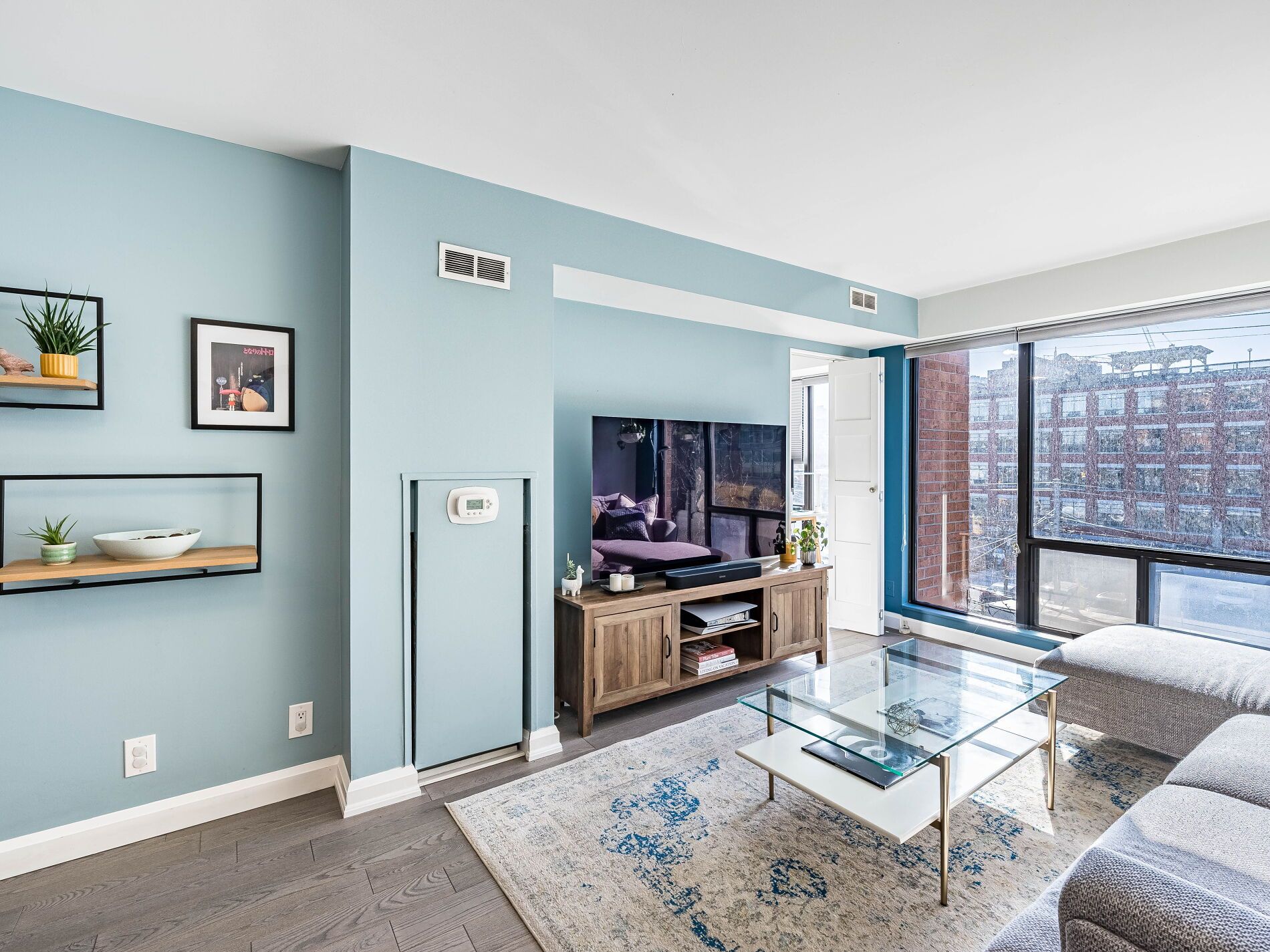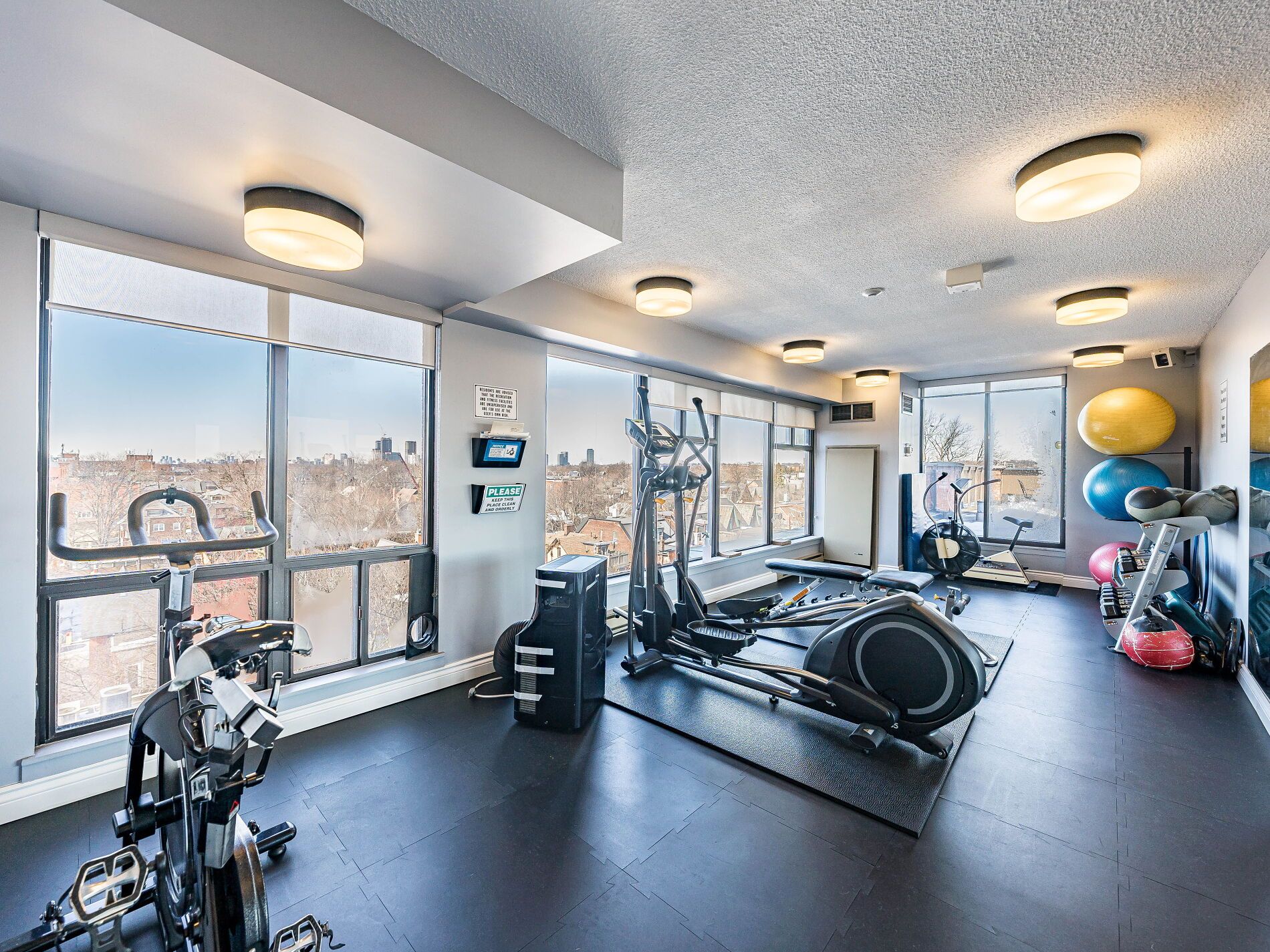 • Small building with gym, party room, and rooftop deck for relaxation.