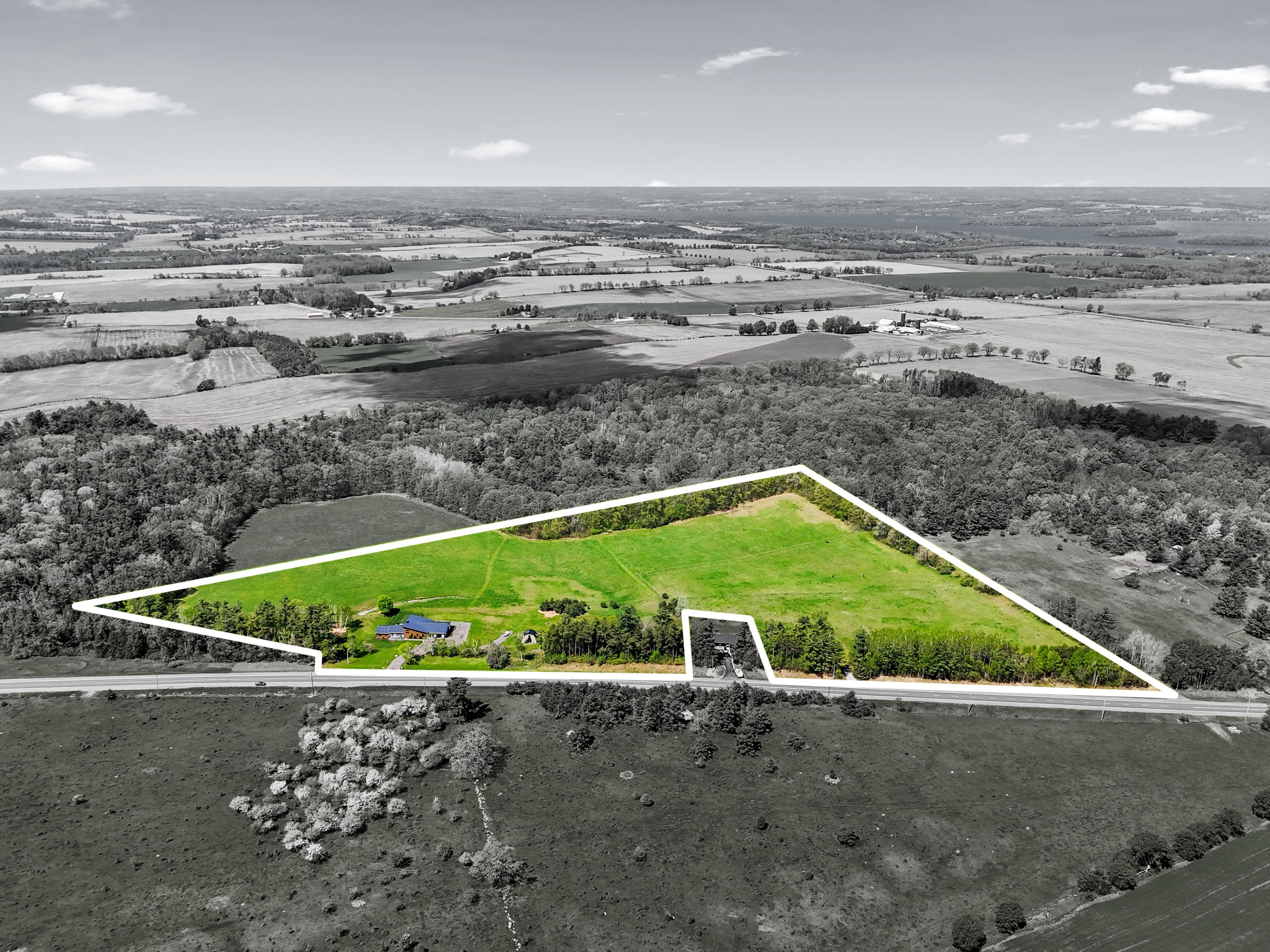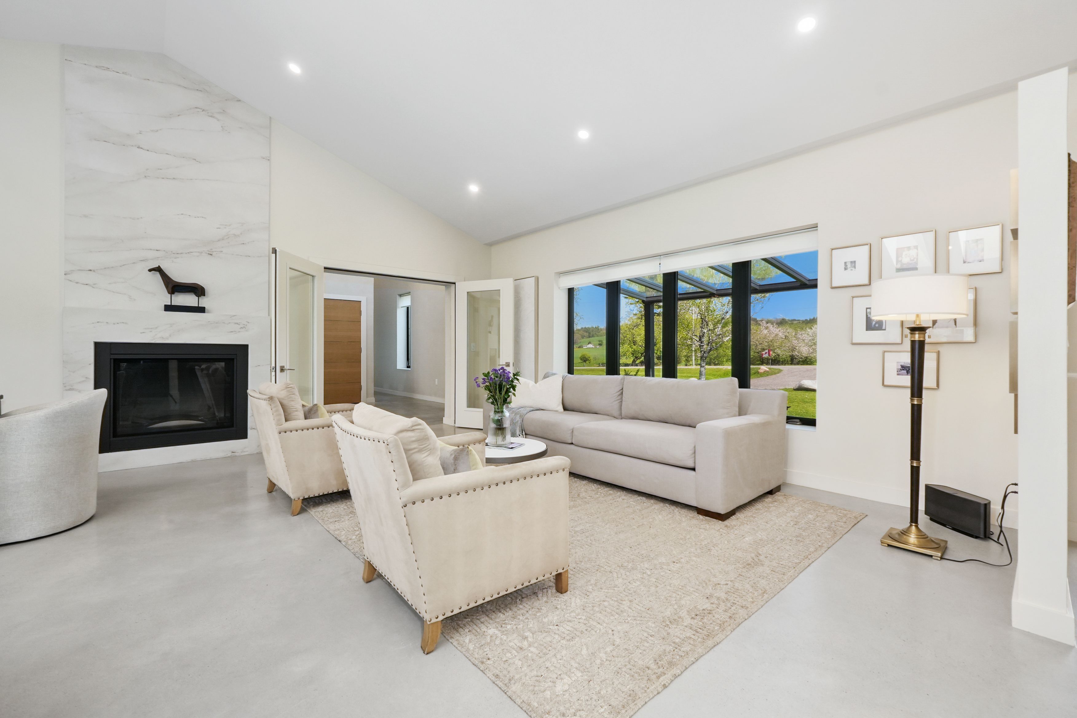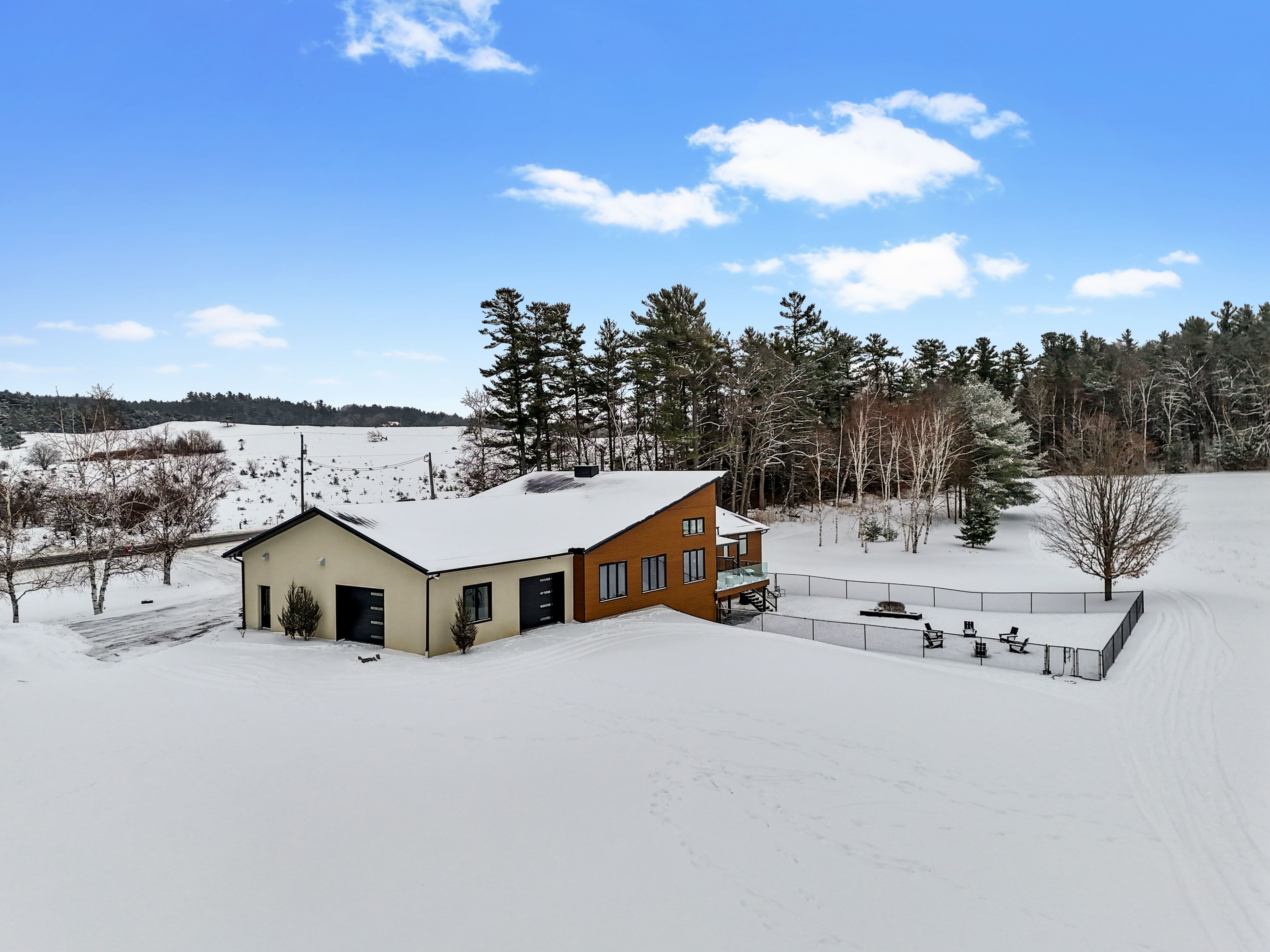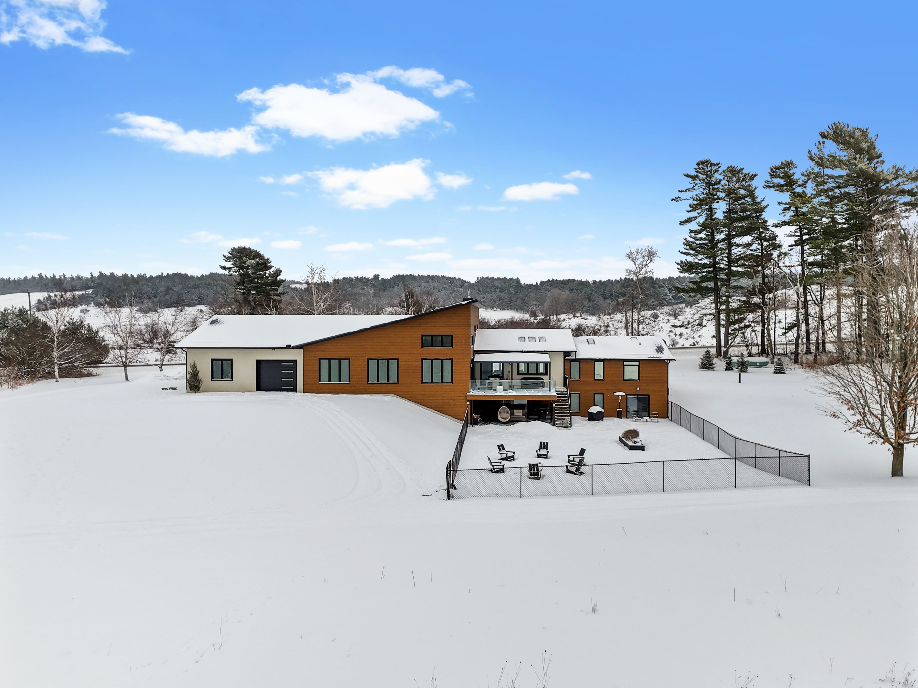 Set on a sprawling 23-acre estate, this striking modern residence exemplifies the perfect balance between contemporary elegance and rural serenity. Every detail has been thoughtfully curated, blending sleek architectural design with high-performance construction, including efficient icf walls and radiant heated concrete flooring. Step into a grand, open-concept living area defined by cathedral ceilings and a dramatic wall of windows. A double-sided napoleon propane fireplace anchors the space, connecting the living room to a sophisticated dining area adorned with modern lighting and walkout to the second-level deck ideal for outdoor entertaining. Sunlight pours into the kitchen through oversized windows and skylights, offering breathtaking views of the rolling countryside beyond and showcasing top-tier jenn-air appliances, striking dekton countertops and a waterfall island with a breakfast bar. Resort-style living awaits in the private attached oasis. A 14x24 heated indoor saltwater pool, soaring 20-foot ceilings, expansive windows, a hot tub, and space for a lounge or home gym create an oasis-like experience, ideal for year-round relaxation and entertaining. The primary suite is a tranquil retreat featuring a walk-in closet and spa-inspired ensuite with dual vanity, freestanding soaker tub, and glass shower enclosure with steam shower. An additional bedroom and two bathrooms round out the level. The finished lower level adds flexible living space, including a sprawling bedroom suite with sitting area, semi-ensuite bath, and walkout to a covered patio. A massive recreation room with a walk-in closet offers potential for a future fourth bedroom. Enjoy a lower covered patio area, fenced yard, and firepit area, perfect for summer nights under the stars. Additional highlights include a radiant heated 4-car garage and a 16x24 barn for versatile use. This one-of-a-kind property is the pinnacle of modern rural luxury. Just under 15 minutes to cobourg and highway 401.