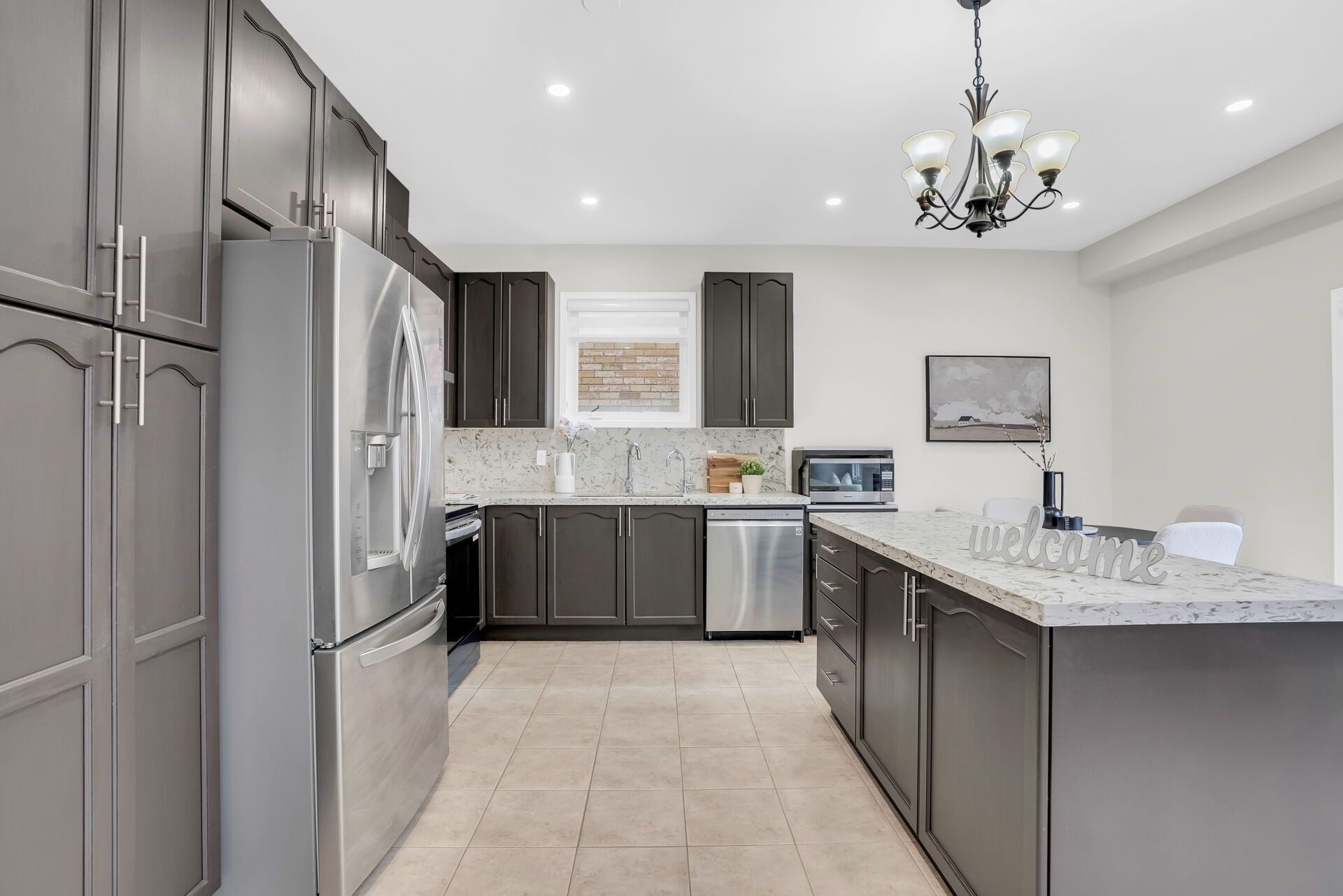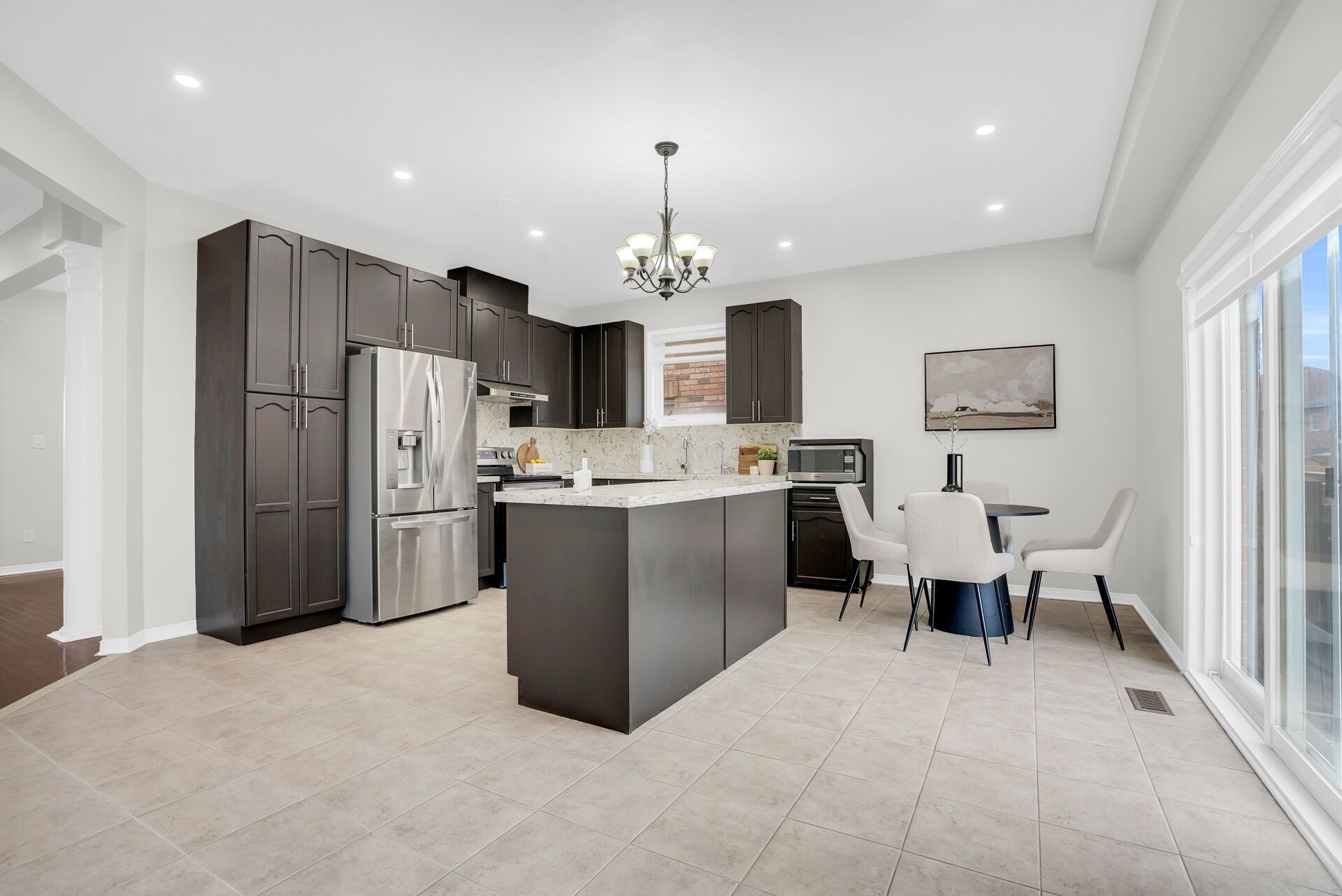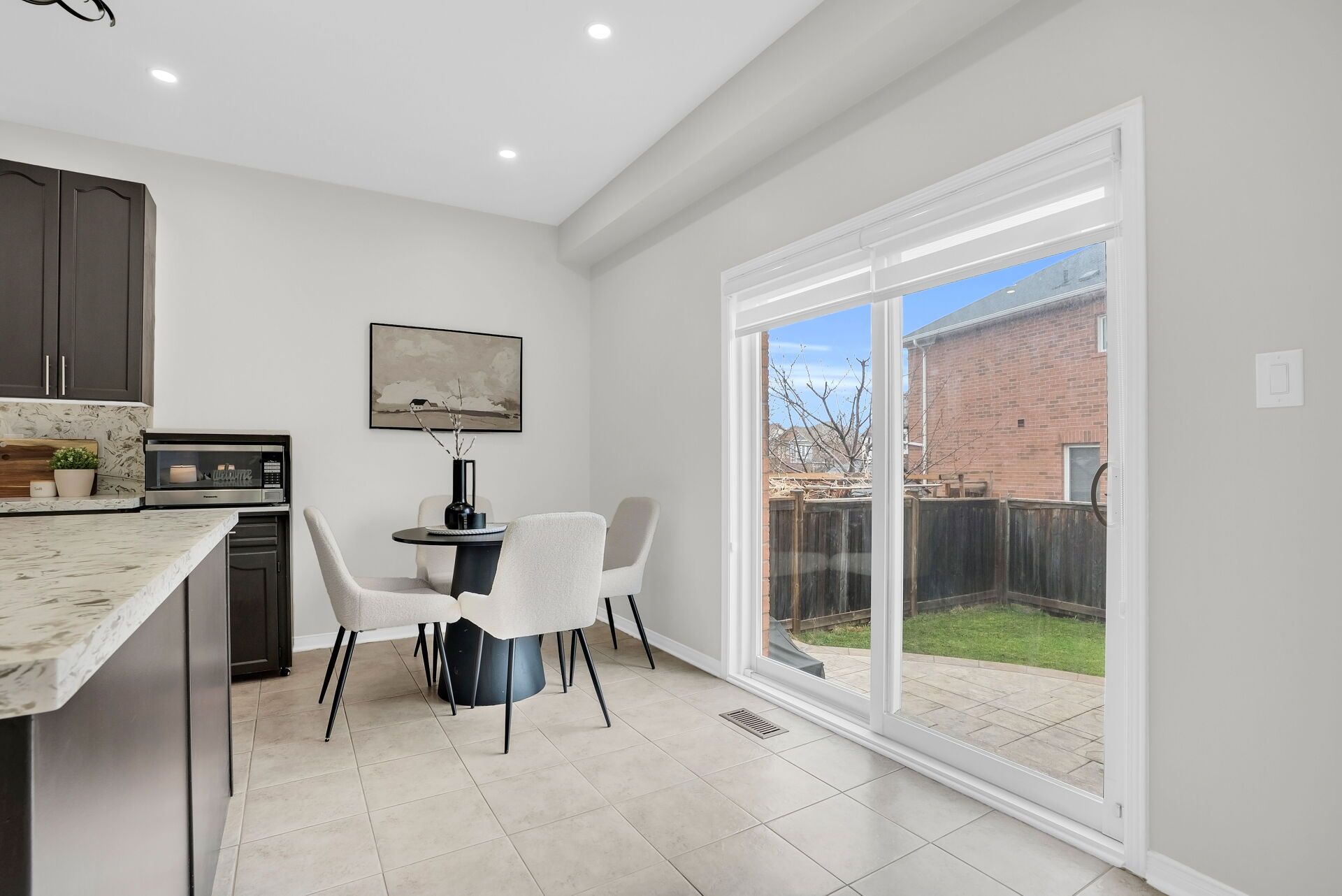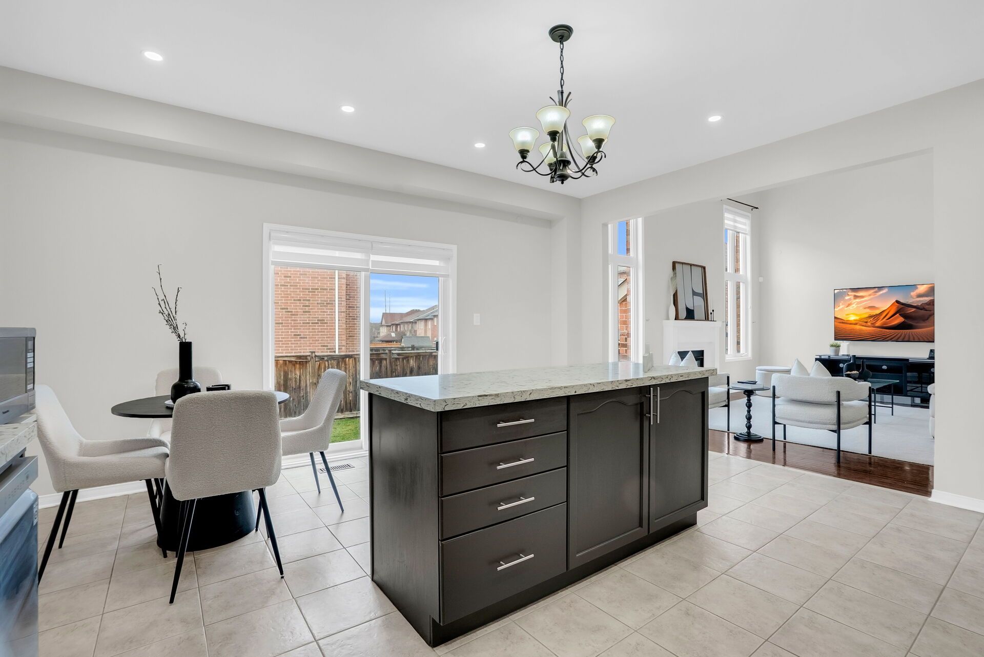 • Open-concept kitchen with modern finishes and a walkout to a large backyard.