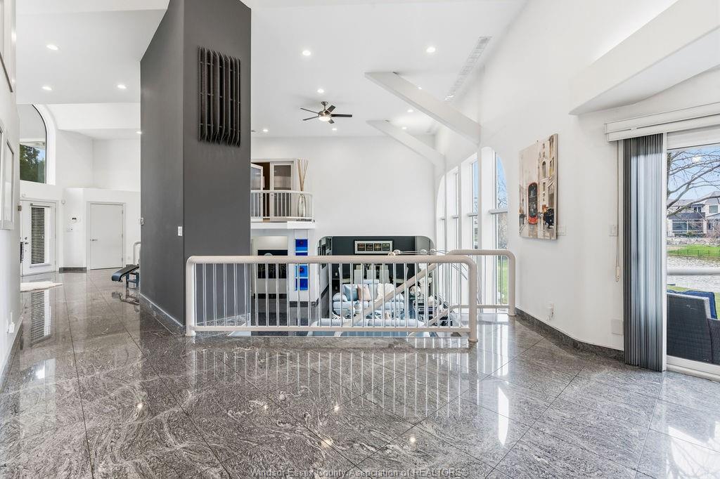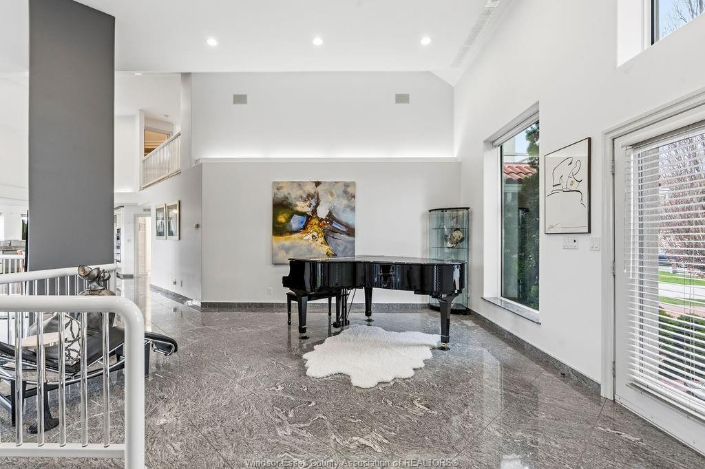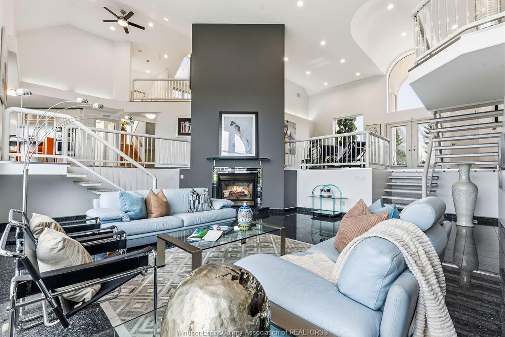 • Dramatic sunken living room with floor-to-ceiling windows and fireplace.