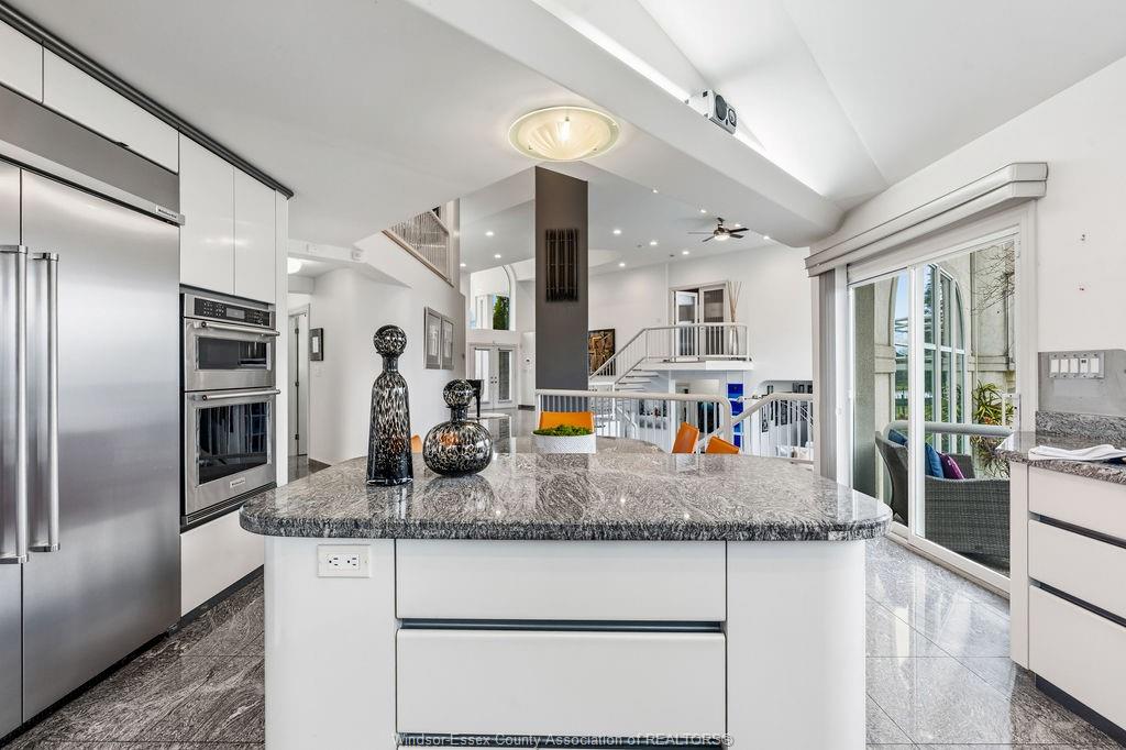 • Upscale kitchen with stainless steel appliances and granite countertops.