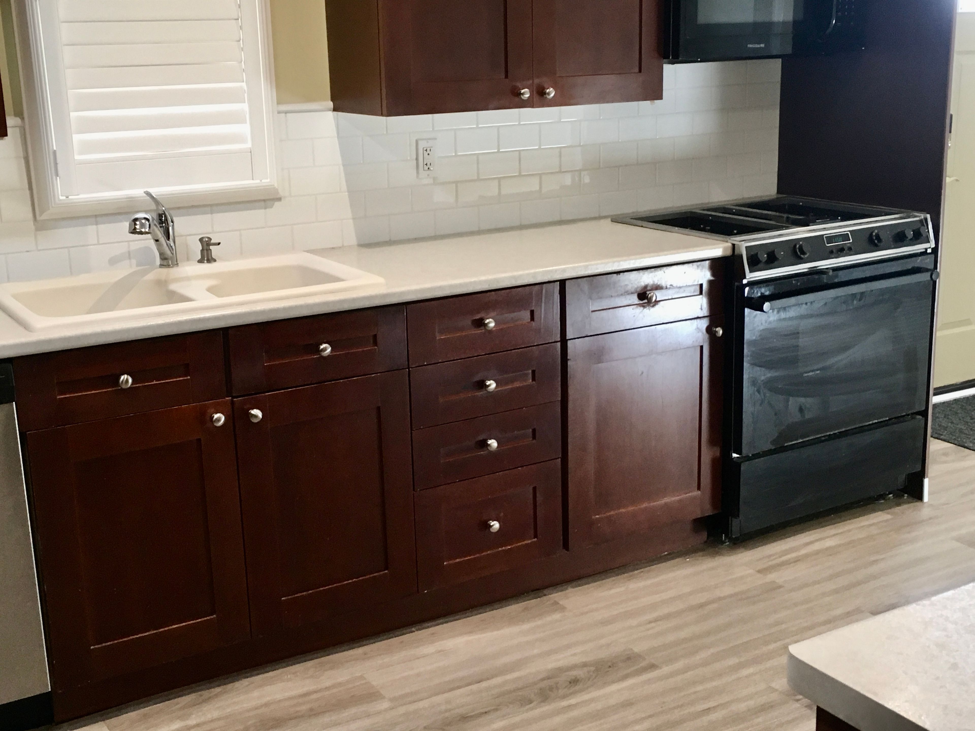 • Mahogany kitchen with plenty of cabinets and built-in appliances for easy organization.