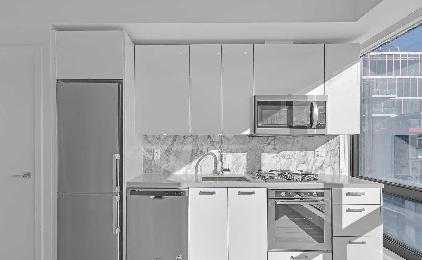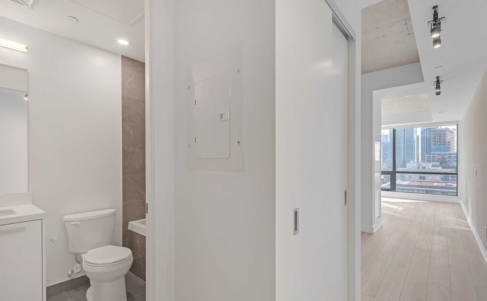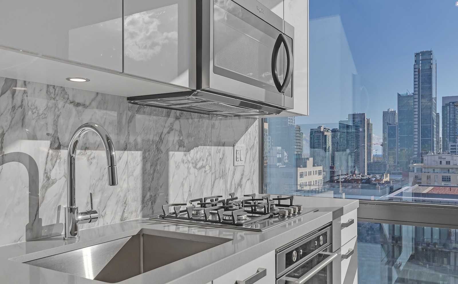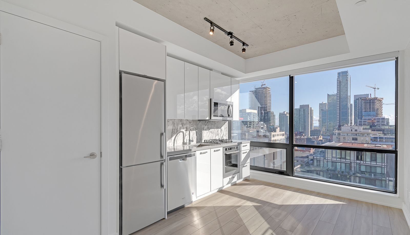 Extremely bright 1-bedroom unit available at the woodsworth, located perfectly located in the heart of toronto's lively fashion district! South-facing floor-to-ceiling windows provide stunning views and allow this unit to bask in constant sunlight. Engineering wood floors throughout, 9' ceilings, exposed concrete ceilings, stainless steel appliances, custom backsplash/kitchen cabinetry, soaker tub, en suite washer/dryer and a gas stove complement this great layout. 1 locker included. Well-managed building features a gym, party room and is located steps to trendy restaurants, stylish boutiques, art galleries, and entertainment just steps from your door. Enjoy easy access to queen west, king west, the entertainment district, and toronto's thriving tech and creative hubs, making this an ideal location for professionals and city lovers alike.