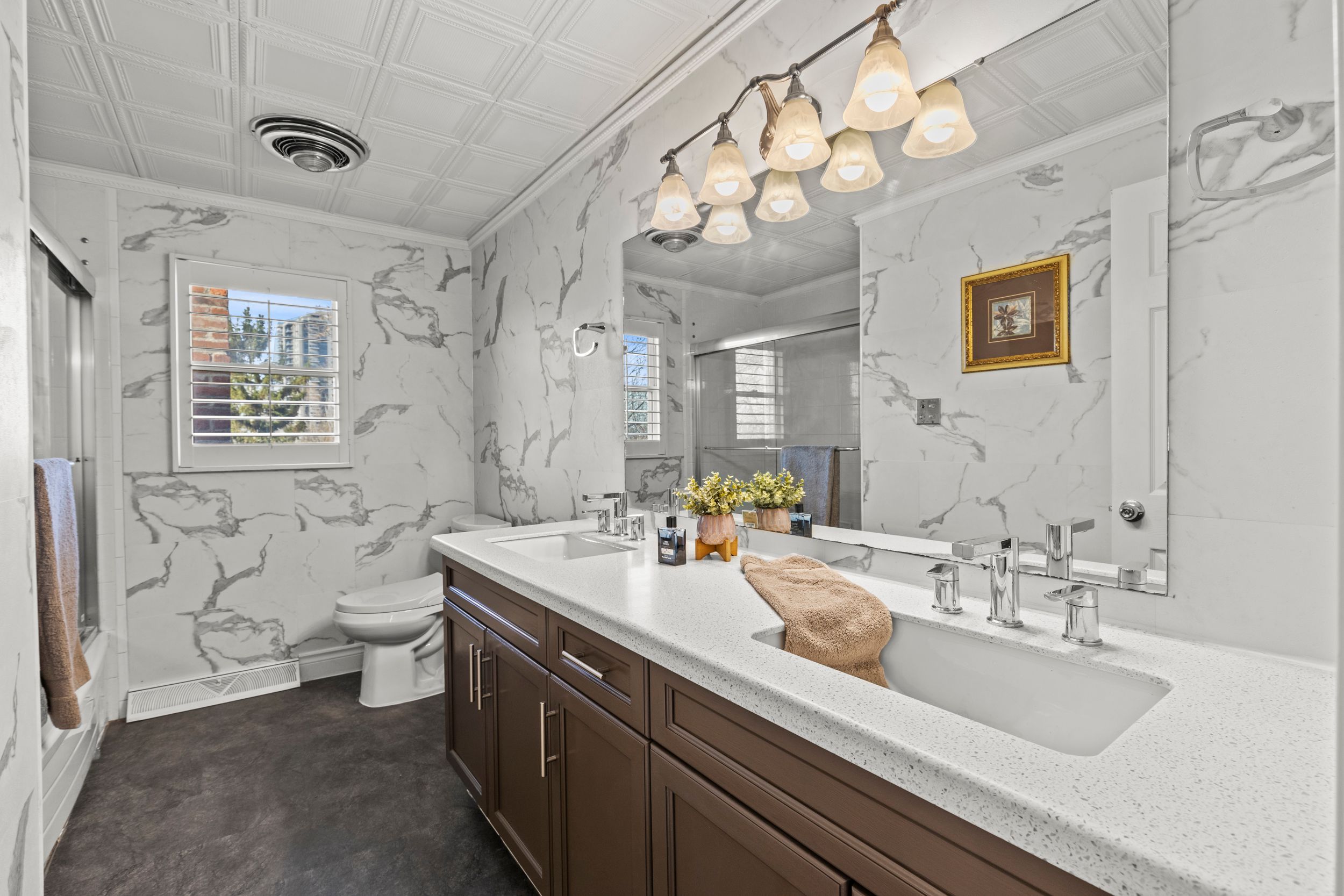 Exceptional 6-bedroom, 5-bathroom executive home in south st. Catharines, offering over 3,400 sq ft above grade on a premium 66 x 251 ft ravine lot with no rear neighbours, backing onto a green space paradise with in-ground pool. Well renovated between 2019-2025, this property provides outstanding space, privacy, and extensive upgrades throughout. The main floor features a bright home office with backyard views, a private living room with fireplace, a separate recreation/sitting area, and a main-floor sauna with direct outdoor access. The open kitchen offers quartz countertops, a large island, updated cabinetry, and a spacious dining area with oversized patio doors leading to the private backyard with an in-ground concrete pool. A convenient main-floor laundry and shower room complete this level. The second floor offers two unique primary suites. The west-facing suite includes vaulted ceilings, a fireplace, walk-in closet, private balcony, and renovated ensuite with skylight. The east-facing suite provides generous space and morning light. Three additional bedrooms feature private ensuites, and a large 4-piece bathroom services the remaining bedroom. The finished basement includes a recreation room, storage, and a second laundry area. Major updates include full second-floor renovation; multiple bathroom remodels; new kitchen (2021); new staircase, flooring, trims, casings, and baseboards; attic insulation and hvac upgrades with humidifier and electric air cleaner (2019); spray-foam insulation above the garage; driveway rebuild; new fencing; artificial turf; shed foundation; extensive pool repairs and repainting; and new garage doors (2025). Premium located near the pen centre, brock university, highs chools, ridley college, hospital, and major amenities.