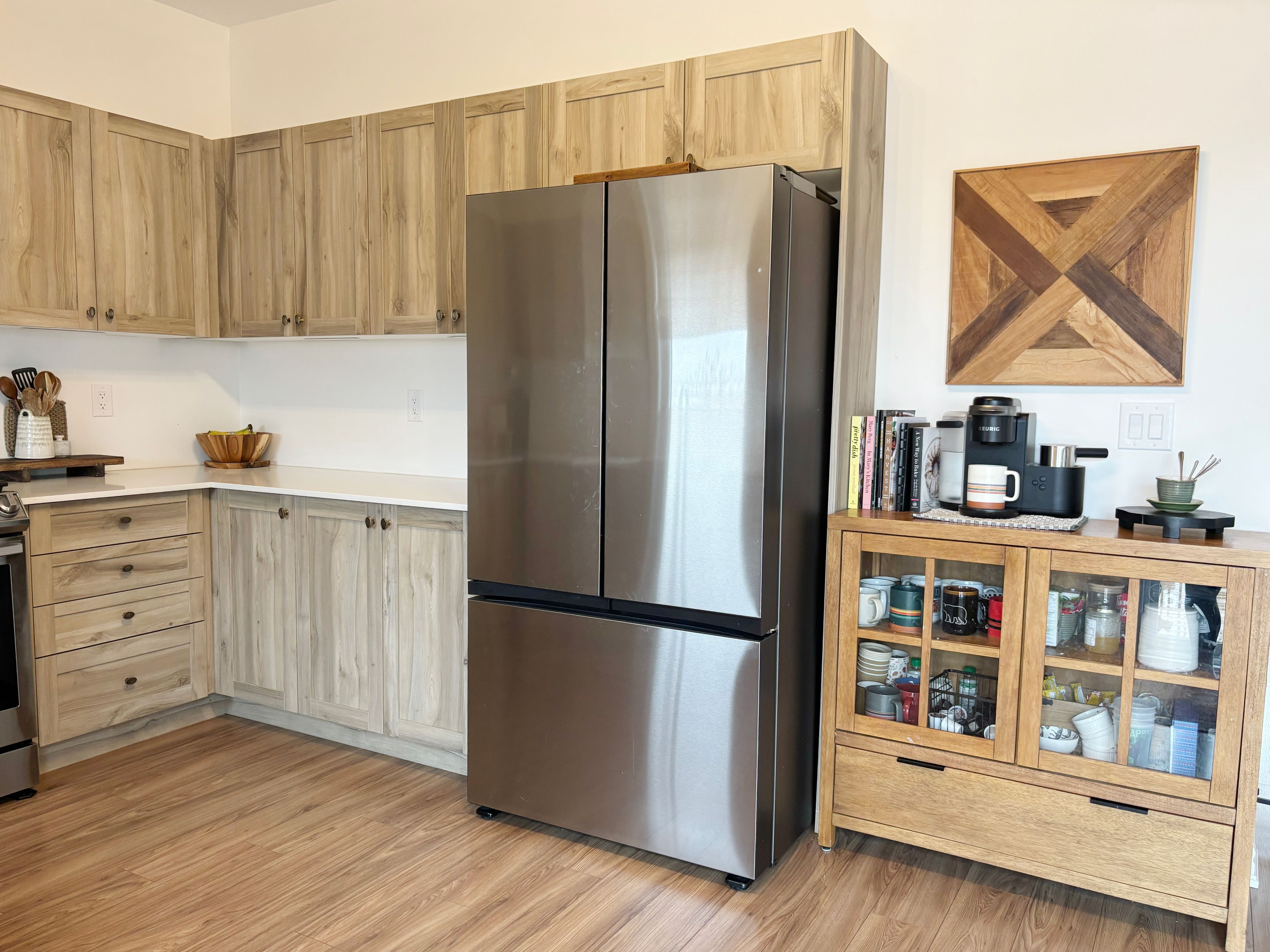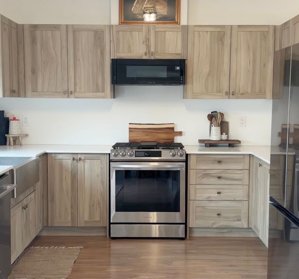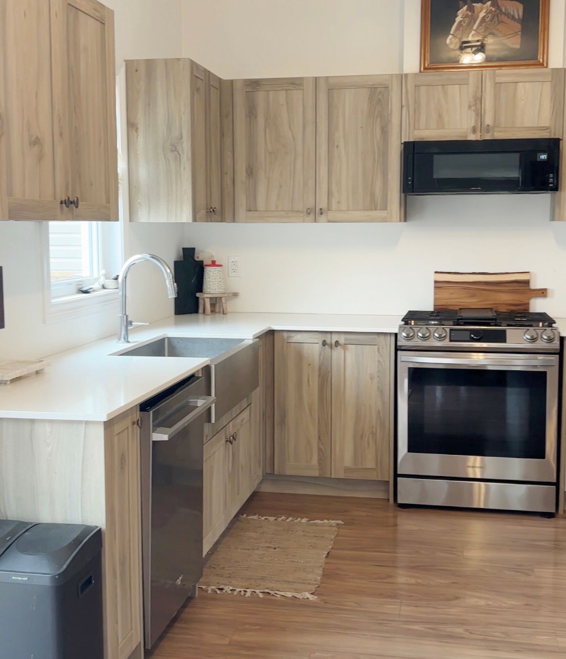 • Large kitchen with quartz countertops and a farmhouse sink for convenience.