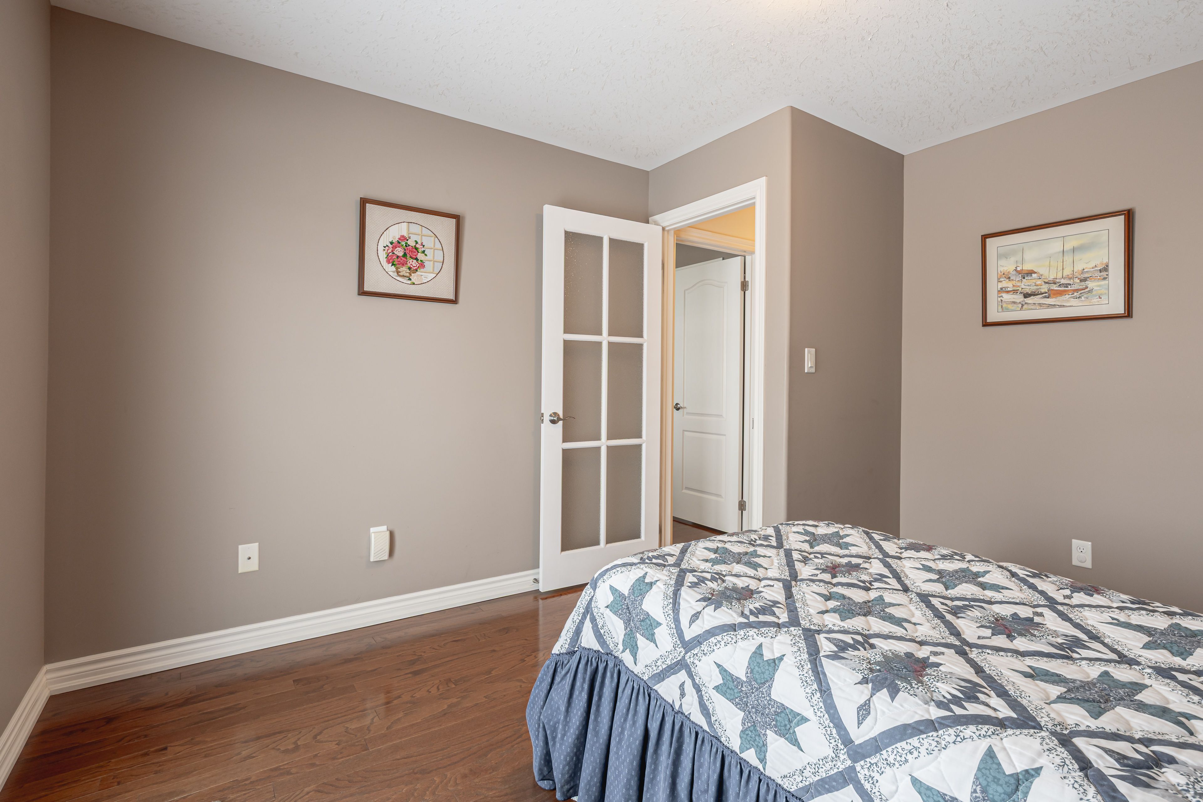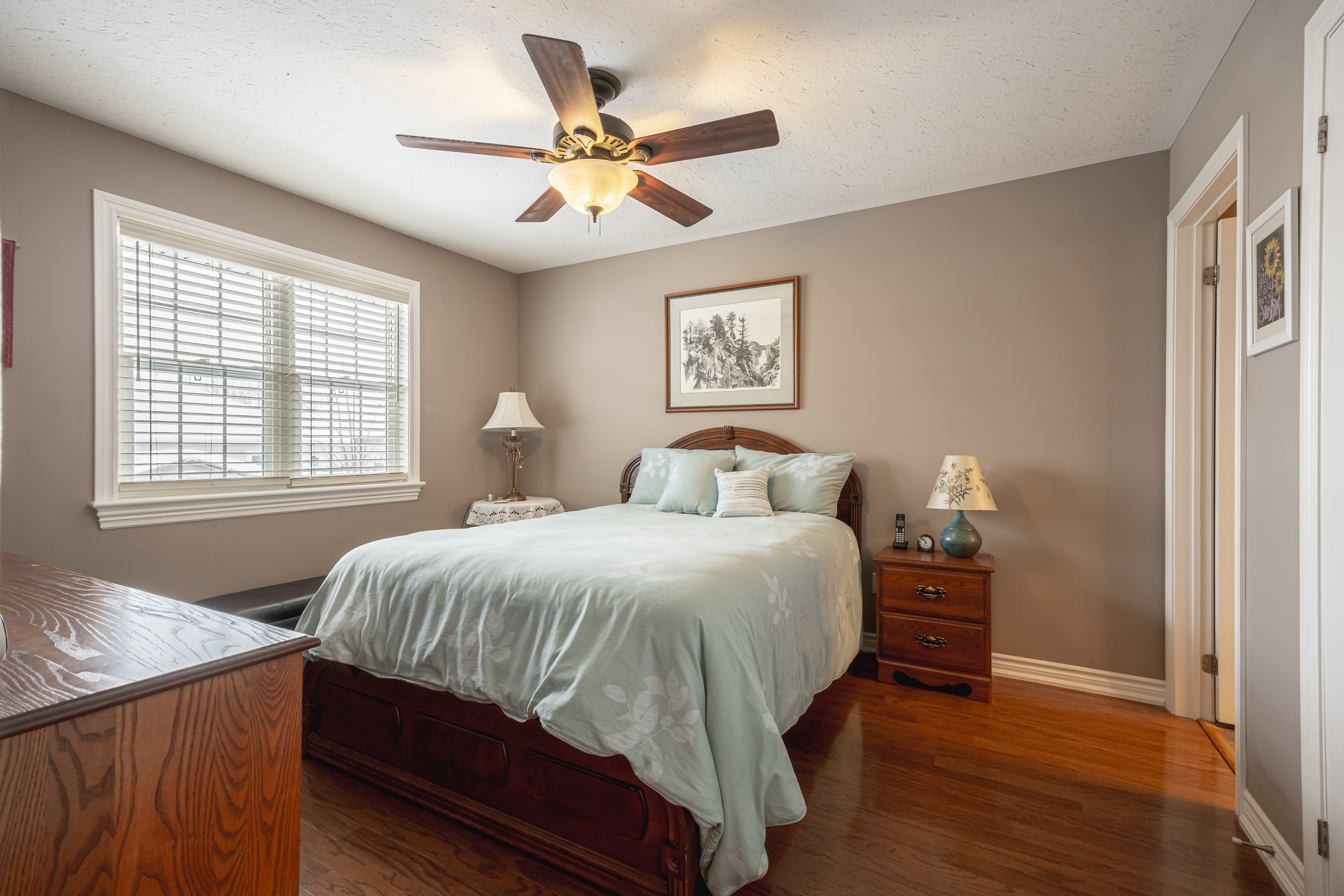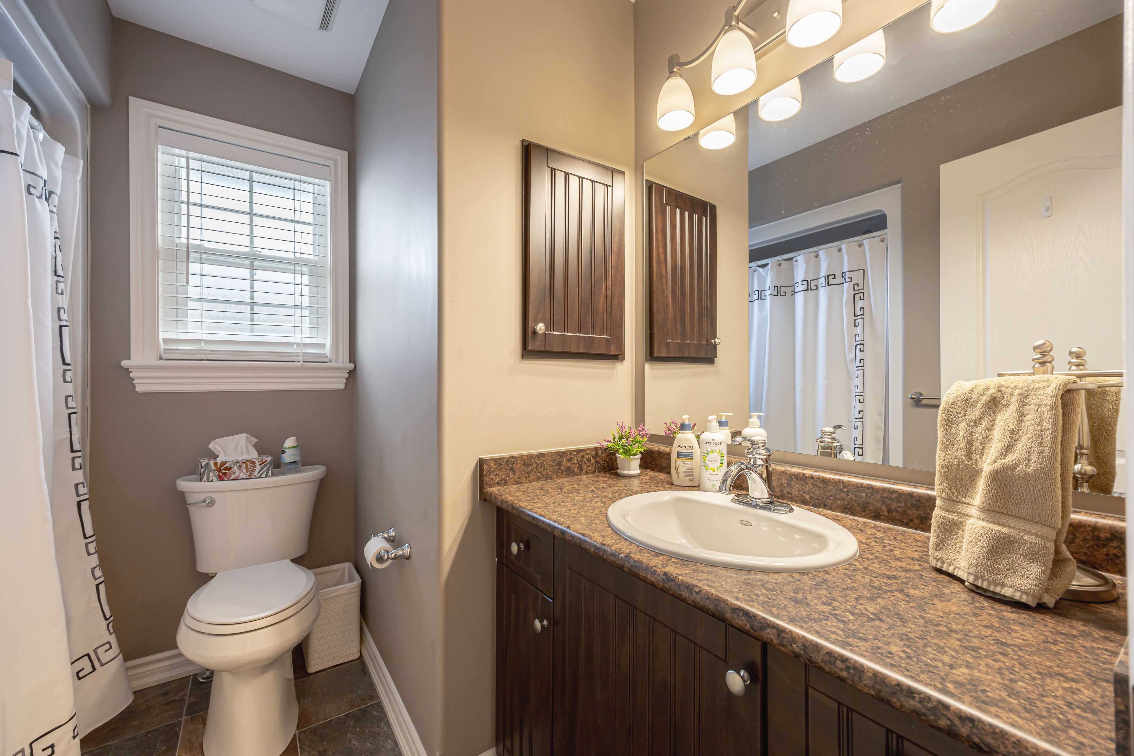 This home is much larger than you would think! Nestled in a fantastic neighbourhood, this charming, meticulously maintained, bungalow offers two plus two bedrooms and three bathrooms, including a lovely ensuite in the primary suite. The main level features gleaming hardwood floors complemented by laminate tile in the kitchen and dining area. The open concept great room, with its cathedral ceiling and cozy fireplace, has been freshly painted including new cabinet doors, new quartz countertop, a pantry, and a laundry closet and ample sitting area around the gas fireplace. Downstairs, a huge, finished rec room, two additional bedrooms, a three-piece bathroom and a kitchenette rough-in, and laminate flooring. Carpet only appears on the stairs. It is a home designed for comfortable living. Move in ready!