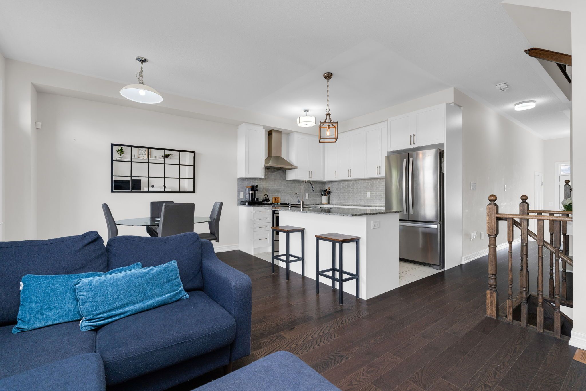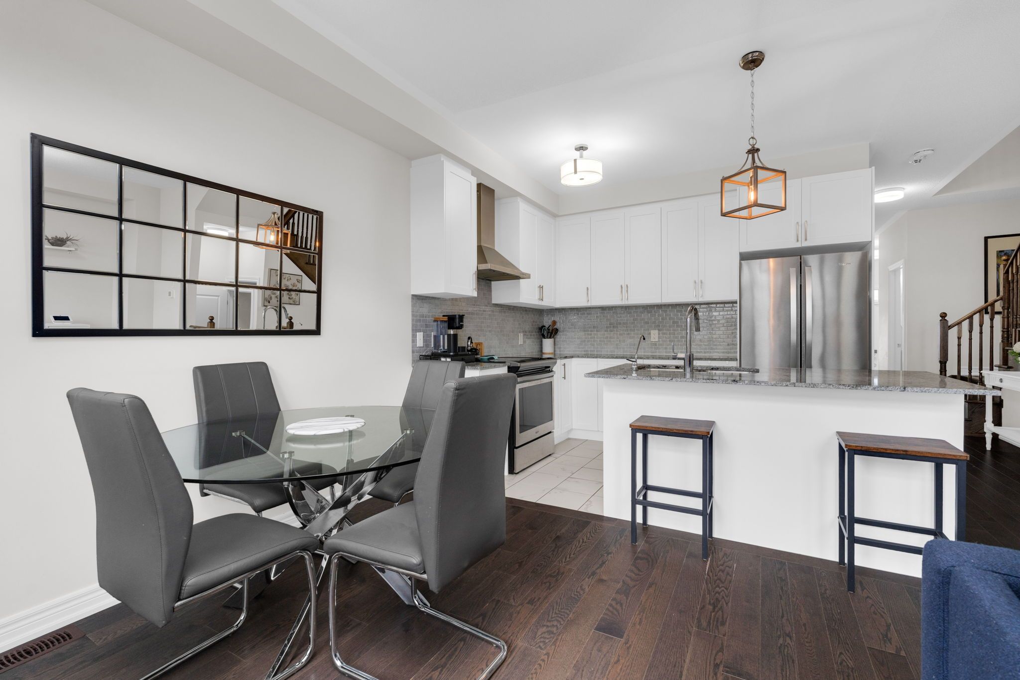Are you a first time buyer looking to break into the market but don't want to compromise on important "must haves" or have the extra money to update and improve? Or maybe you're a down sizer looking for easy maintenance and a turn-key package? 46 clifford delivers big value for its next owner. This newer town home (2020) sits on a quiet court and the current owners have finished it top to bottom, inside and out, so there is truly nothing to do for the next owner but move in and enjoy. Beautifully finished throughout with tasteful neutral decor and modern design elements - with many extras that you are going to love! Stunning curb appeal highlighting two car driveway (parking pad), single car garage, established landscaping, extensive stonework and welcoming covered front porch. Within this home you will find 9' ceilings on the main level and an abundance of windows offering natural light throughout this open concept layout. Beautiful flow from the kitchen, into the dining area and around to the living room. Dark hardwood floors, shaker style white kitchen cabinets, quartz countertops, tile and backsplash, s/s appliances. Convenience of main level 2pc guest bath, and garage entry. The second level offers three generous sized bedrooms and main bath. The primary bedroom features full ensuite and walk in closet. The lower level extends your finished living space with flexible space for a rec room, space for overnight guests, home office or exercise room - the choice is yours! Lower level includes convenience of a newly added 3-pc bath. Private fenced rear yard is spacious with large stone patio for enjoying al fresco meals, entertaining, family time. This neighbourhood meets - and exceeds - the needs of a busy household - schools, parks, tennis courts, baseball field, shopping centre (grocery store, banks, pharmacy, dentist, restaurants), recreation, entertainment - as well as easy access to key commuter routes! Minutes from tottenham conservation area.
