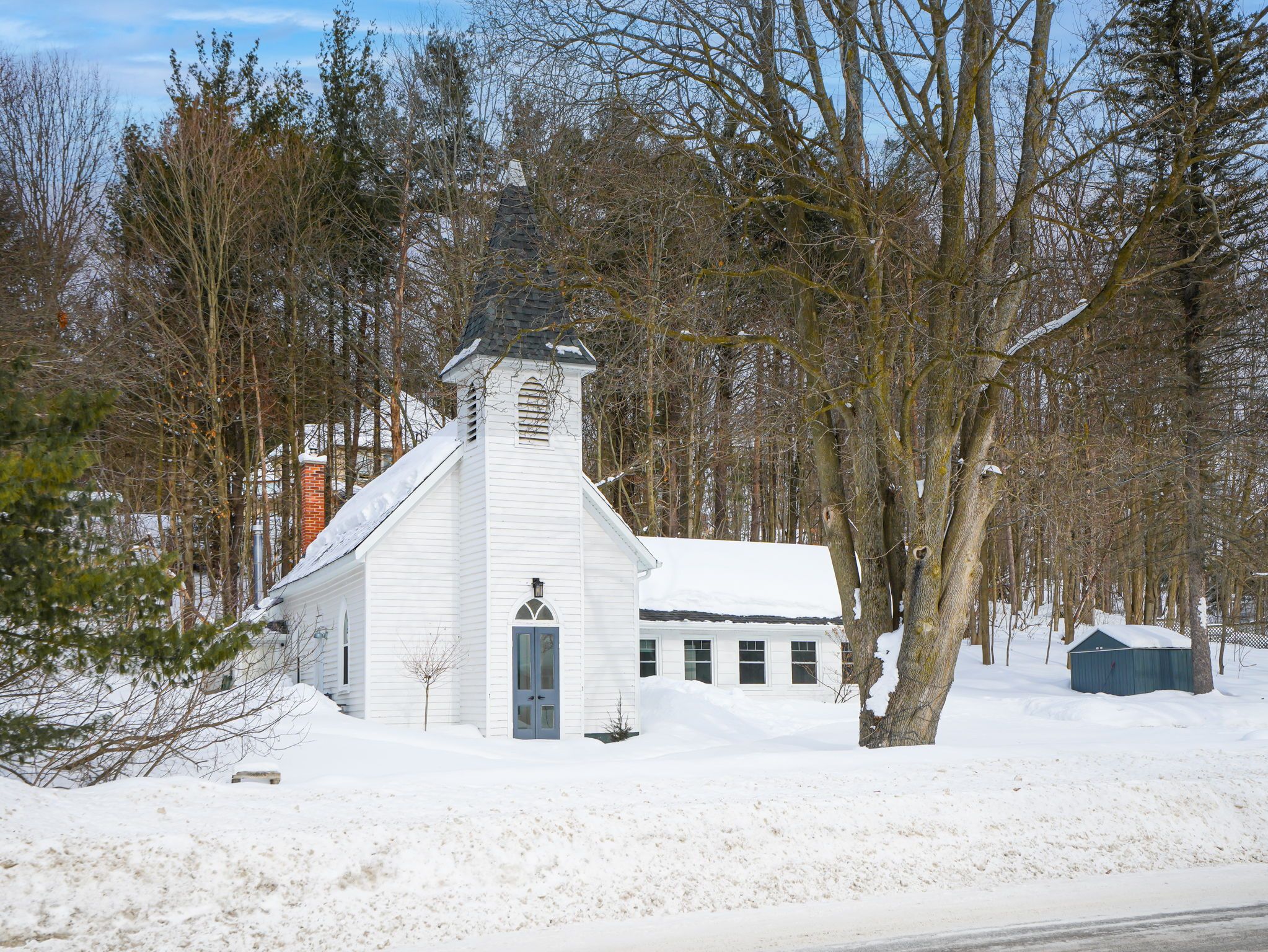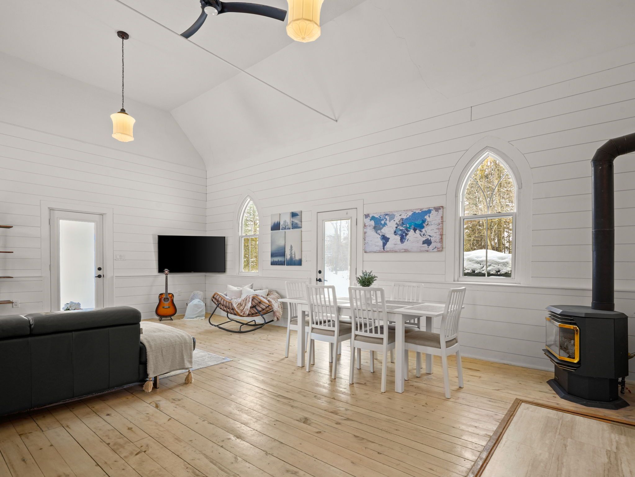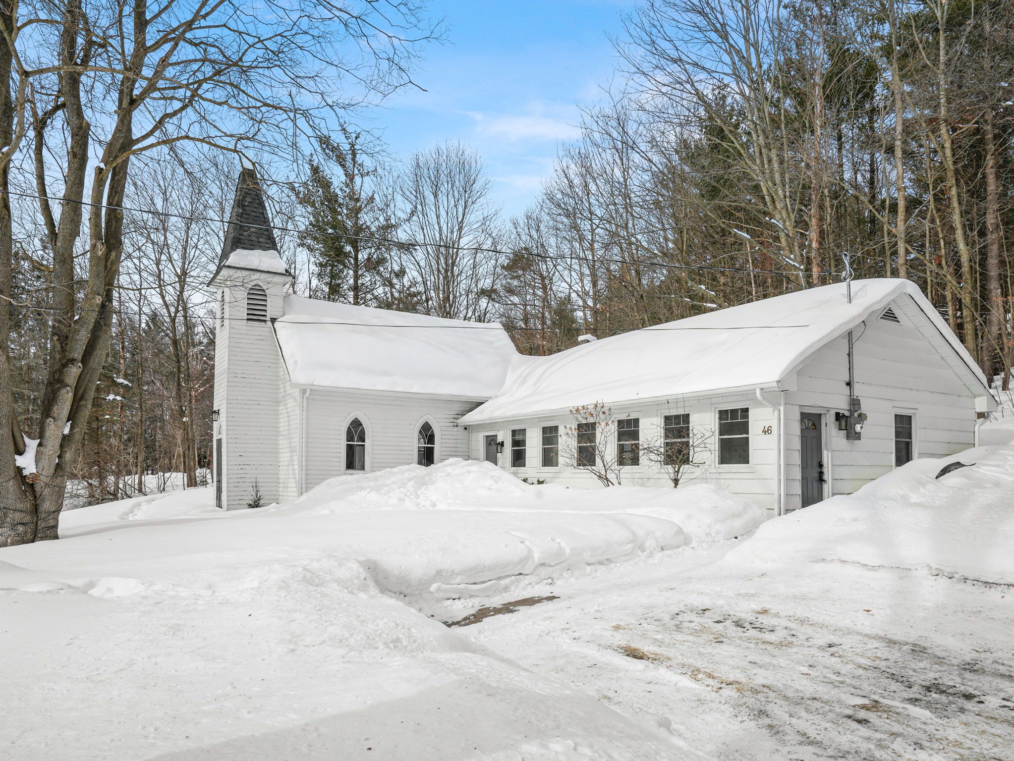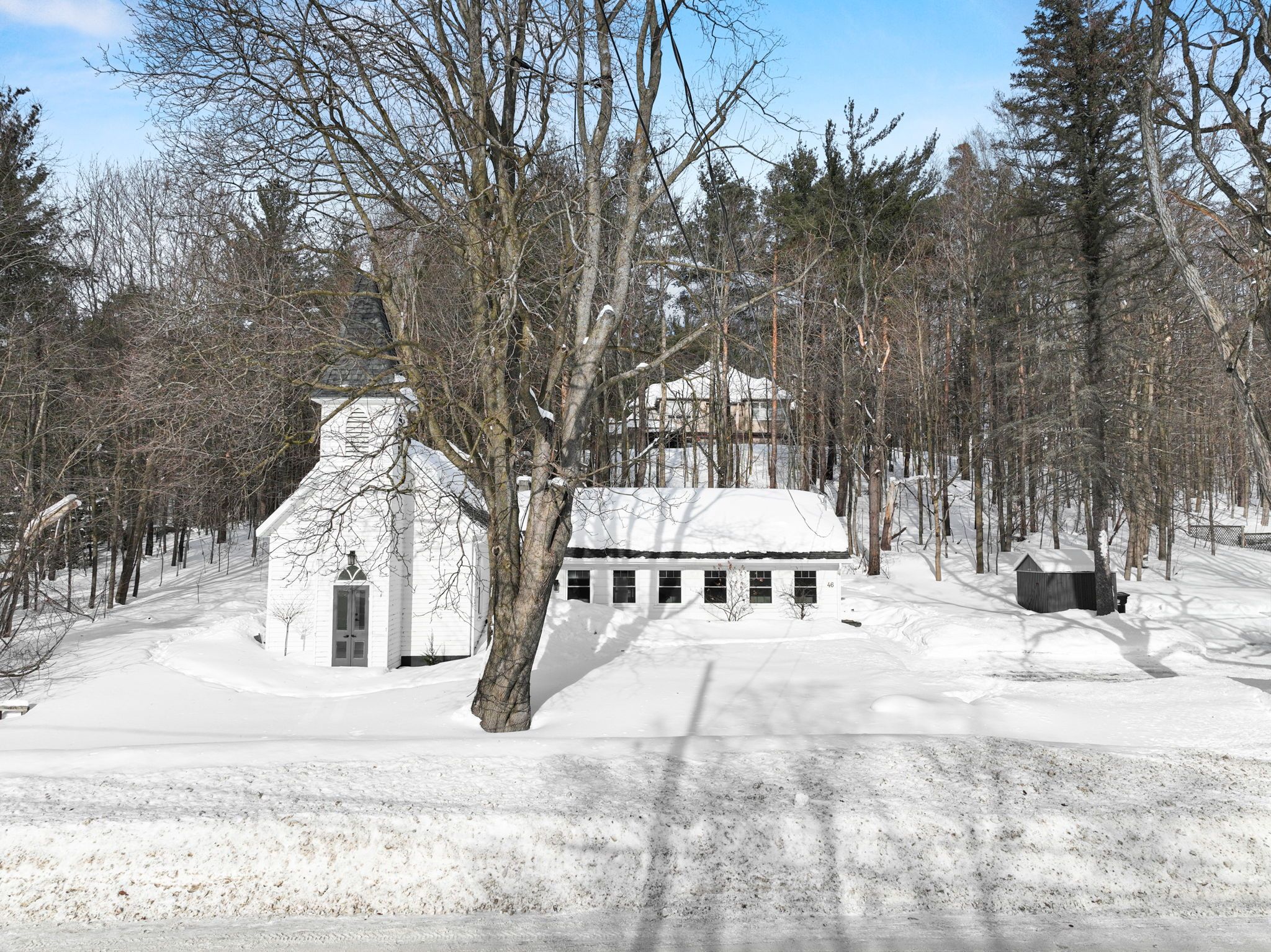 A rare opportunity to own a true piece of midhurst history. This iconic 1800s church has been thoughtfully transformed into a stunning private residence that preserves its heritage while delivering modern comfort and functionality. Rich with original character and architectural detail, the home blends old-world craftsmanship with tasteful contemporary upgrades. The former sanctuary now serves as the main living space and kitchen, where soaring ceilings and dramatic volume create an unforgettable focal point where a gas fireplace casts a nice glow and wamth. Natural light pours through the unique windows, highlighting the scale and warmth of the open-concept design - ideal for both quiet living and entertaining. The home offers three generously sized bedrooms, carefully integrated to respect the building's historic integrity while providing practical everyday living. Outside, a charming side patio offers a peaceful place to relax and enjoy the surroundings in one of midhurst's most coveted communities. This landmark property is more than a home - it is a living story, filled with character, history, and timeless appeal. Key features: all windows on east part of home new 2024, all other windows less than 5 years old, furnace 5 years old, shingles on steeple 2024, remaining roof 10 years old, gas fireplace, 3 good sized bedrooms, 10x10 garden shed, ample parking, new septic tank and bed 2025.