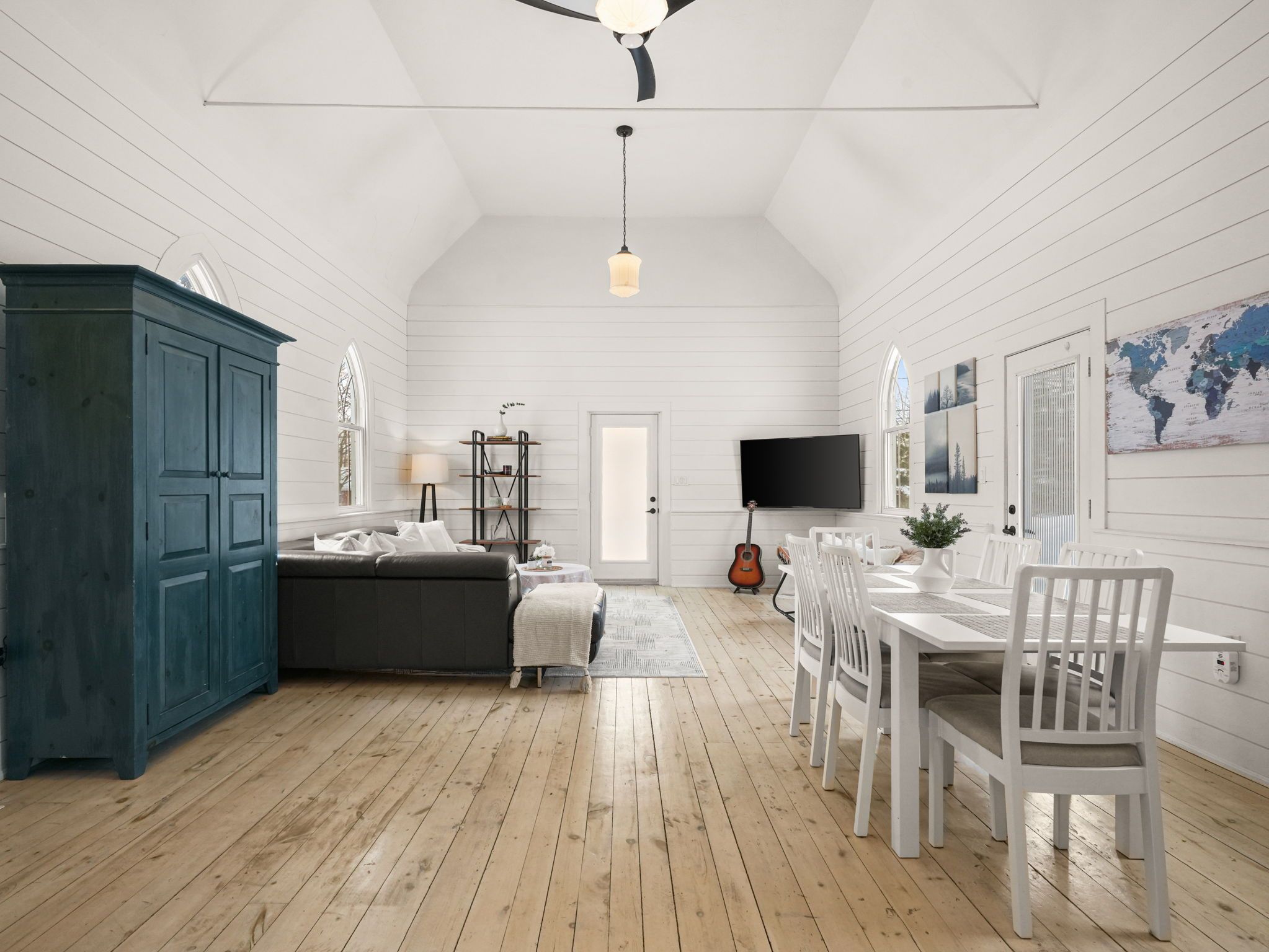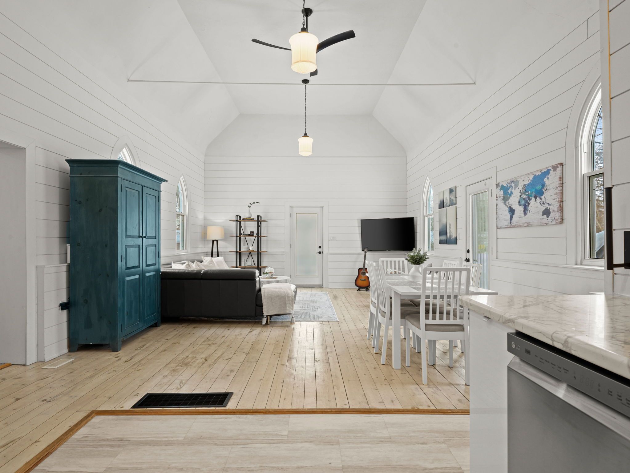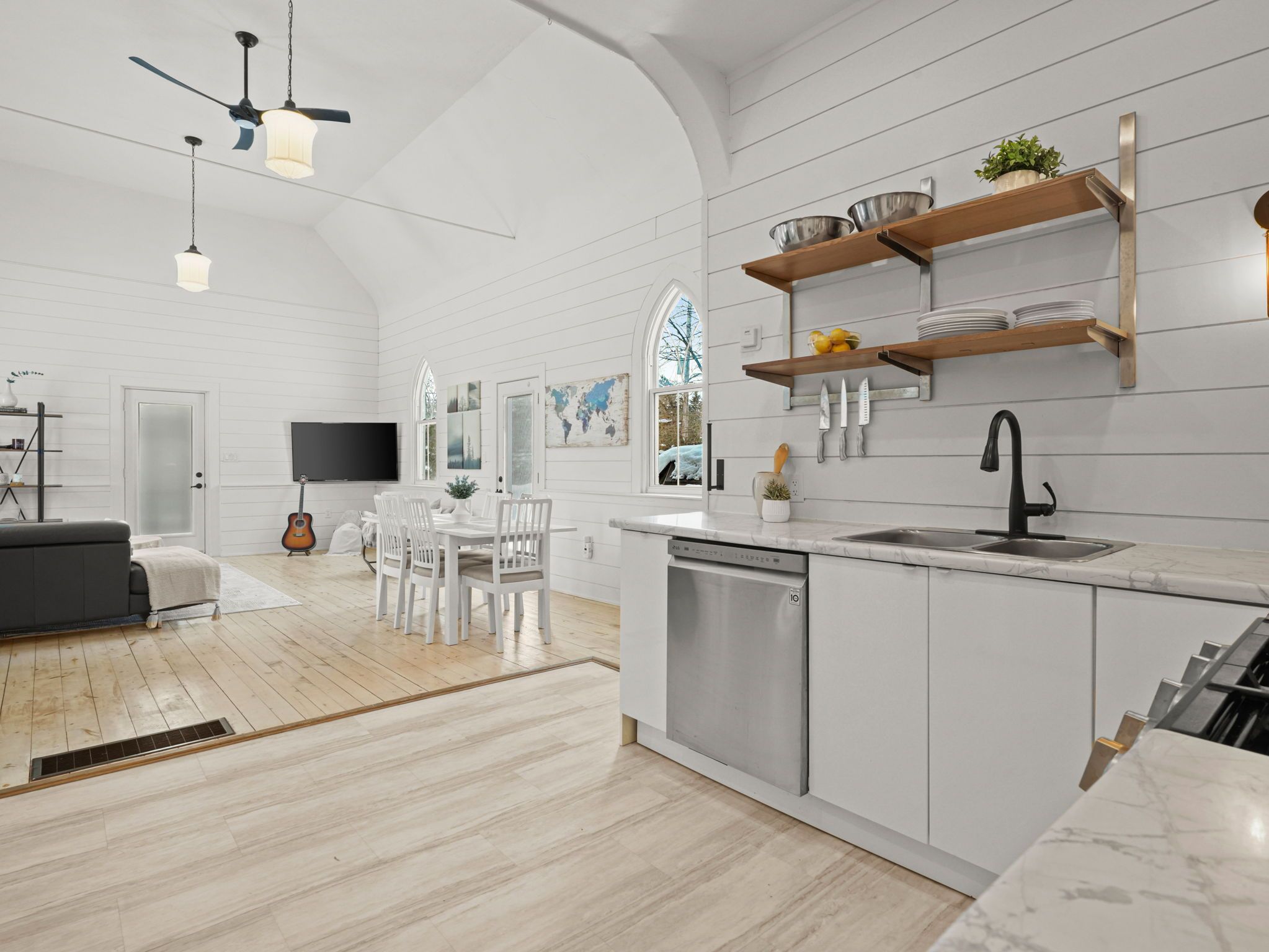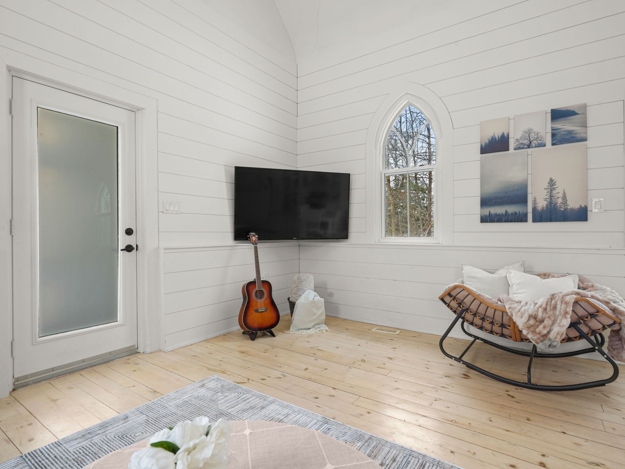A rare opportunity to own a true piece of midhurst history. This iconic 1800s church has been thoughtfully transformed into a stunning private residence that preserves its heritage while delivering modern comfort and functionality. Rich with original character and architectural detail, the home blends old-world craftsmanship with tasteful contemporary upgrades. The former sanctuary now serves as the main living space and kitchen, where soaring ceilings and dramatic volume create an unforgettable focal point where a gas fireplace casts a nice glow and wamth. Natural light pours through the unique windows, highlighting the scale and warmth of the open-concept design - ideal for both quiet living and entertaining. The home offers three generously sized bedrooms, carefully integrated to respect the building's historic integrity while providing practical everyday living. Outside, a charming side patio offers a peaceful place to relax and enjoy the surroundings in one of midhurst's most coveted communities. This landmark property is more than a home - it is a living story, filled with character, history, and timeless appeal. Key features: all windows on east part of home new 2024, all other windows less than 5 years old, furnace 5 years old, shingles on steeple 2024, remaining roof 10 years old, gas fireplace, 3 good sized bedrooms, 10x10 garden shed, ample parking, new septic tank and bed 2025.