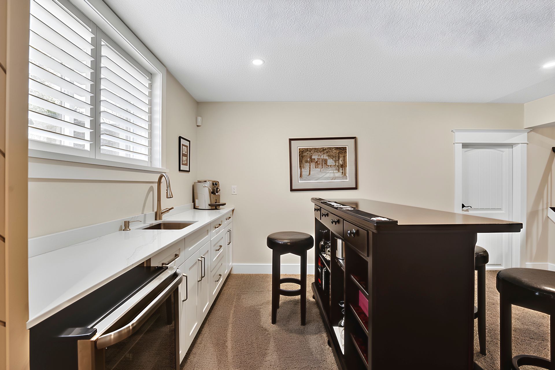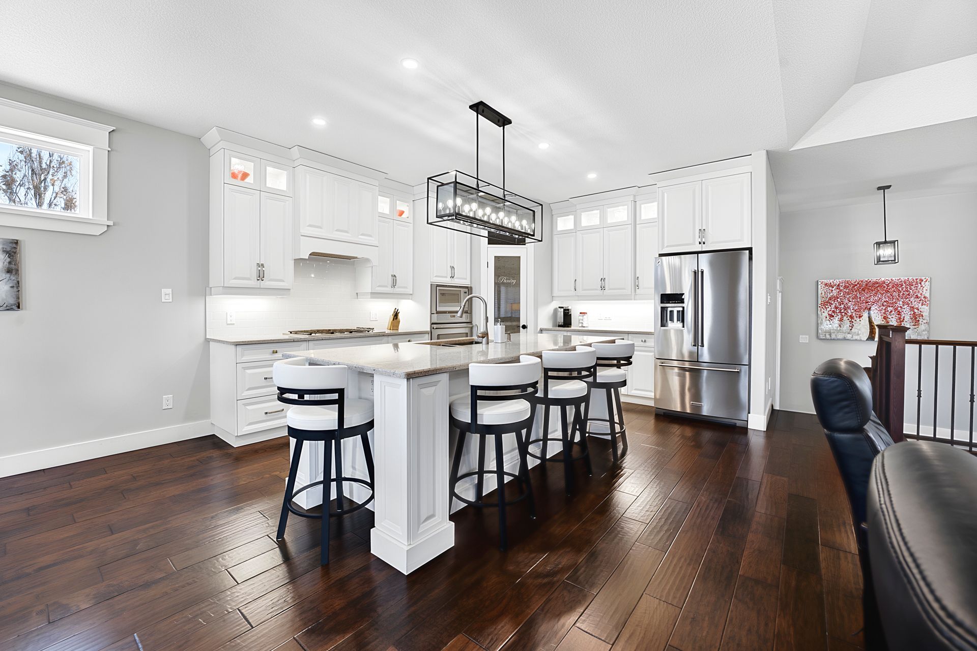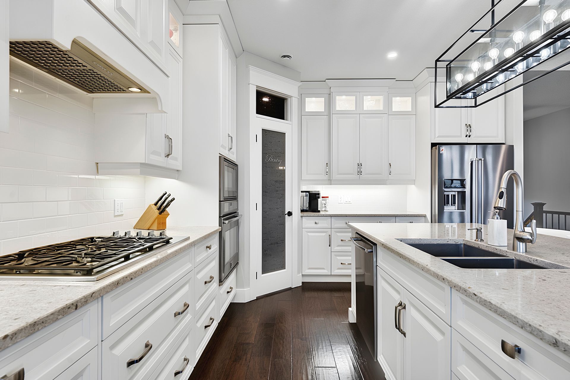 • Custom kitchen with oversized island, quartz countertops, and premium appliances.