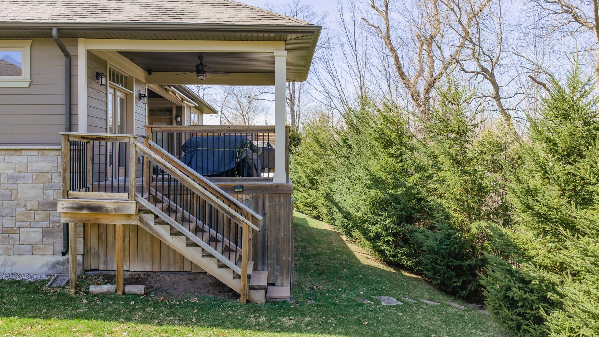 Welcome to this picture-perfect bungalow by medway homes, nestled in the prestigious harbourside village of grand bend. Just a short stroll to downtown shops, dining, and the beach, this exceptional home blends elegance, comfort, and effortless one-floor living. Offering over 2,800 sq ft of total finished space, the home features a bright, open-concept layout with tasteful, upscale finishes. The stunning custom kitchen serves as the heart of the home, boasting an oversized island, quartz countertops, and premium appliances. The main floor includes a convenient laundry room and a spacious primary suite. Extend your living space outdoors to the expansive deck, complete with a covered area and powered awning, overlooking a private, landscaped lot that backs onto serene woods. The fully finished lower level adds significant value, featuring a cozy family room with a gas fireplace, a wet bar, and additional versatile rooms perfect for guests or a home office. Practicality meets luxury with a massive attached garage, featuring a sink and direct walk-up access to the basement. Recent upgrades include a new poured concrete driveway and walkway, a sophisticated sprinkler system and a security system. Situated on a quiet, pie-shaped lot, this home offers the perfect balance of privacy and community, with local schools and the old ausable channel just moments away. Experience the best of grand bend living in this meticulously maintained, move-in-ready residence.