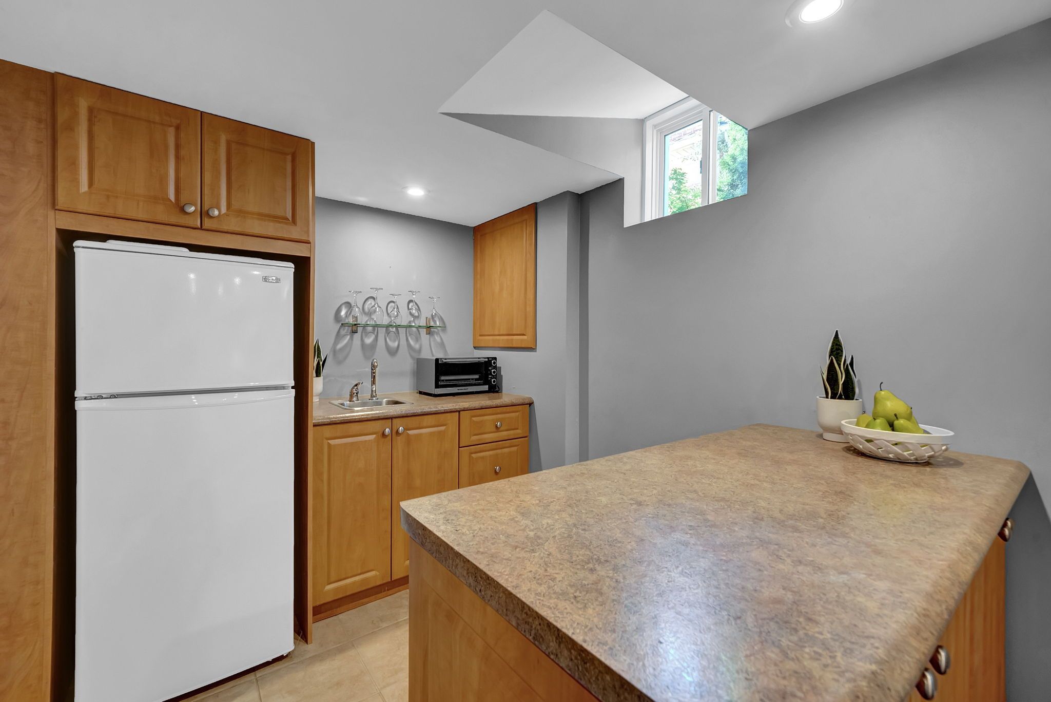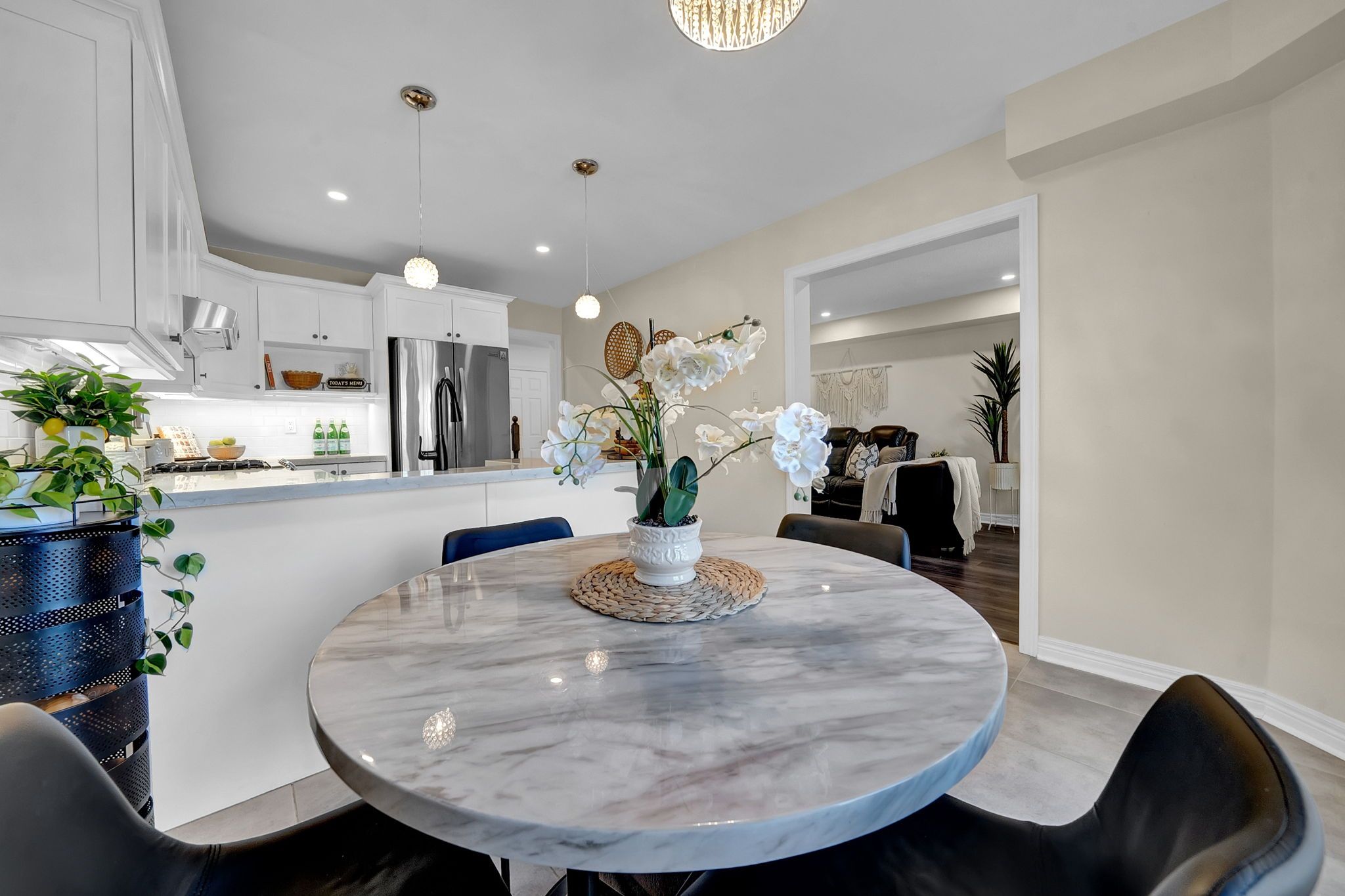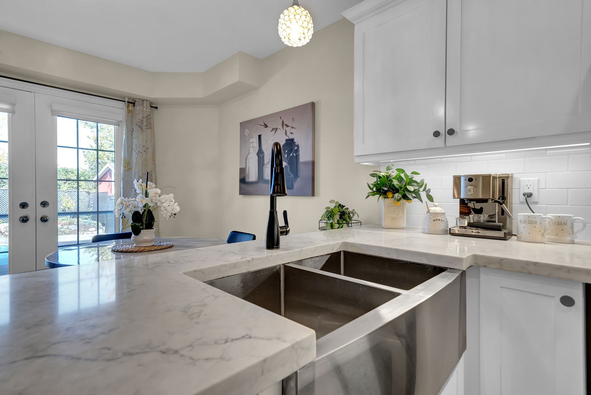 • Bright eat-in kitchen with quartz countertops and double convection oven.