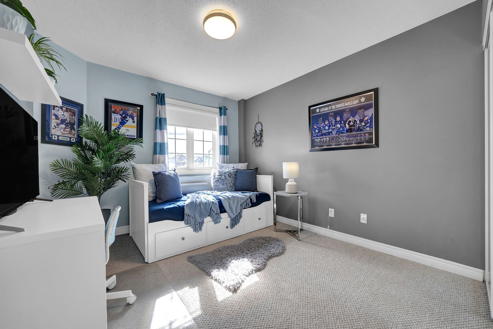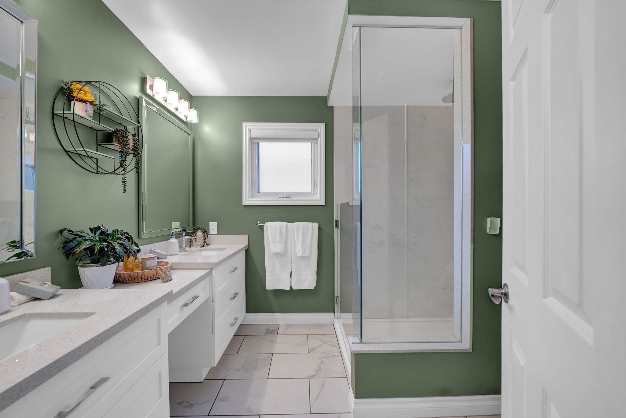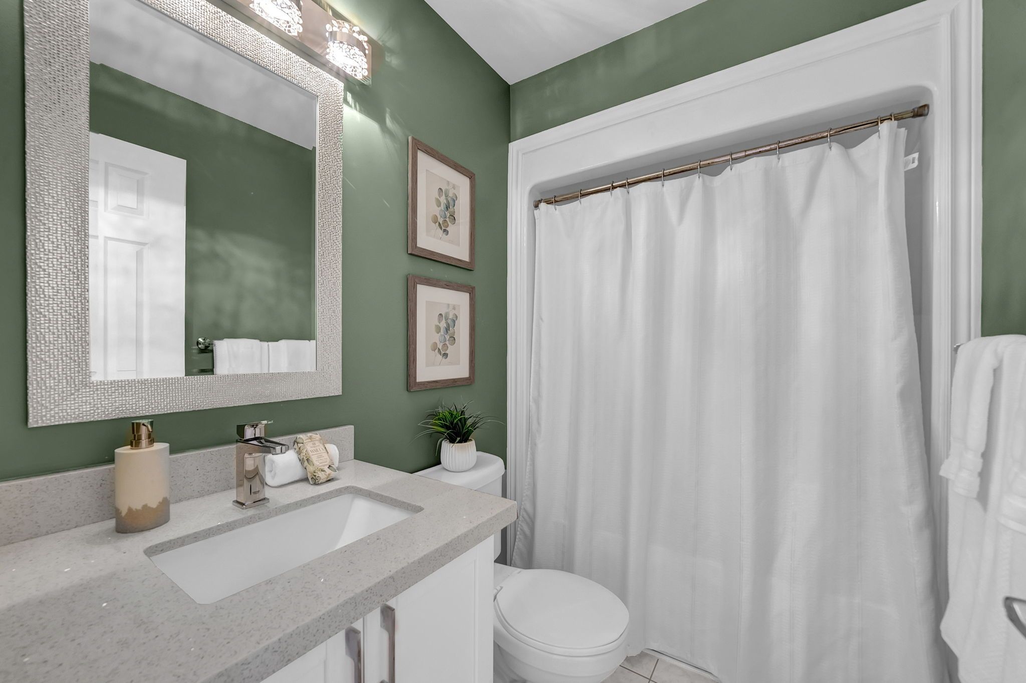 • Bright eat-in kitchen with quartz countertops and double convection oven.