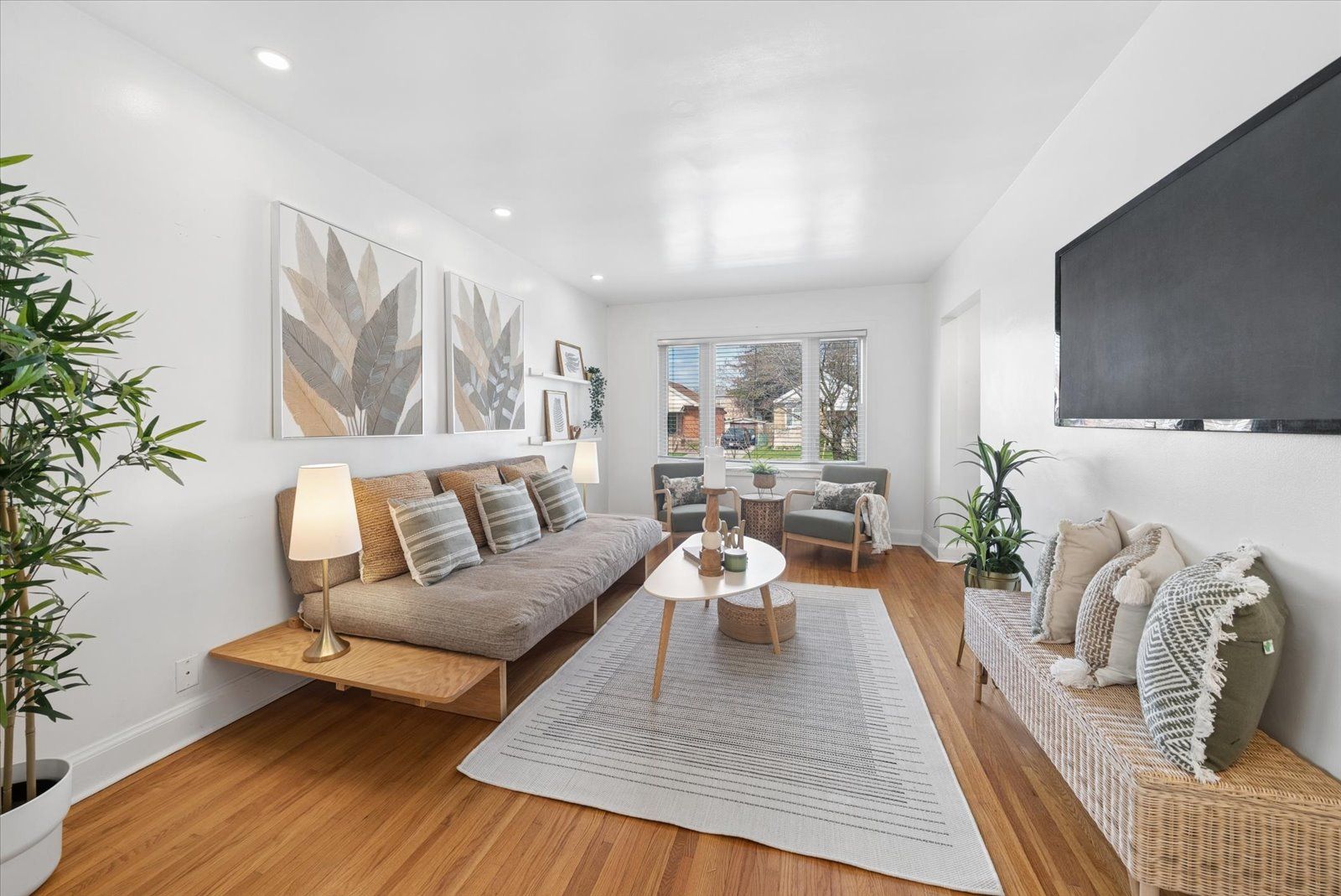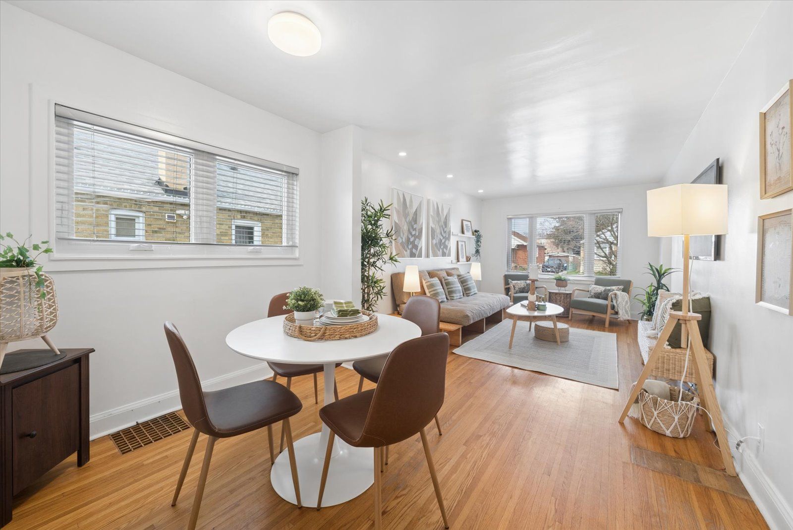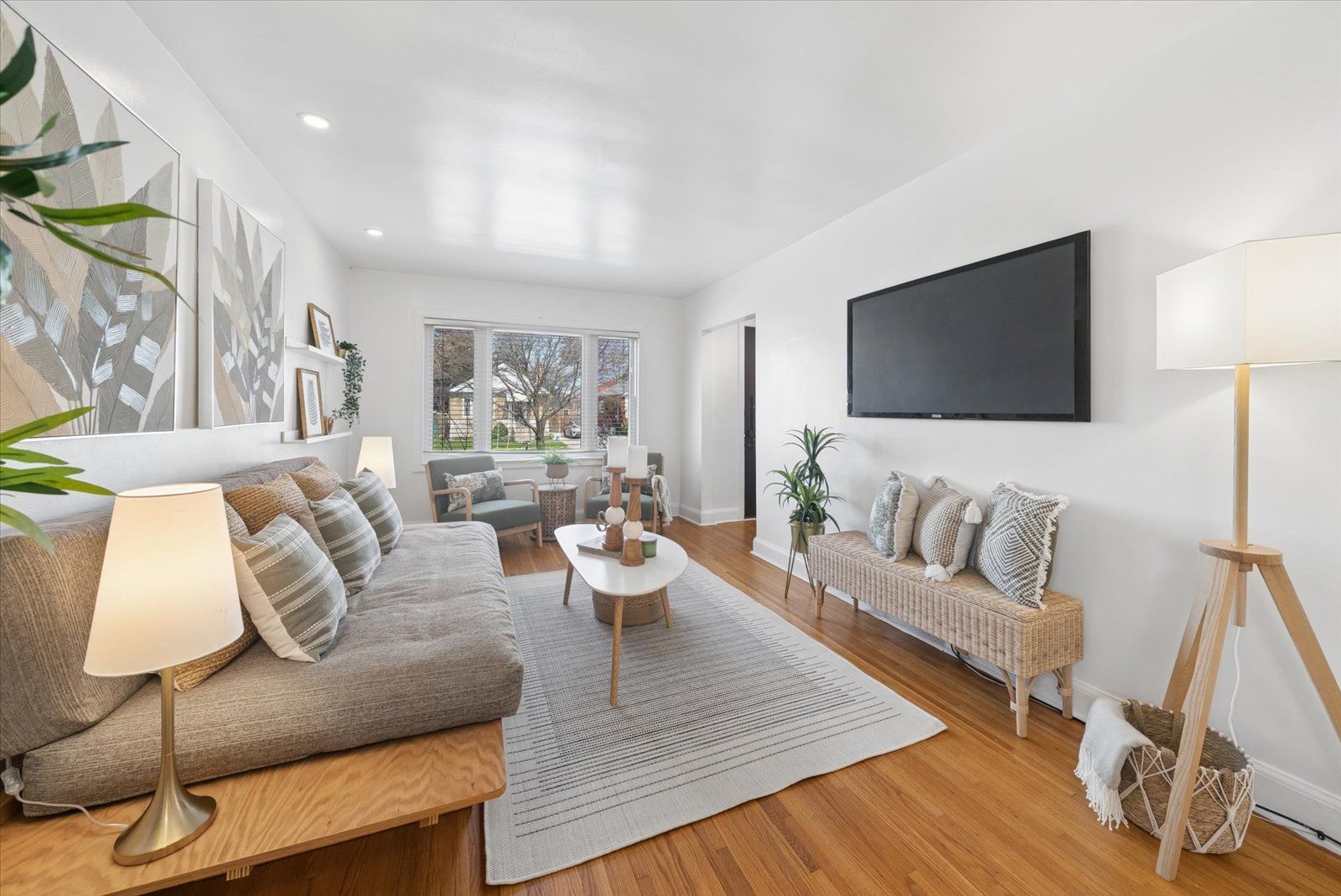 • Bright open-concept layout with hardwood floors and large picture window.