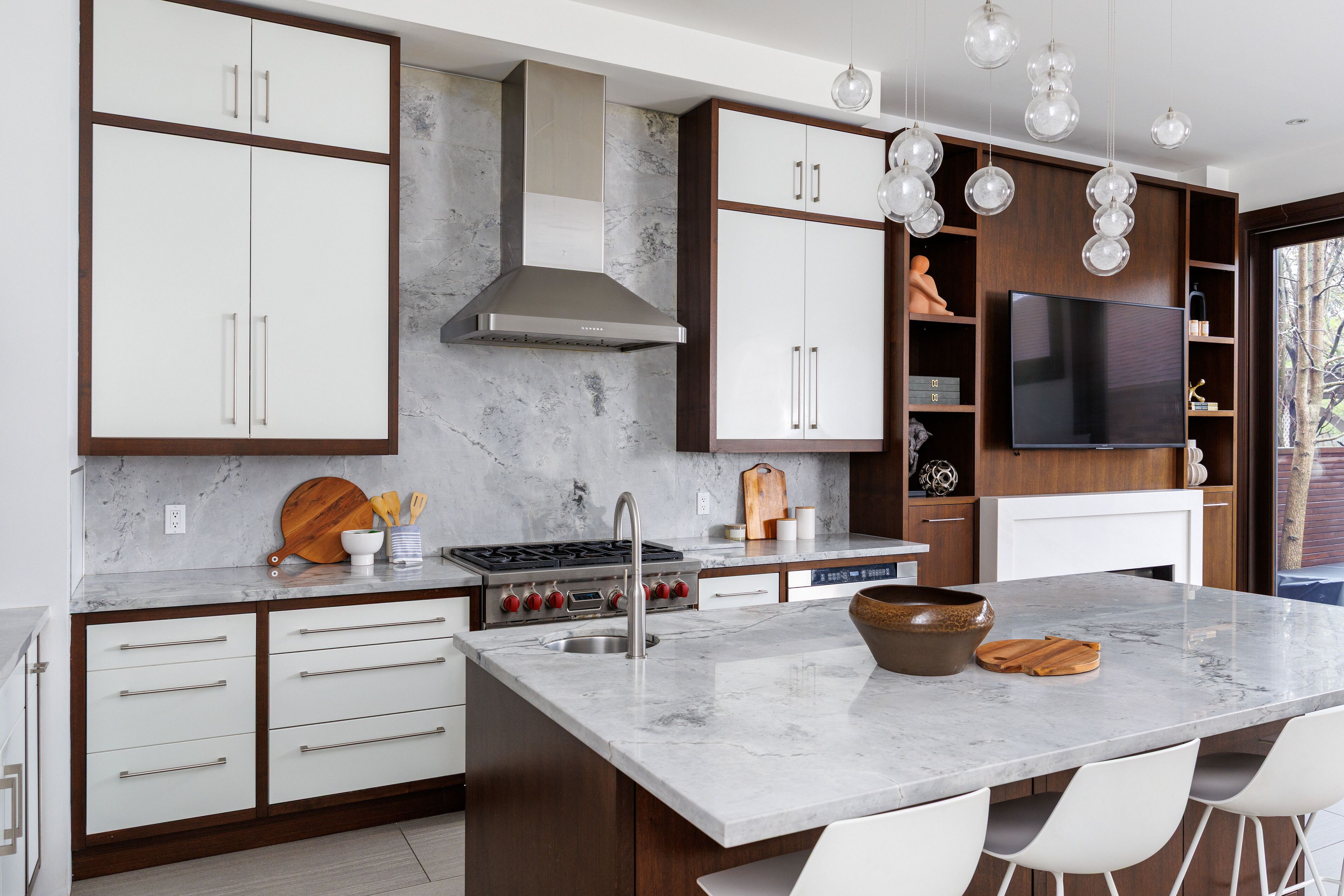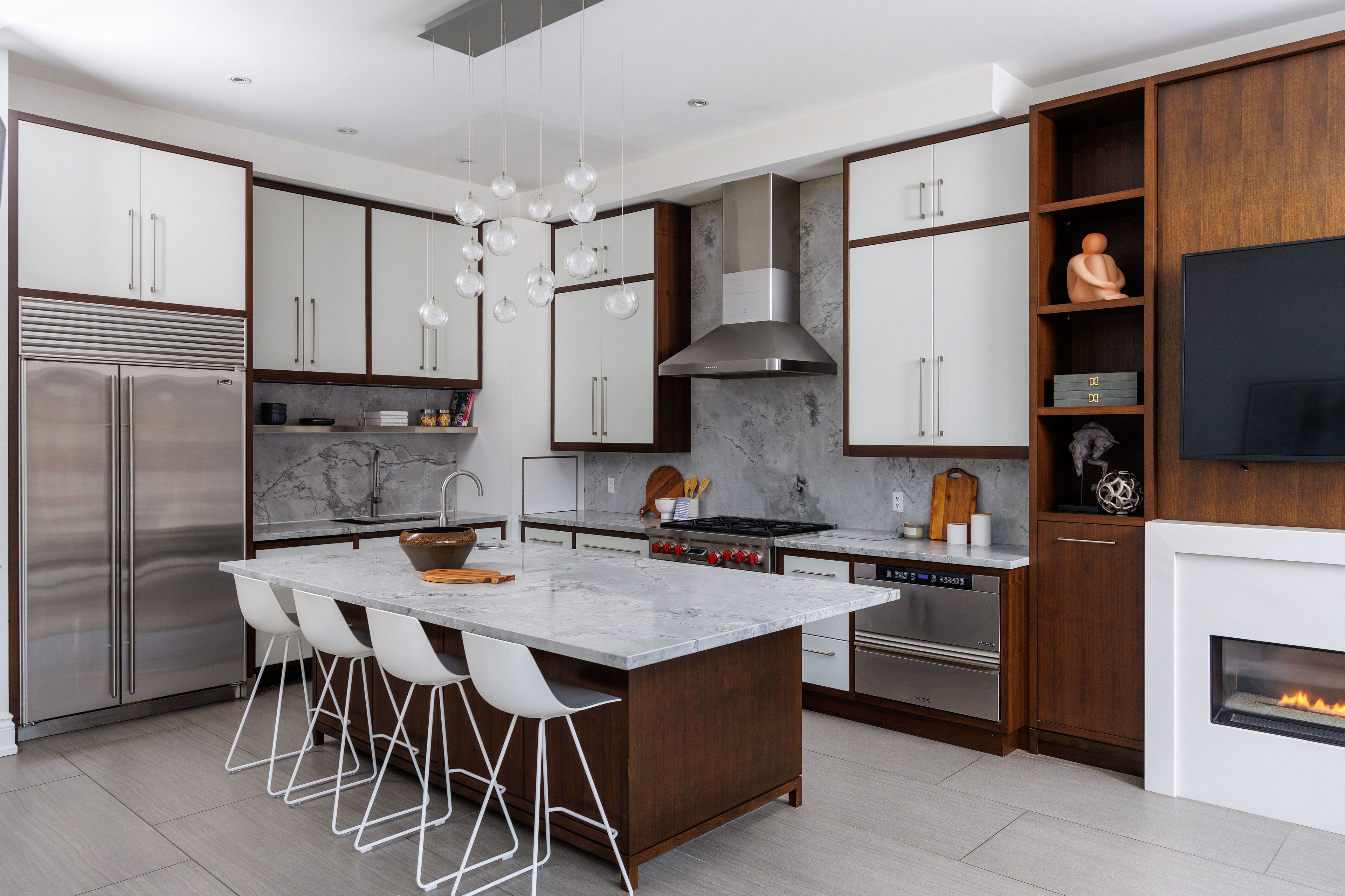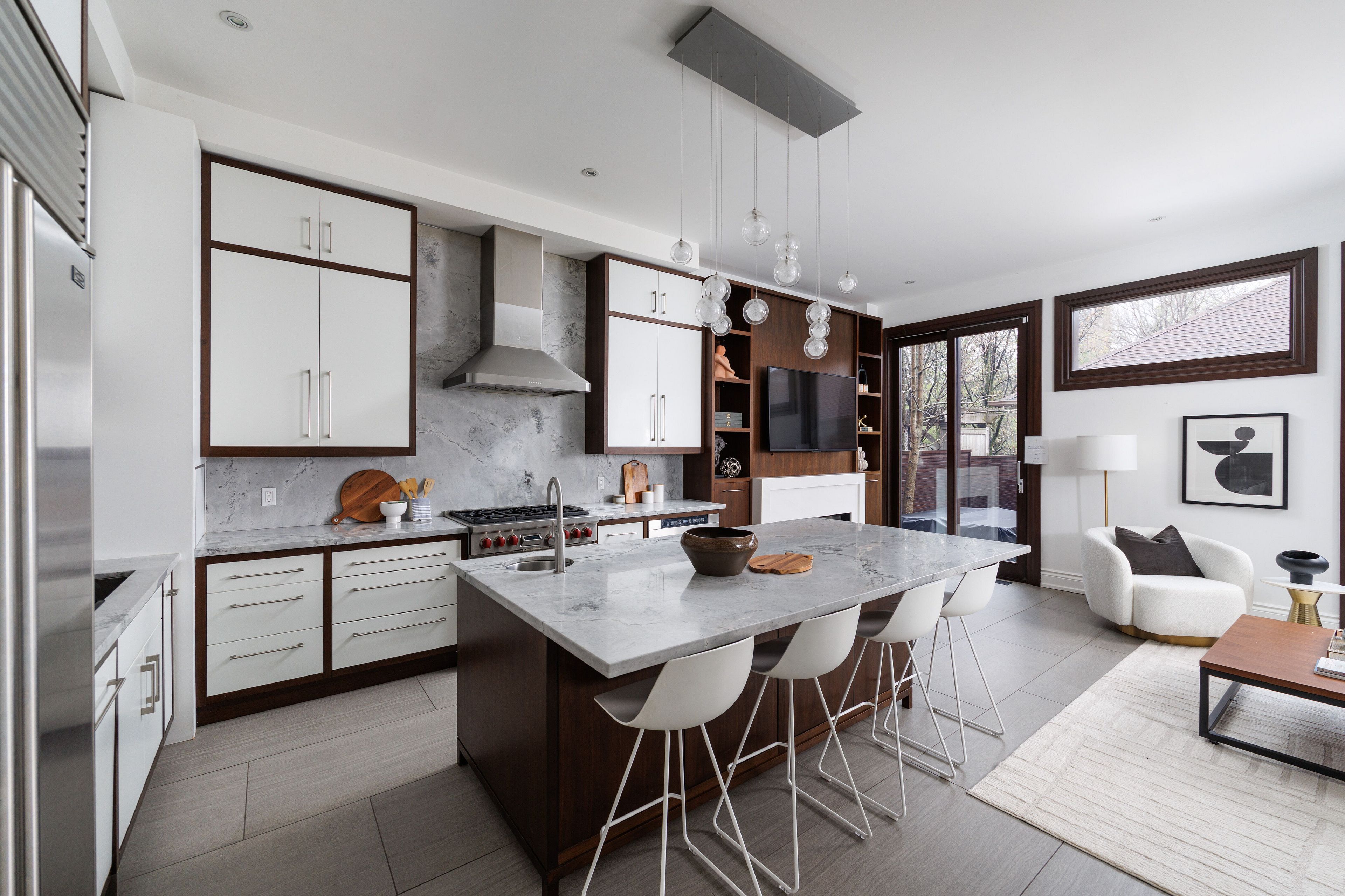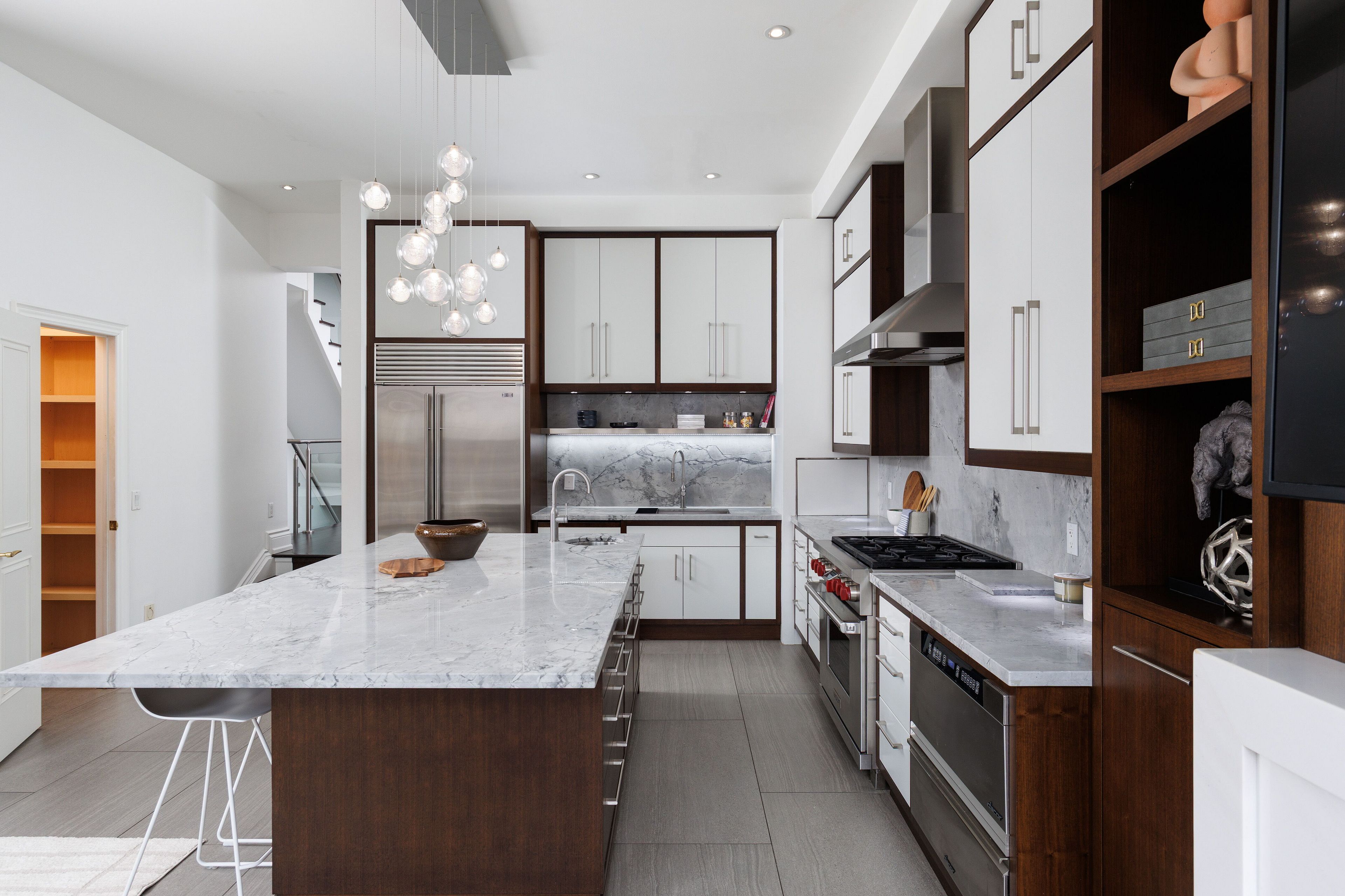 • Custom kitchen with high-end appliances and large island for cooking and entertaining.