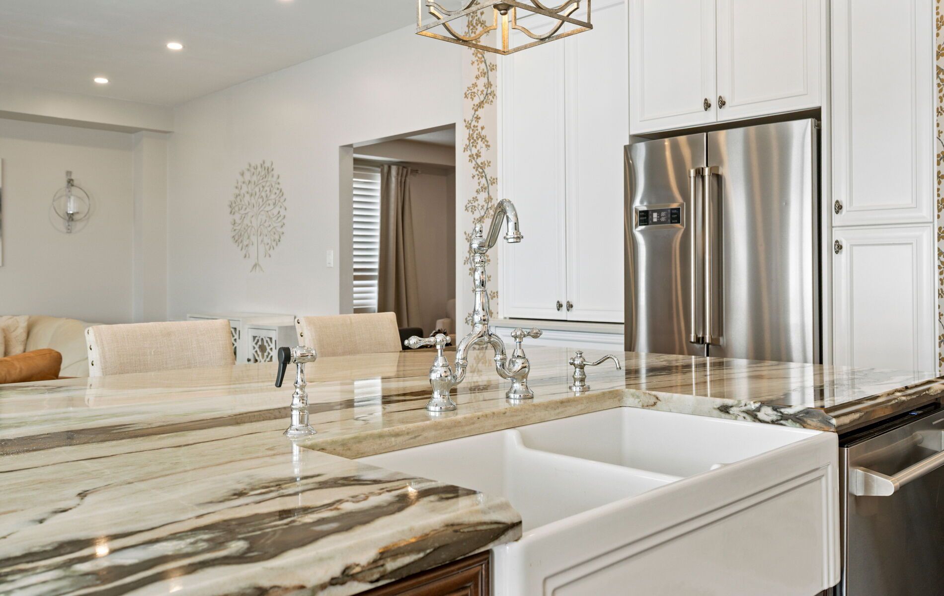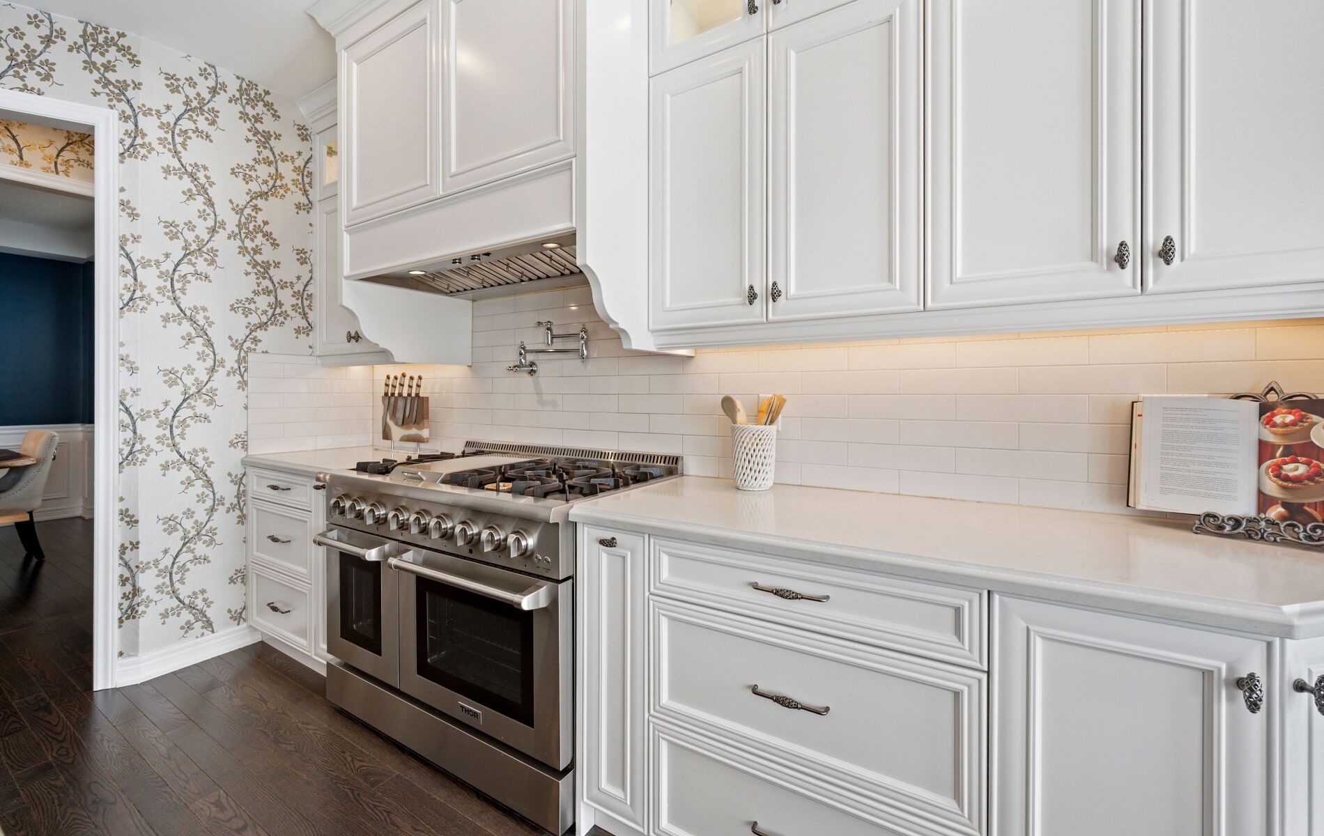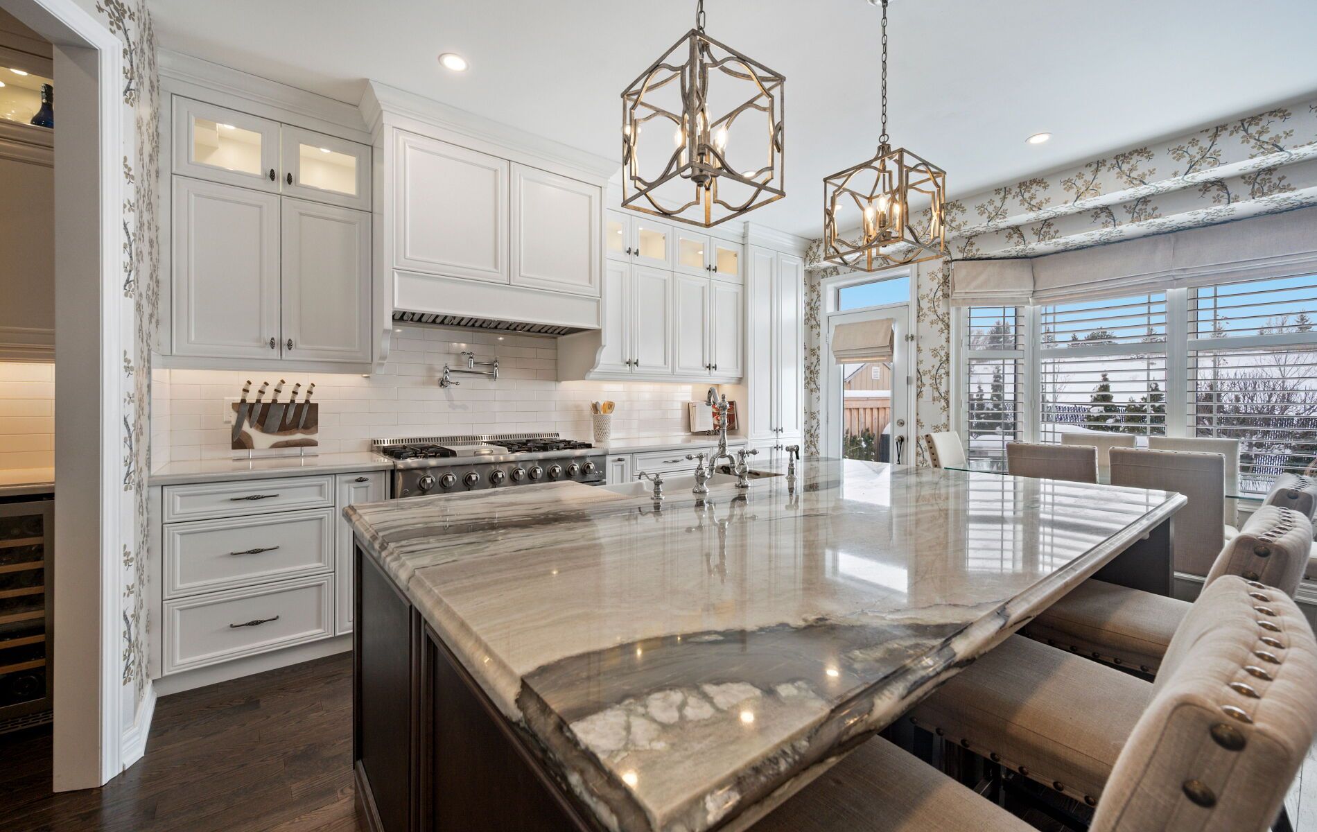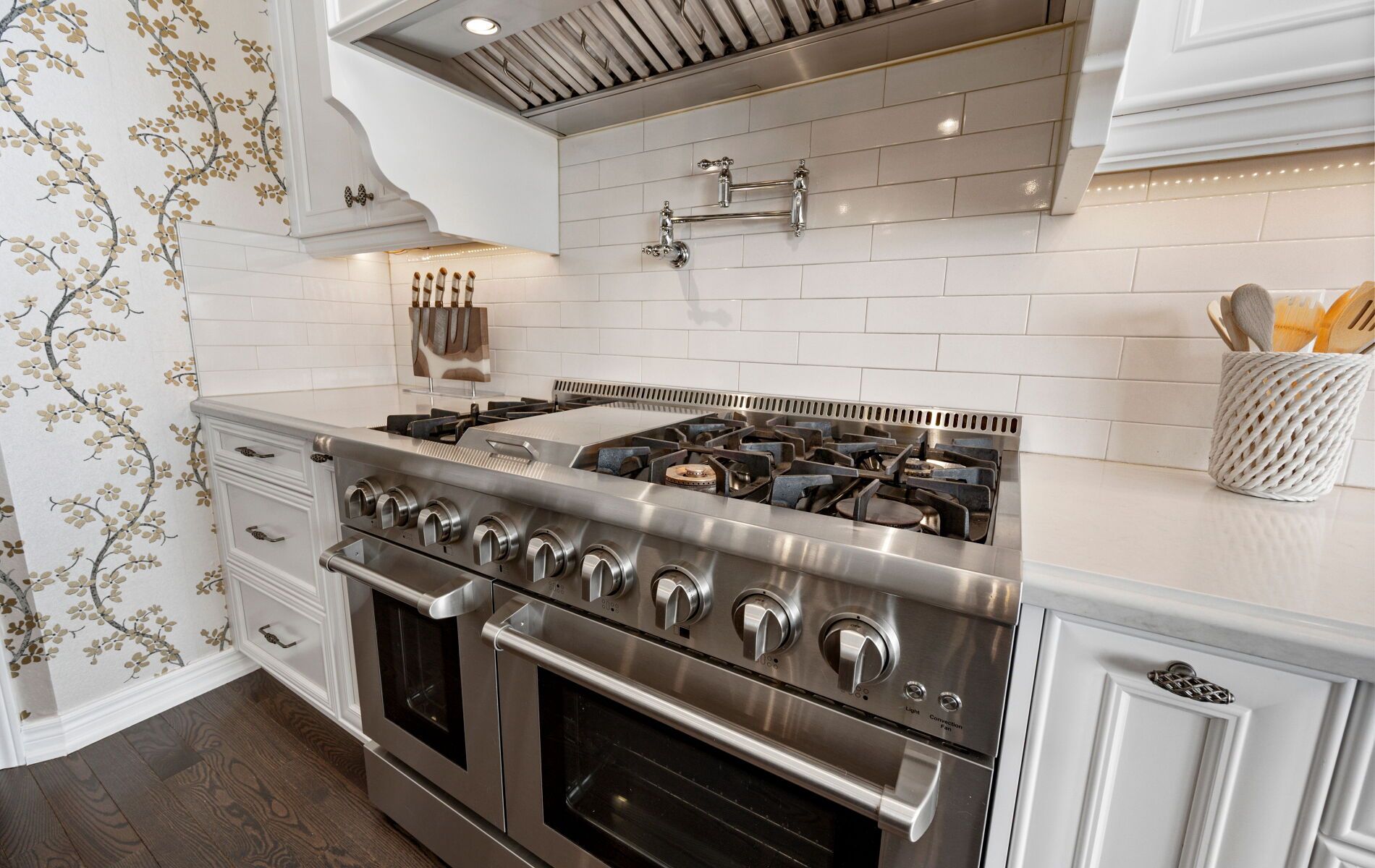 • Chef's dream kitchen featuring renovated Quartzite island and six-burner dual fuel range.