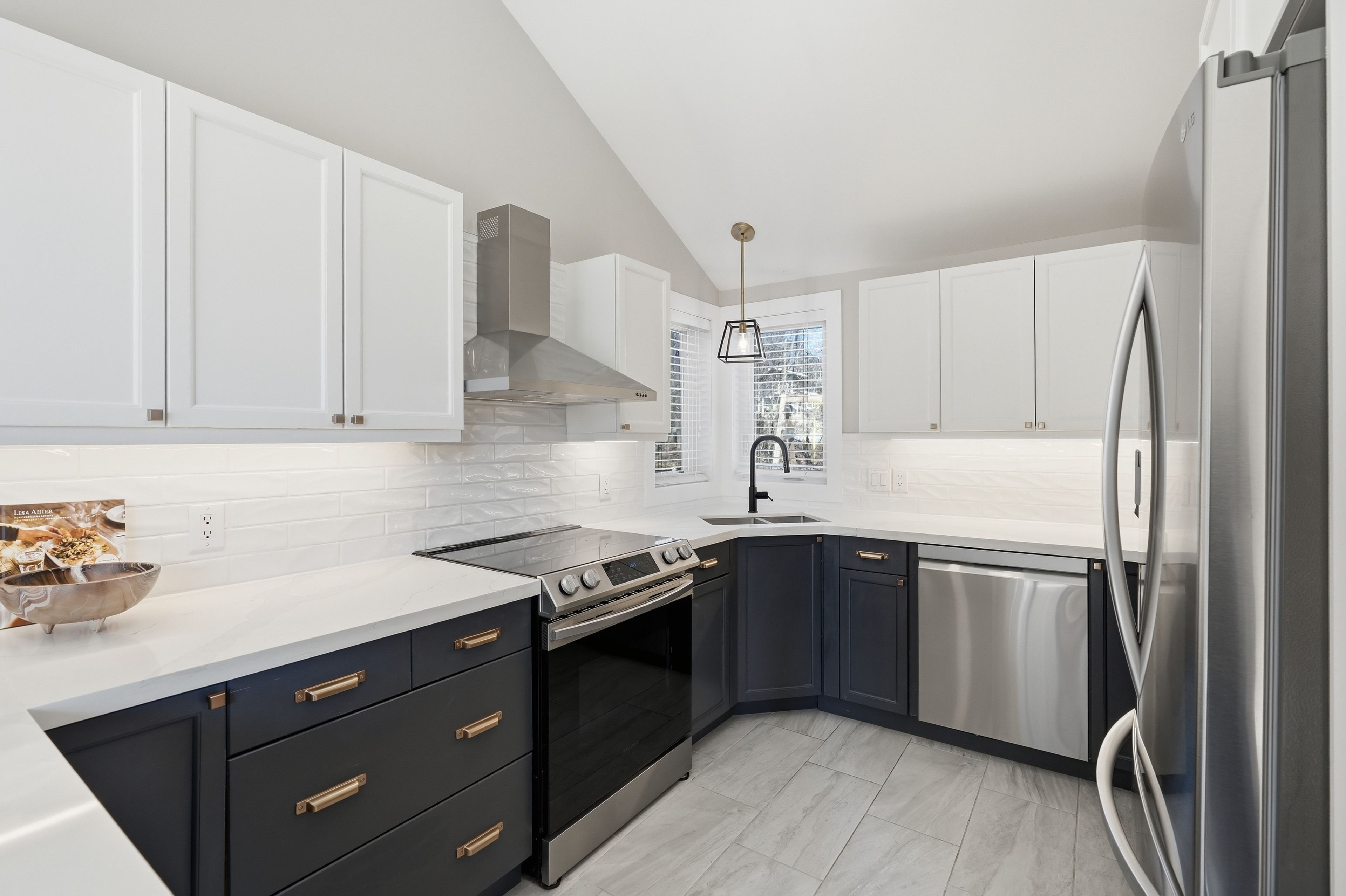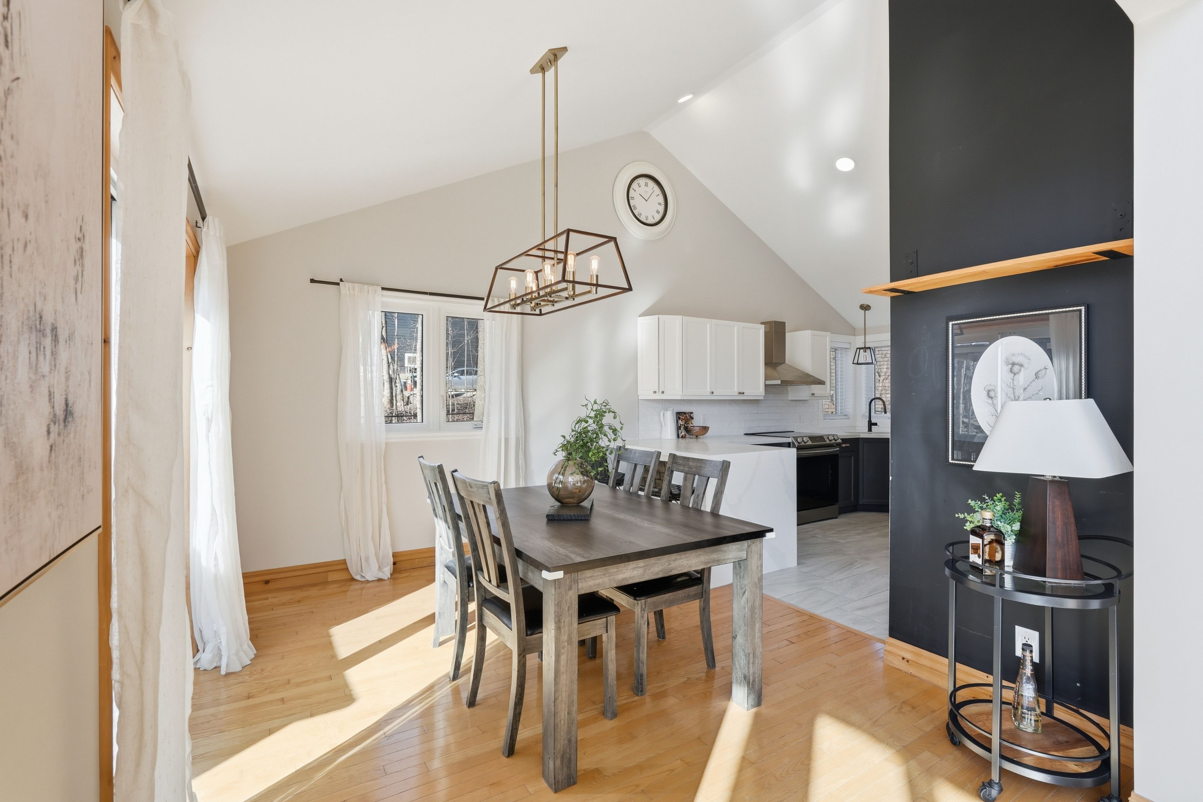 • Renovated kitchen flows into living area with hardwood floors and fireplace.