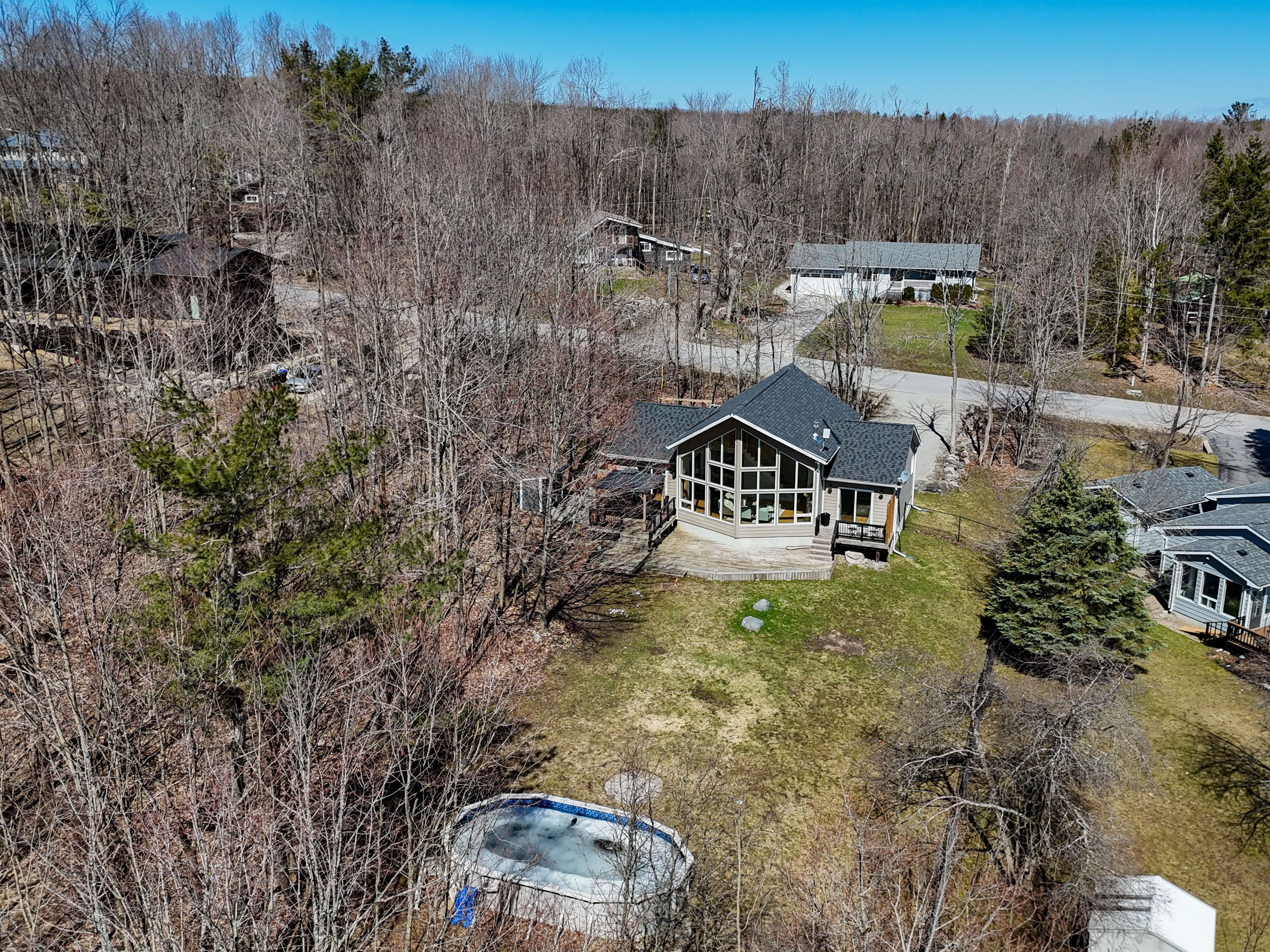 Discover this unique open concept viceroy home, perfectly nestled on a private, wooded lot just steps from skiing at mt. St. Louis/moonstone and year round hiking trails. Set on just under half an acre, this property offers a rare opportunity to enjoy peaceful, nature filled surroundings while remaining only 18 minutes from barrie with easy access to highway 400 and key amenities. Designed to impress, the home features soaring cathedral ceilings and stunning floor-to-ceiling windows that flood the space with natural light. The beautifully renovated kitchen (2022) showcases stainless steel appliances and flows seamlessly into the main living area, complete with hardwood floors and a striking fireplace perfect for both everyday living and entertaining. The spacious primary bedroom offers a spa-like ensuite and a walk-out to a private balcony, creating a true retreat. A standout feature of the home is the expansive loft space, ideal as a home office, additional bedroom, or versatile recreation area. The fully finished lower level (2022) adds incredible flexibility, offering additional bedrooms, a rec room, home office or gym, perfect for growing families or multi-use living. Step outside to a fully fenced yard with ample space to relax and entertain, featuring an above-ground pool perfect for summer enjoyment, and parking for up to 8 vehicles. Additional updates include furnace and roof (2022) and pool liner and pump (2023), making this home truly move-in ready. Combining modern updates, functional living space, and an unbeatable location, this is a rare opportunity to own a one of a kind home in a highly sought after area. Welcome home.