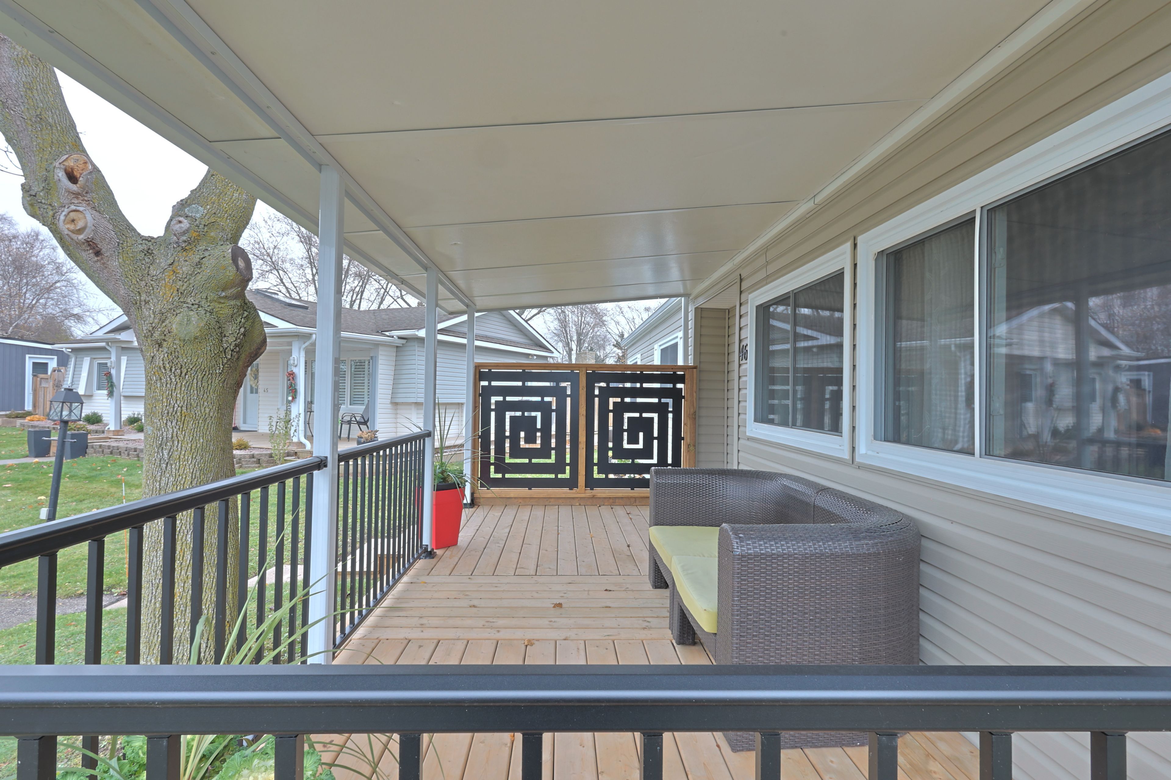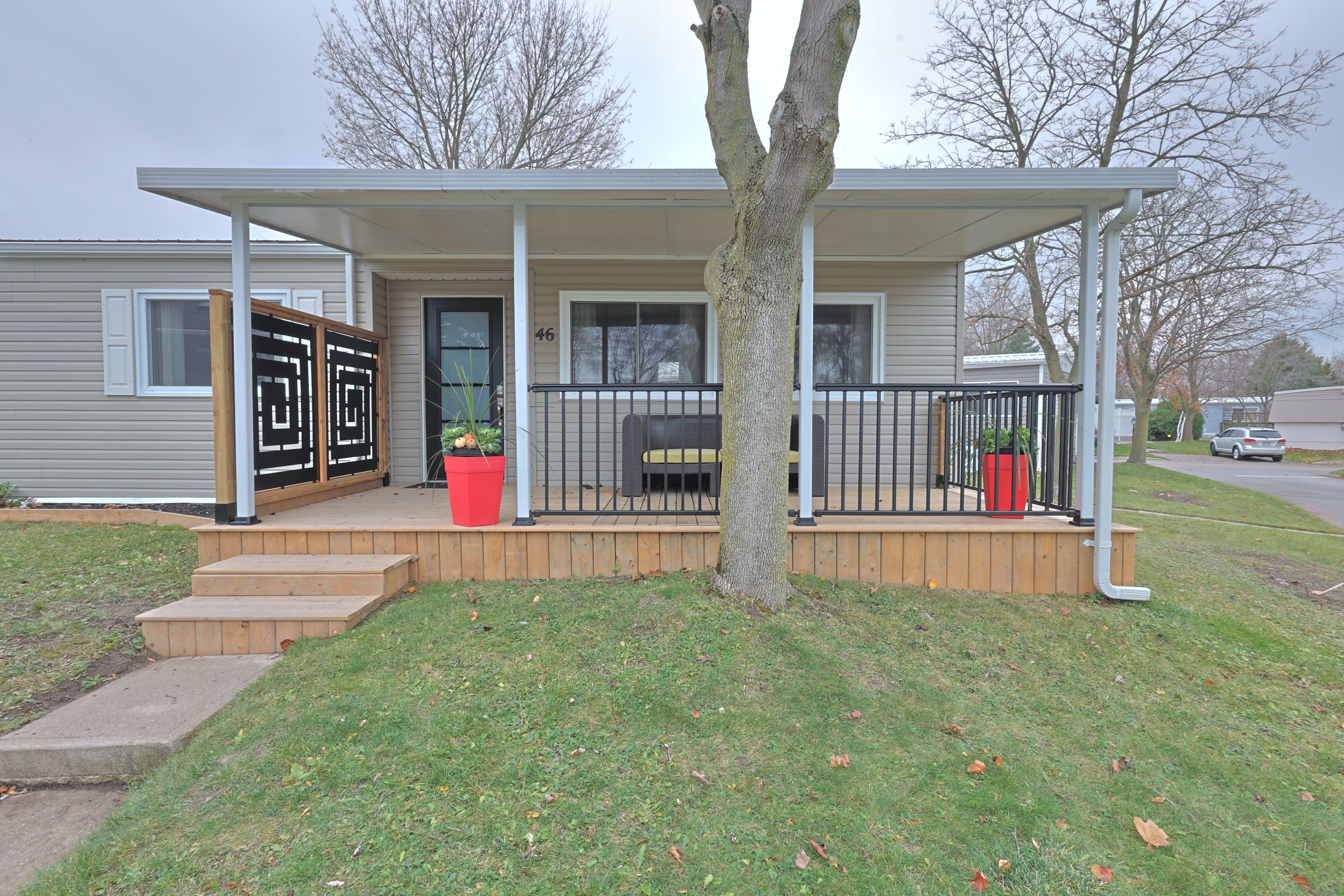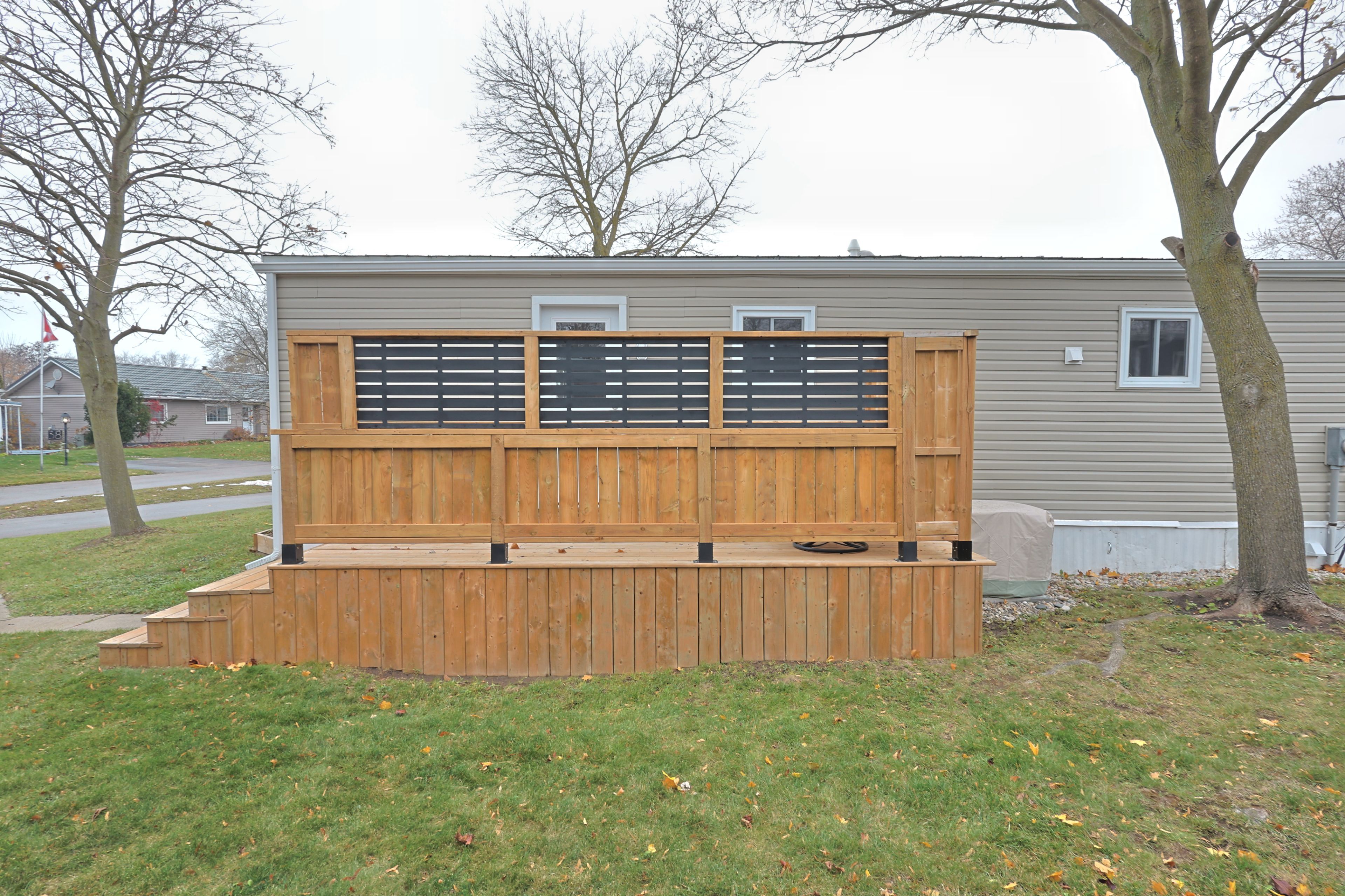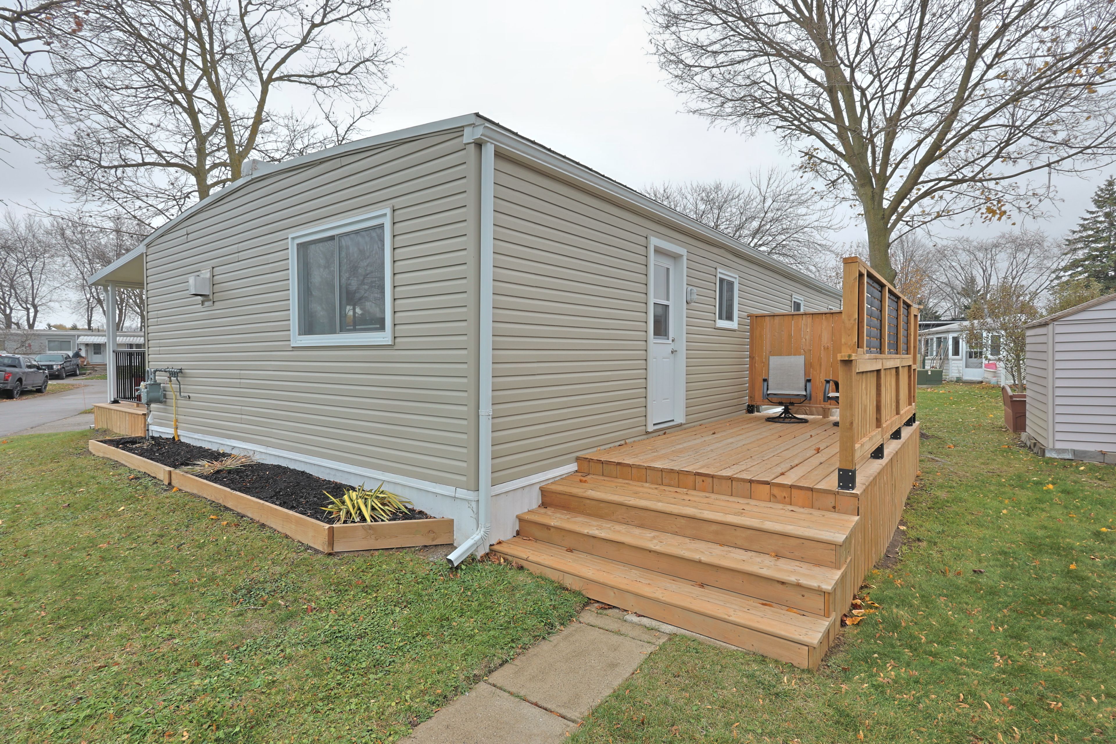 Fully updated in 2024 for under $300k! Welcome to 46 st andrews pl, grand bend where you find an incredible blend of updates and value in grand cove estates. Updated exterior with vinyl siding, vinyl windows, doors, metal roof, decks, privacy fences and more. Spacious 20'x8' front covered porch leads you inside to your fully updated home. Interior floorplan was changed to allow for open concept living area with lots of windows for natural light. Luxury vinyl plank flooring throughout the home. Living room features a gas fireplace with surround. Kitchen offers eat-up island, new appliances, tiled backsplash, lots of counter space, food pantry & more. Dining area off of kitchen with door to back deck for quick access to the bbq. Primary bedroom with walk-through closet, that is outfitted with stackable laundry machines, leading to the two piece ensuite. Floorplan allows for another bedroom and main full three piece bathroom with tiled shower. 16'x7' back deck off of kitchen with privacy fence offers more space to relax! Grand cove estates is a 55+ land lease community located in the heart of grand bend. Grand cove has activities for everybody from the heated saltwater pool, tennis courts, woodworking shop, garden plots, lawn bowling, dog park, green space, nature trails and so much more. All this and you are only a short walk to downtown grand bend and the sandy beaches of lake huron with the world-famous sunsets. Monthly land lease fee of $869. 39 includes land lease, access to all amenities and taxes.