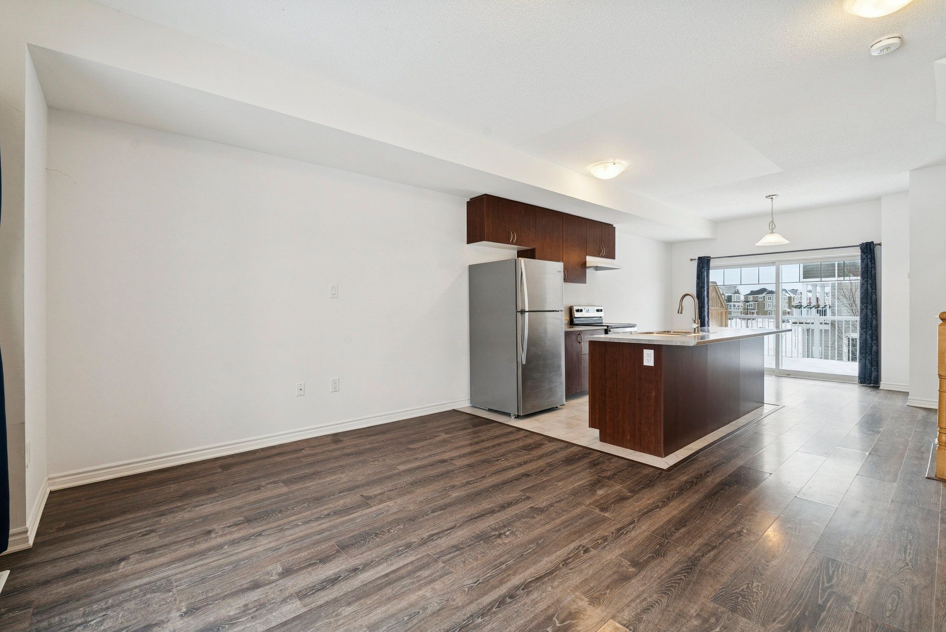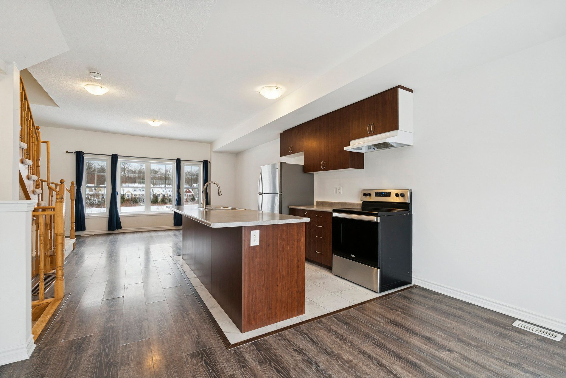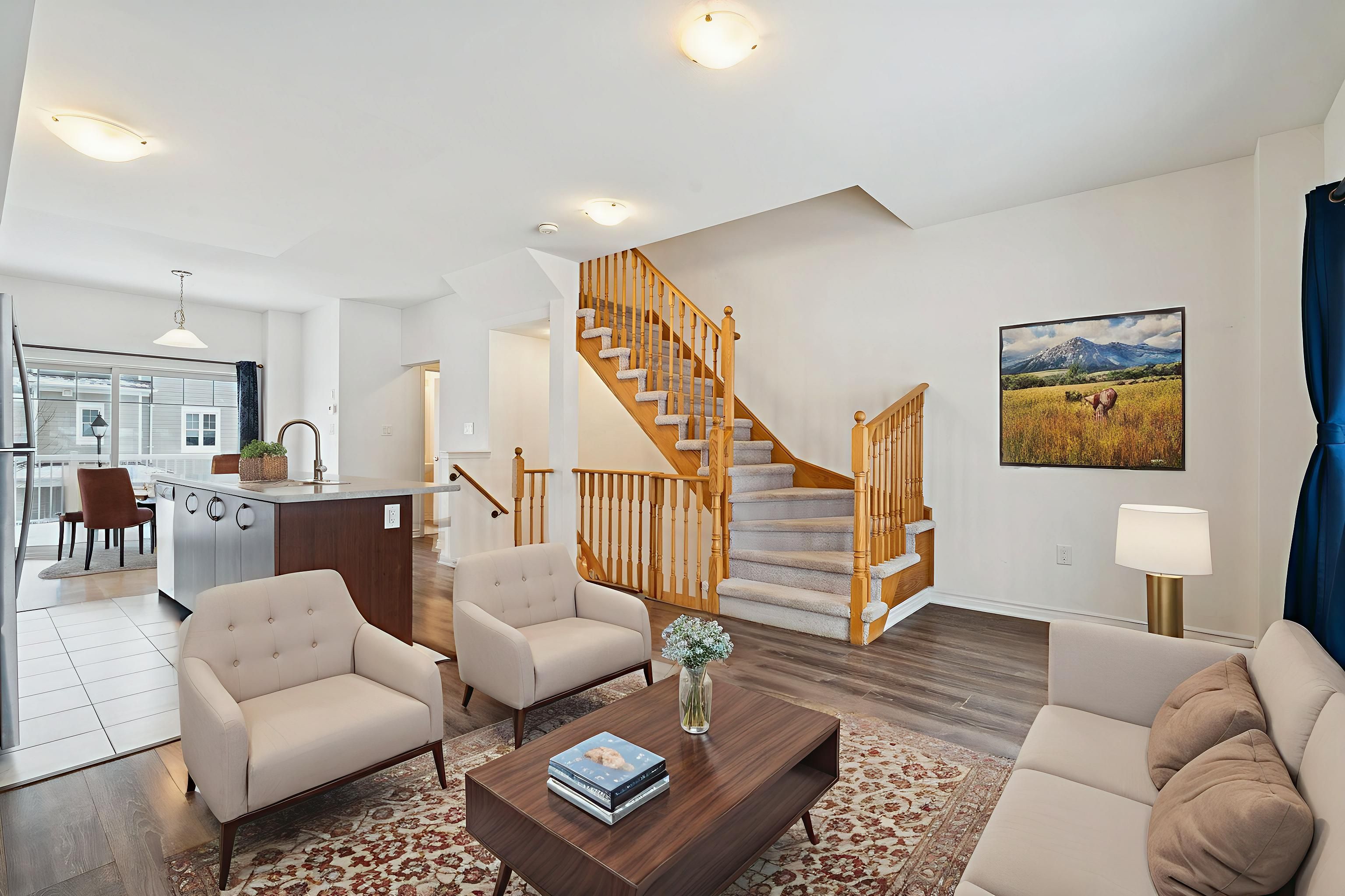 • Open-concept main living area with a modern kitchen and large island.