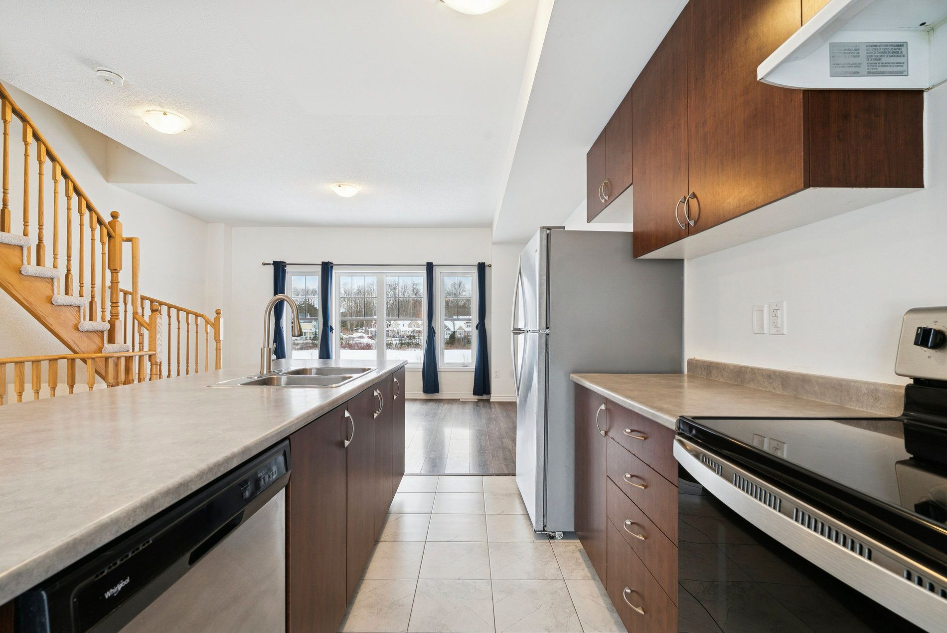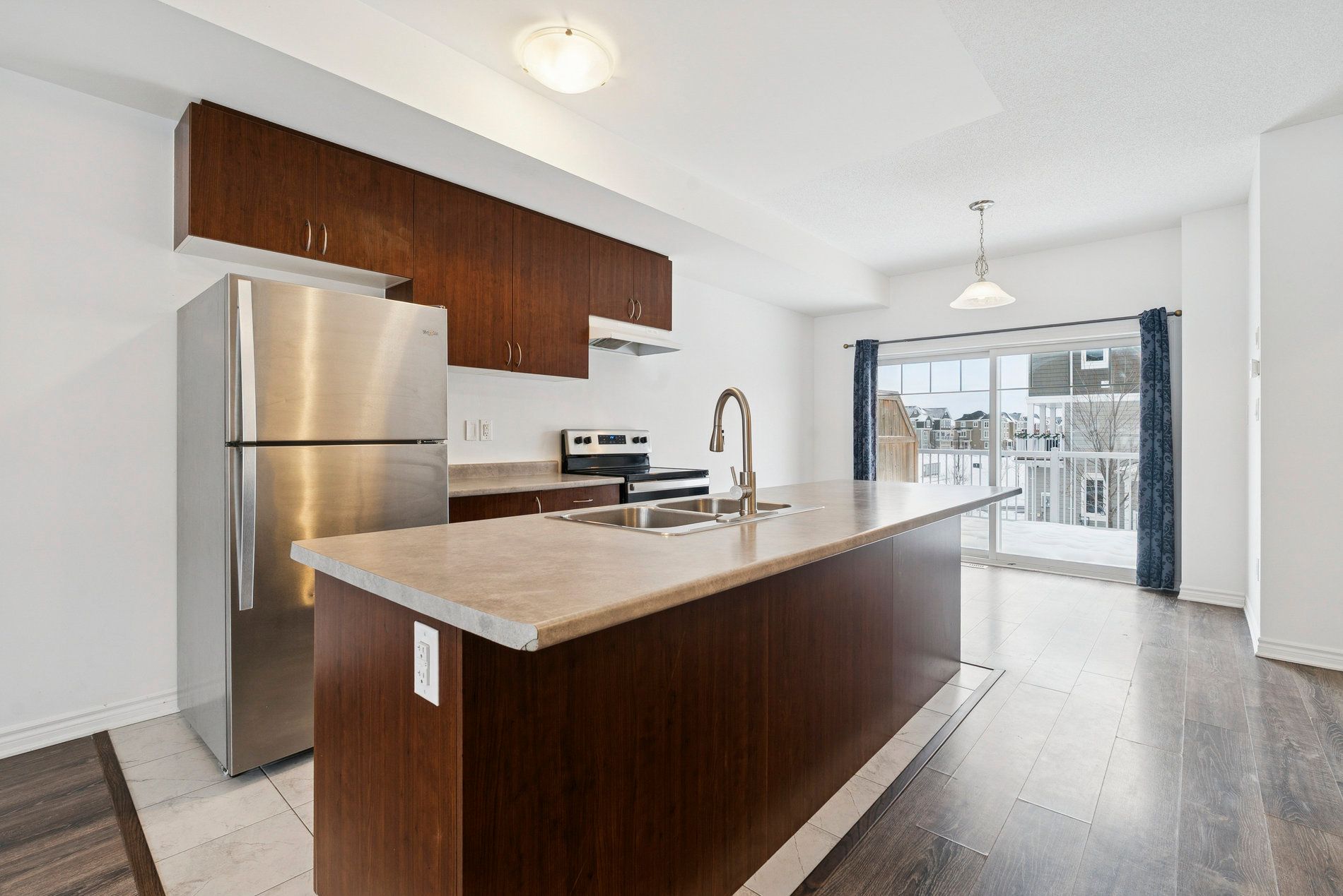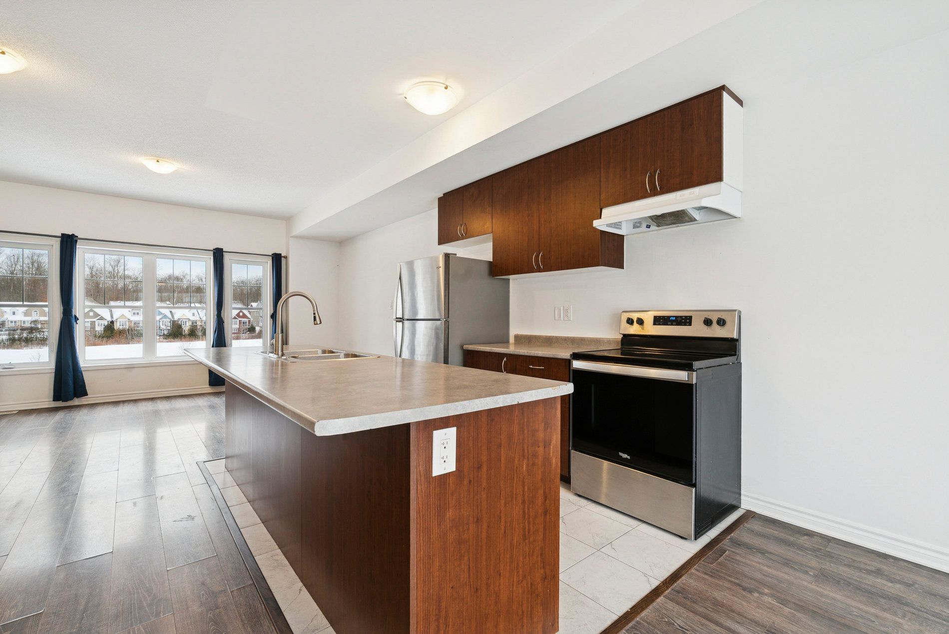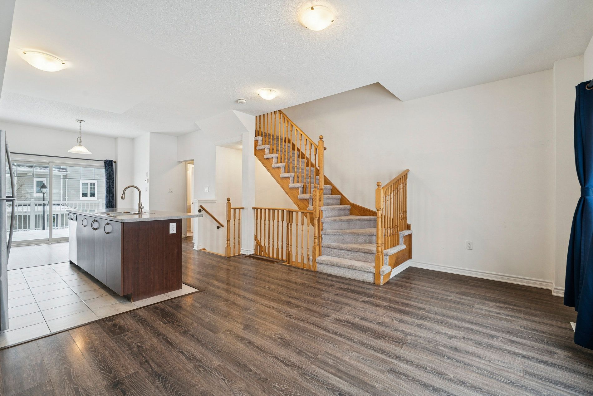 • Open-concept main living area with a modern kitchen and large island.