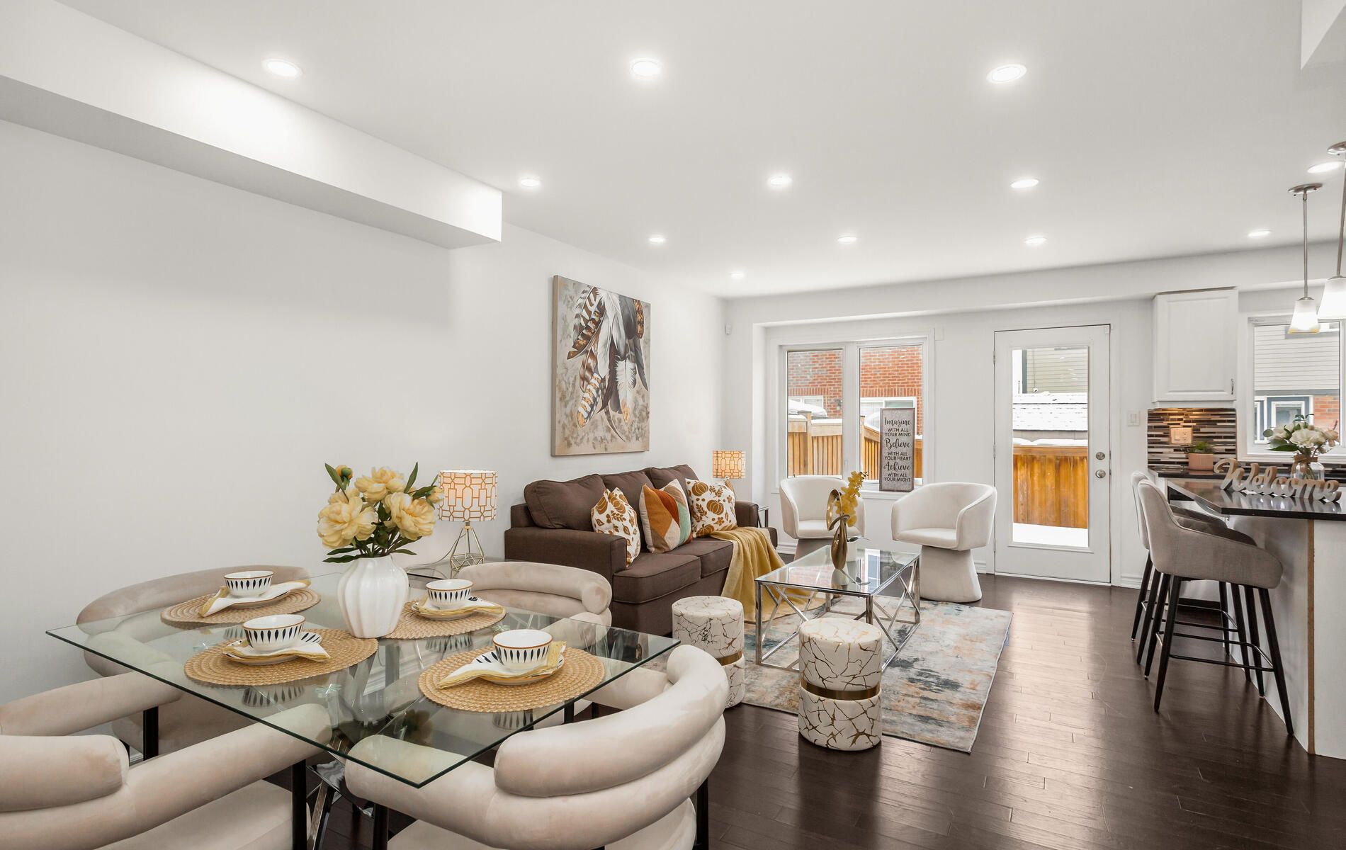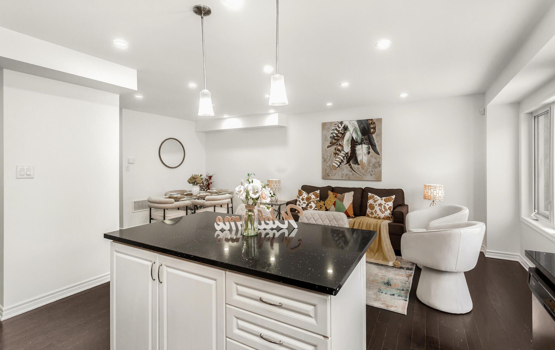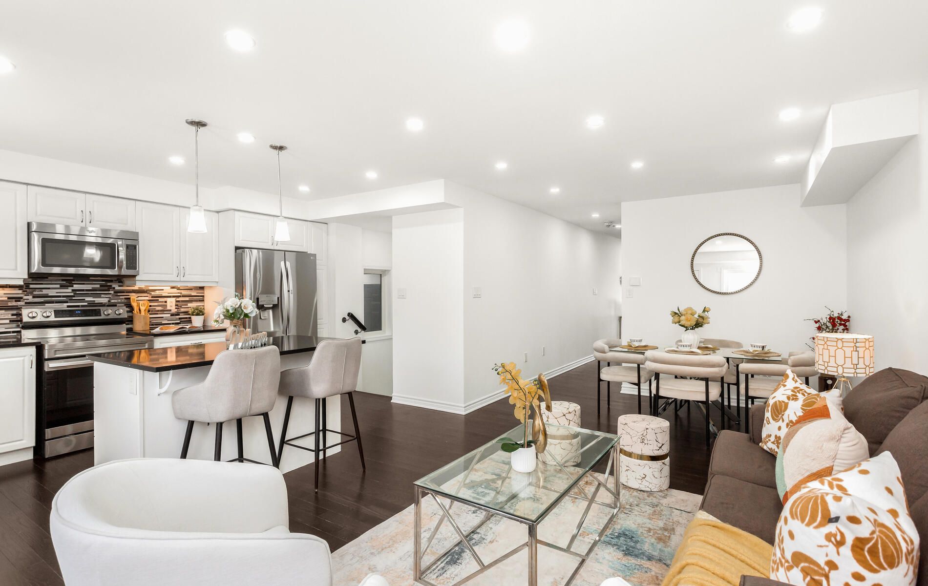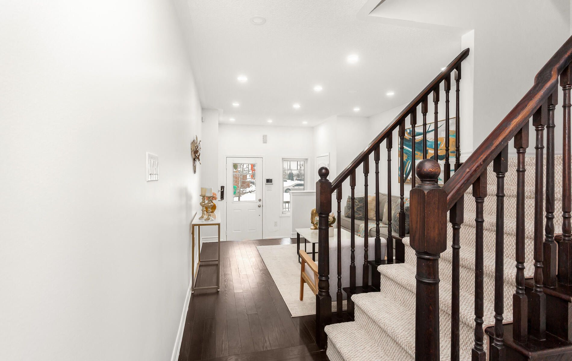 Absolutely stunning, sun-filled freehold 2-storey townhouse offering an impressive foyer and a highly functional layout. Features separate living and family rooms with a combined dining area, hardwood flooring throughout the main level, and abundant pot lights. Upgraded open-concept kitchen with granite countertops, central island, and stylish backsplash. Elegant oak staircase leads to four generously sized bedrooms, including a spacious fourth bedroom ideal as a second primary suite. Granite countertops in bathrooms and convenient second-floor laundry. Approximately 1,900 sq ft of move-in-ready living space, situated on a quiet, family-friendly street-perfect for a growing family. Steps to transit, park and everyday amenities.