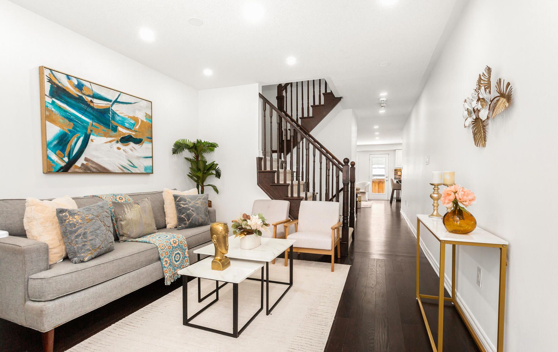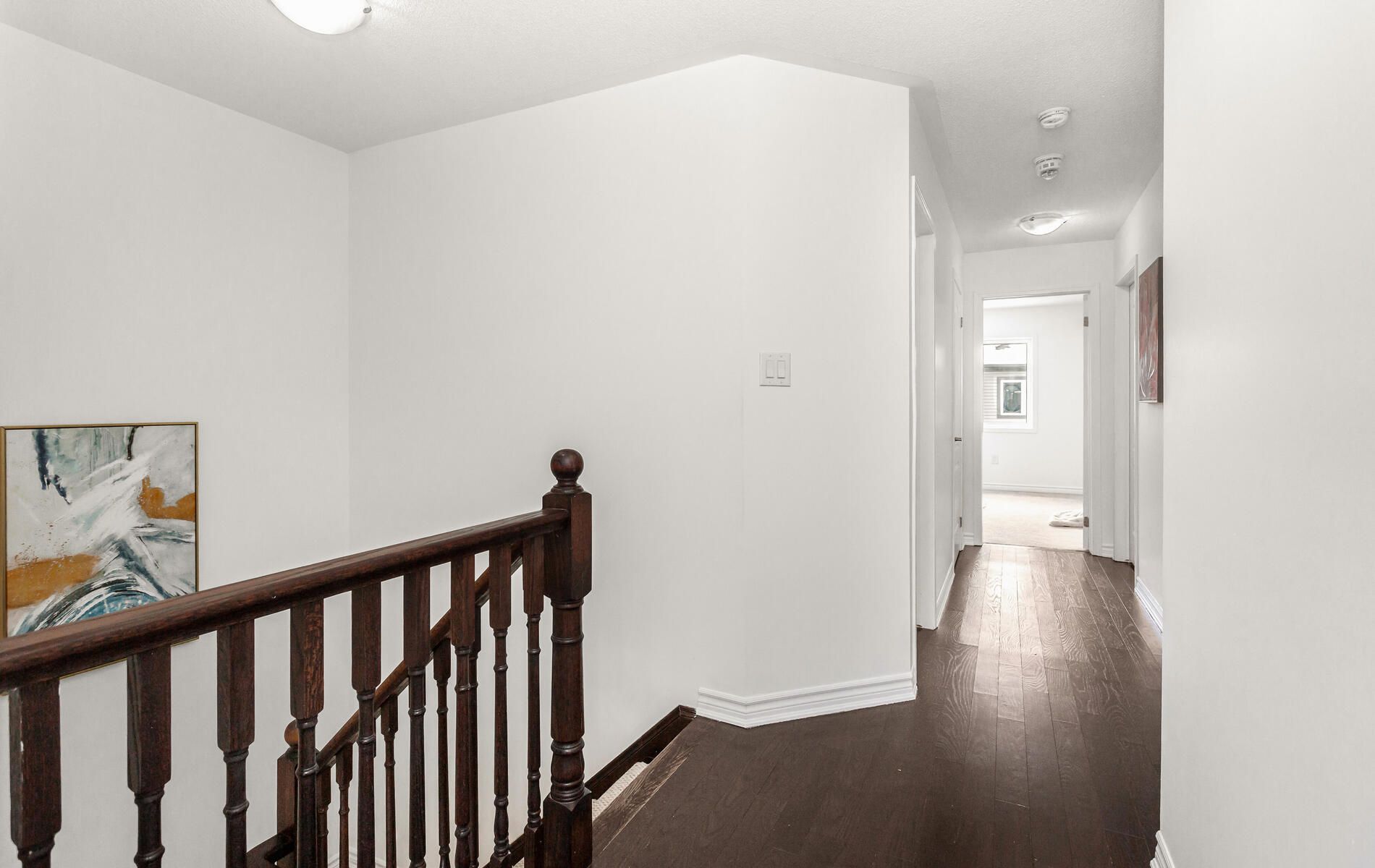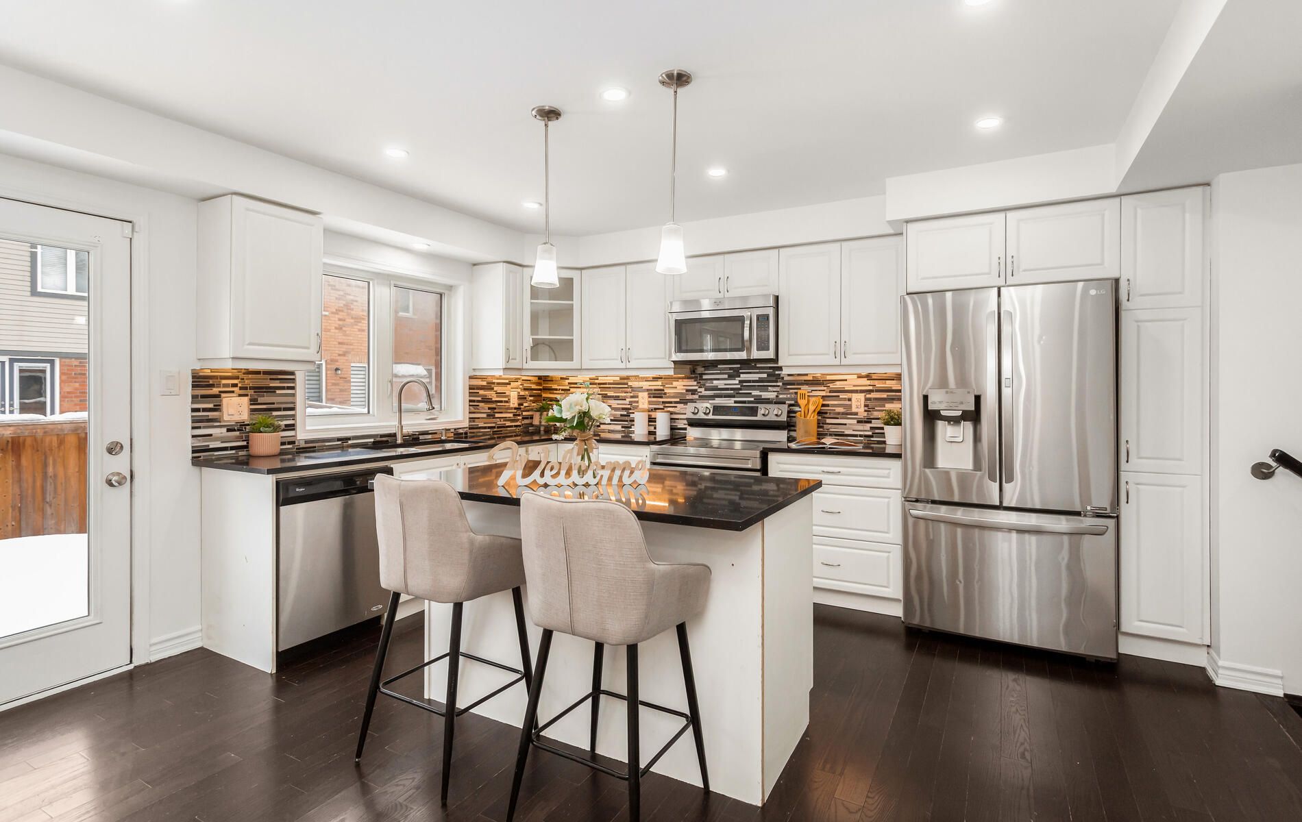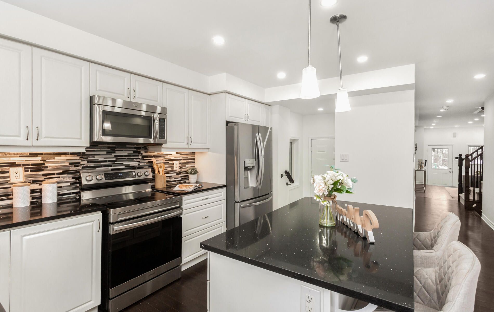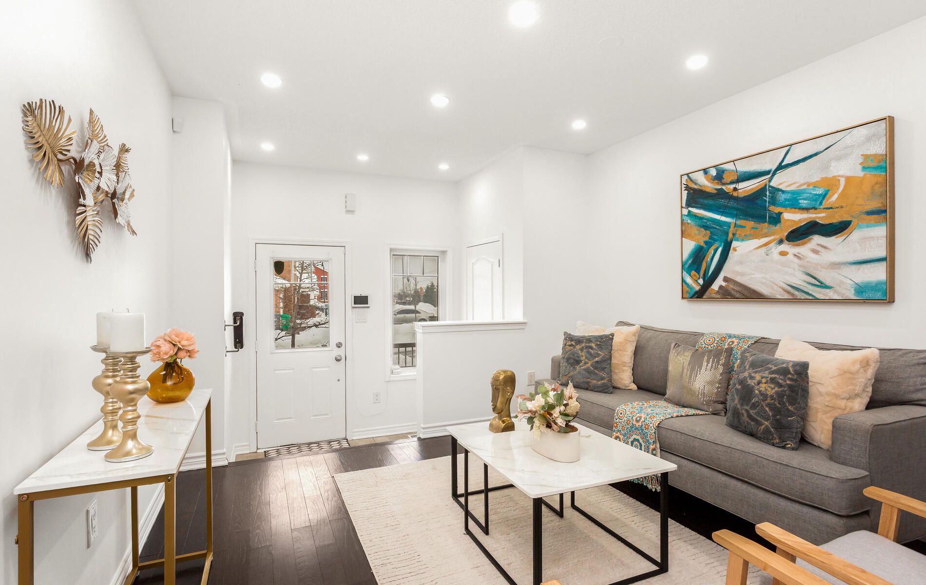 Absolutely stunning, sun-filled freehold 2-storey townhouse offering an impressive foyer and a highly functional layout. Features separate living and family rooms with a combined dining area, hardwood flooring throughout the main level, and abundant pot lights. Upgraded open-concept kitchen with granite countertops, central island, and stylish backsplash. Elegant oak staircase leads to four generously sized bedrooms, including a spacious fourth bedroom ideal as a second primary suite. Granite countertops in bathrooms and convenient second-floor laundry. Approximately 1,900 sq ft of move-in-ready living space, situated on a quiet, family-friendly street-perfect for a growing family. Steps to transit, park and everyday amenities.