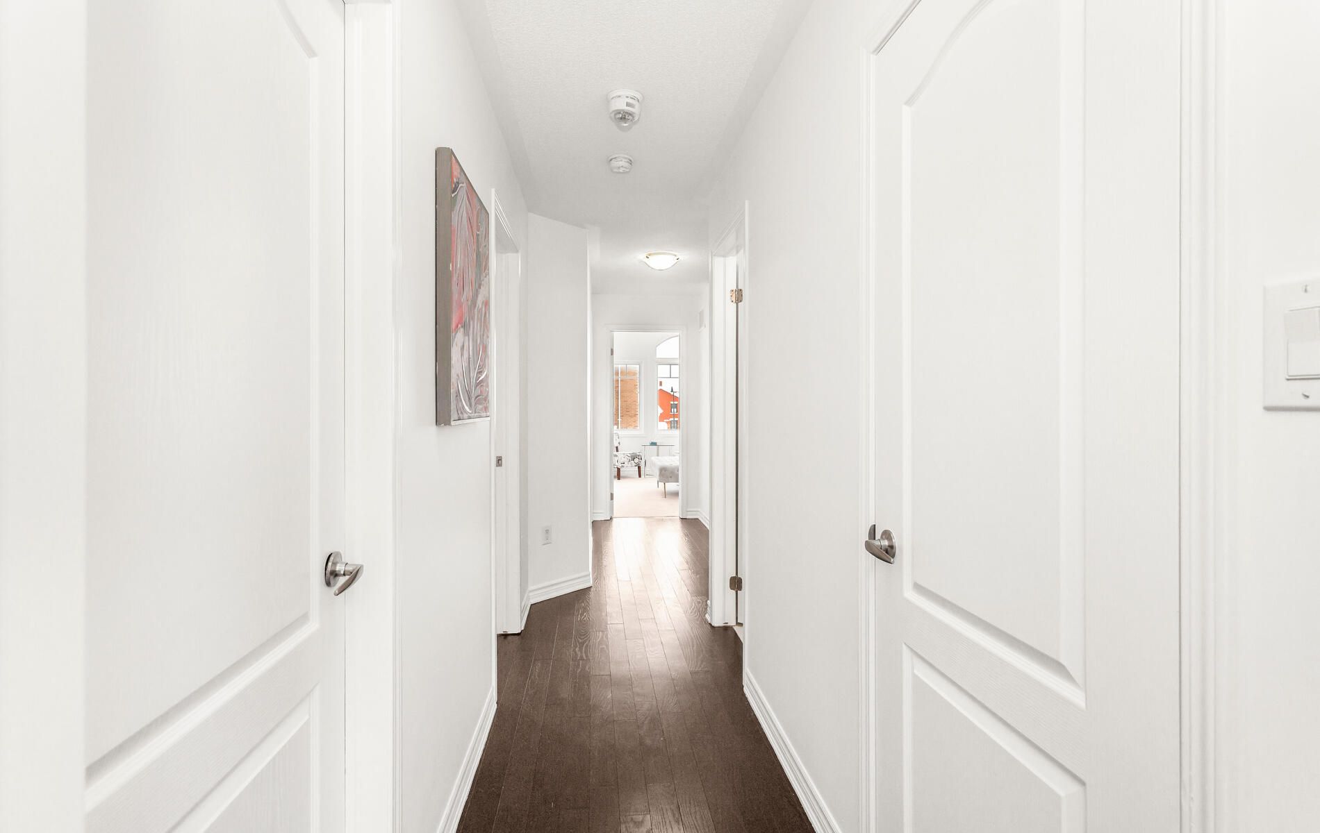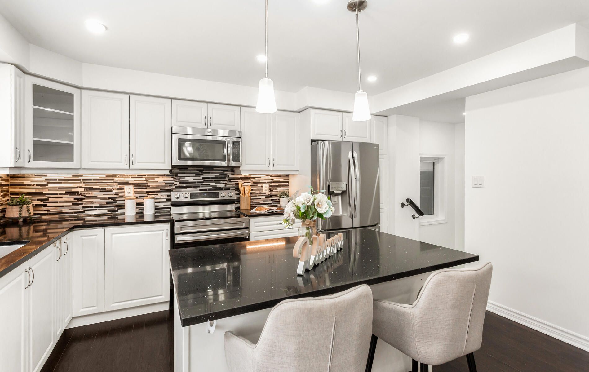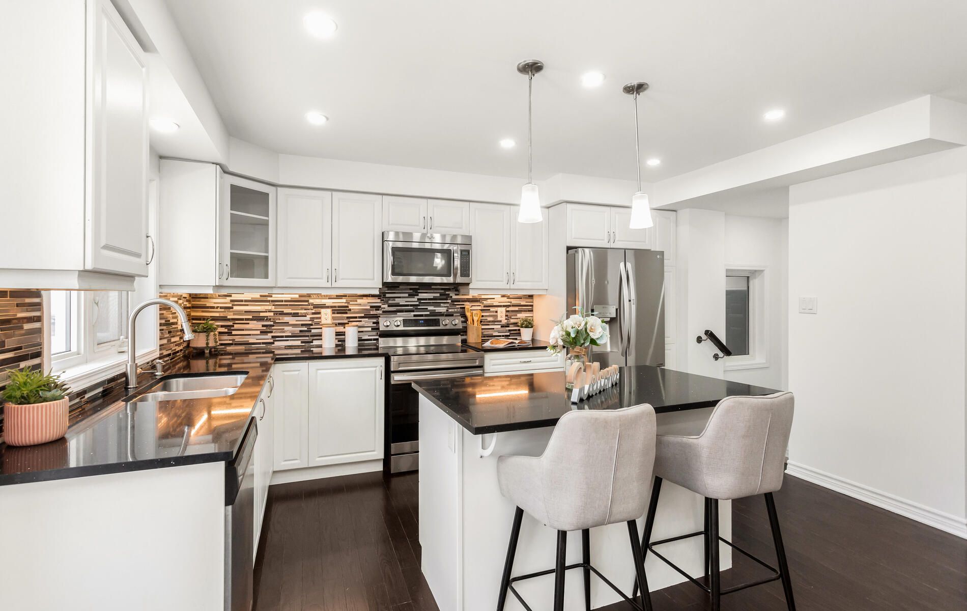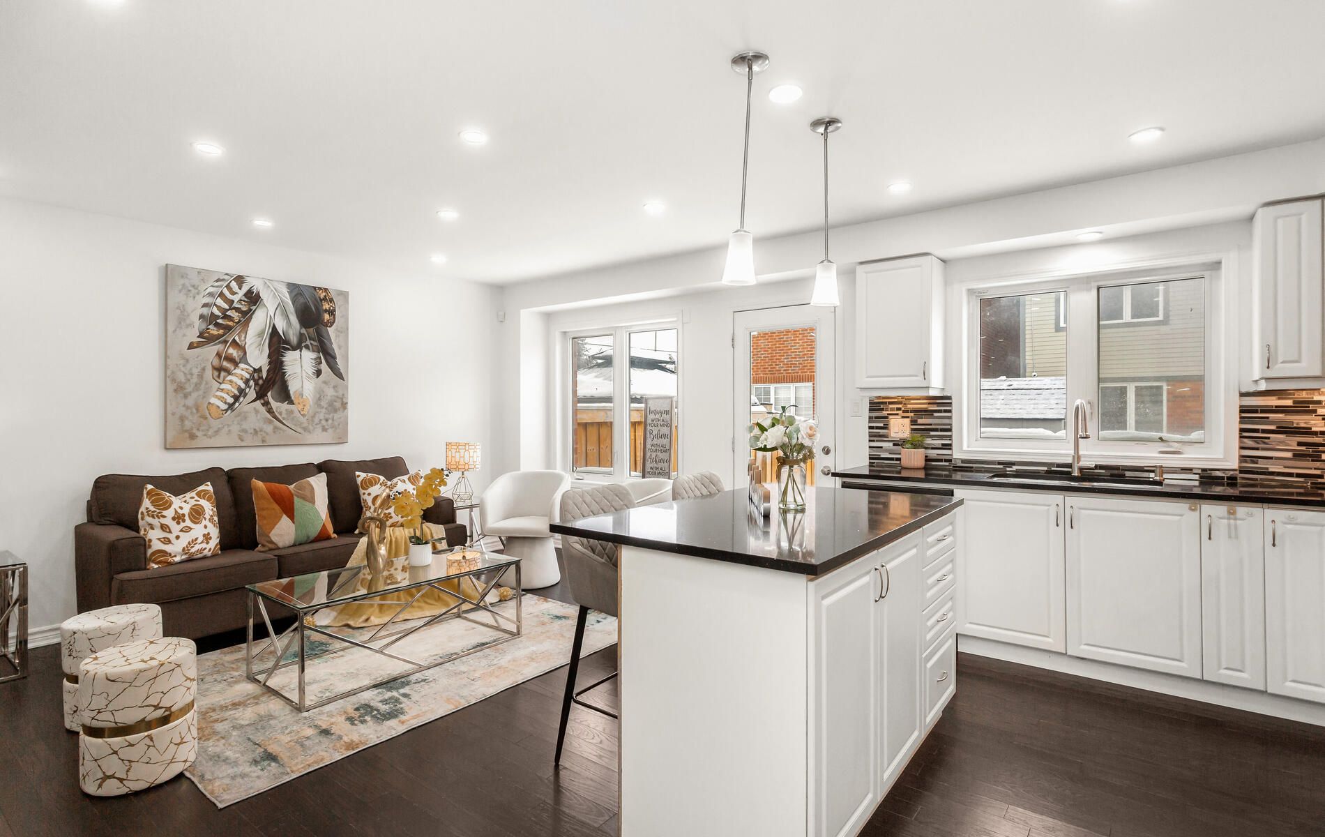 Absolutely stunning, sun-filled freehold 2-storey townhouse offering an impressive foyer and a highly functional layout. Features separate living and family rooms with a combined dining area, hardwood flooring throughout the main level, and abundant pot lights. Upgraded open-concept kitchen with granite countertops, central island, and stylish backsplash. Elegant oak staircase leads to four generously sized bedrooms, including a spacious fourth bedroom ideal as a second primary suite. Granite countertops in bathrooms and convenient second-floor laundry. Approximately 1,900 sq ft of move-in-ready living space, situated on a quiet, family-friendly street-perfect for a growing family. Steps to transit, park and everyday amenities.