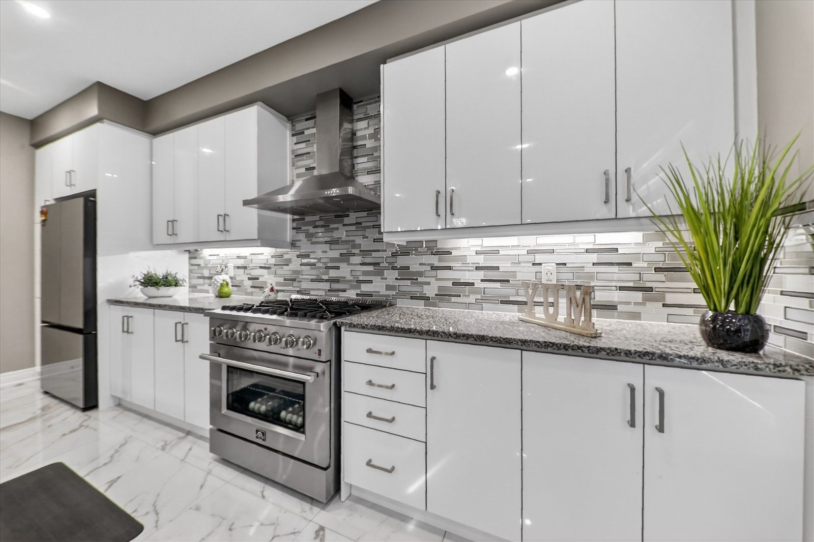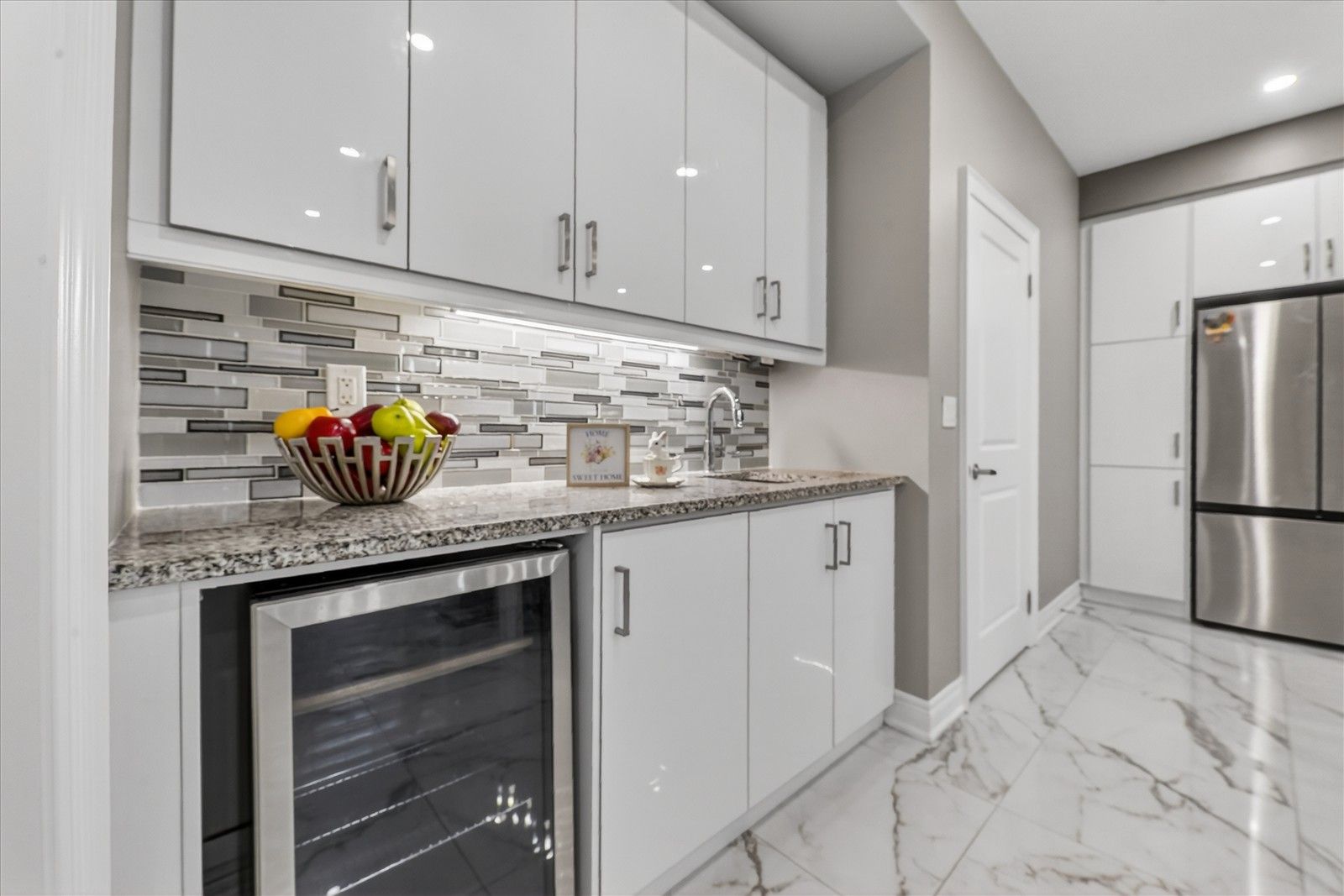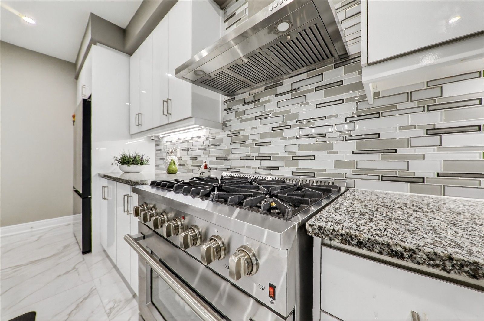 • Stylish kitchen with granite countertops and stainless steel appliances.
