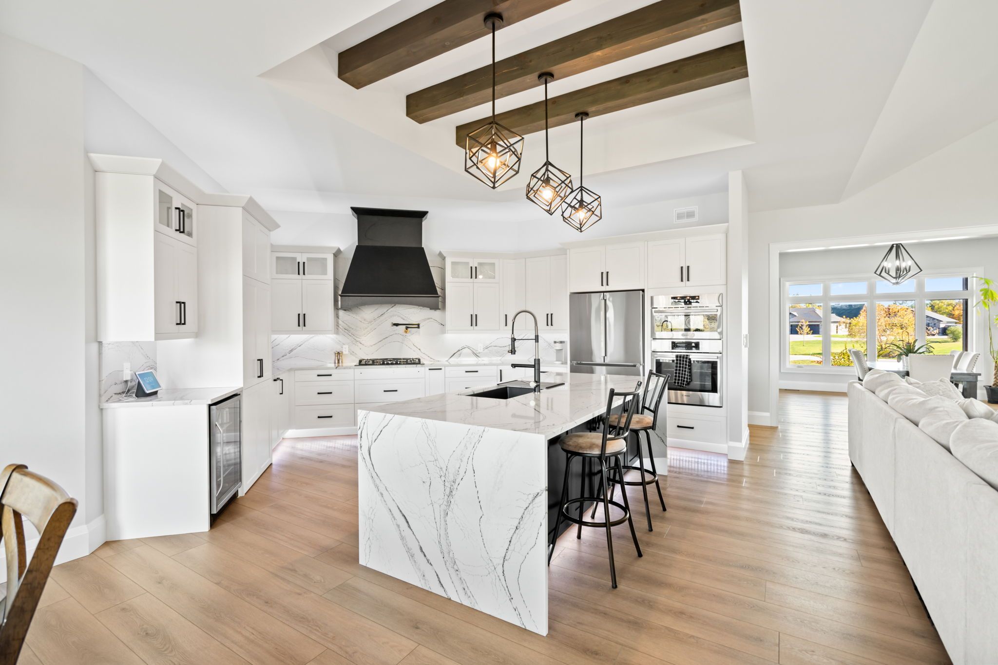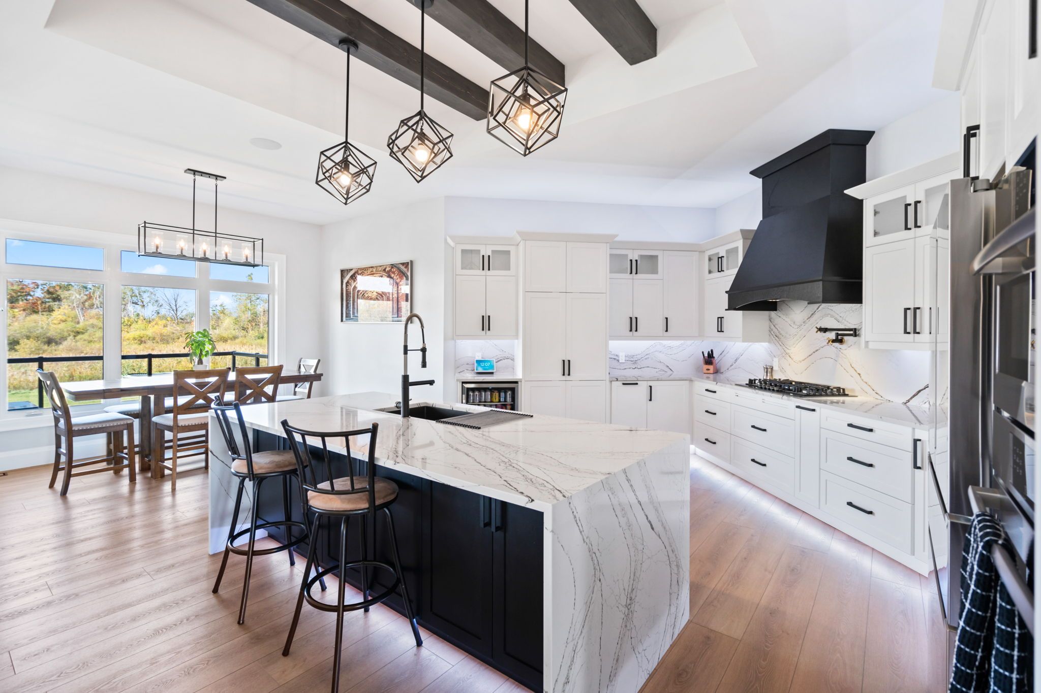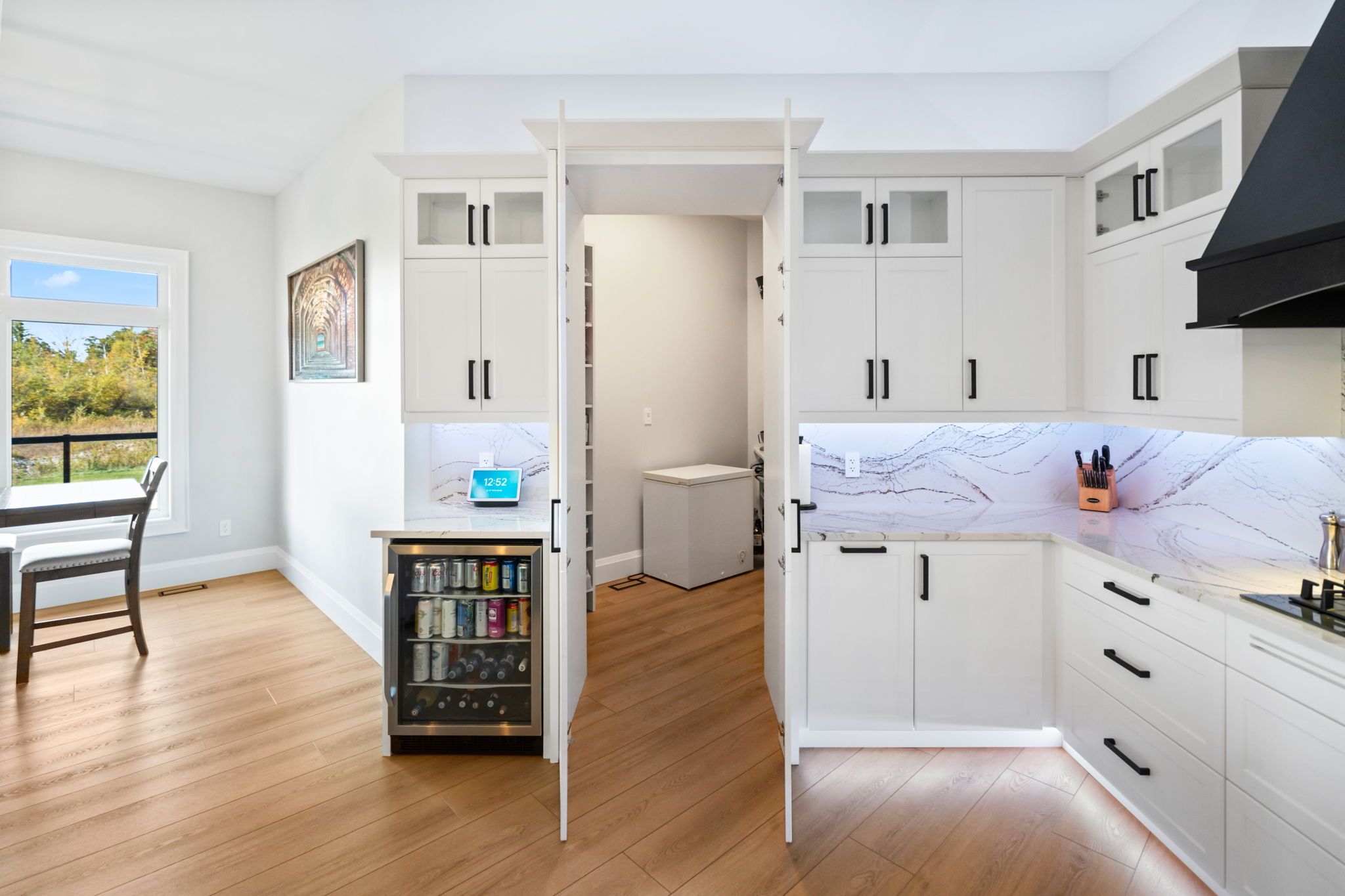 • Modern kitchen with luxurious countertops and a walk-in pantry for convenience.