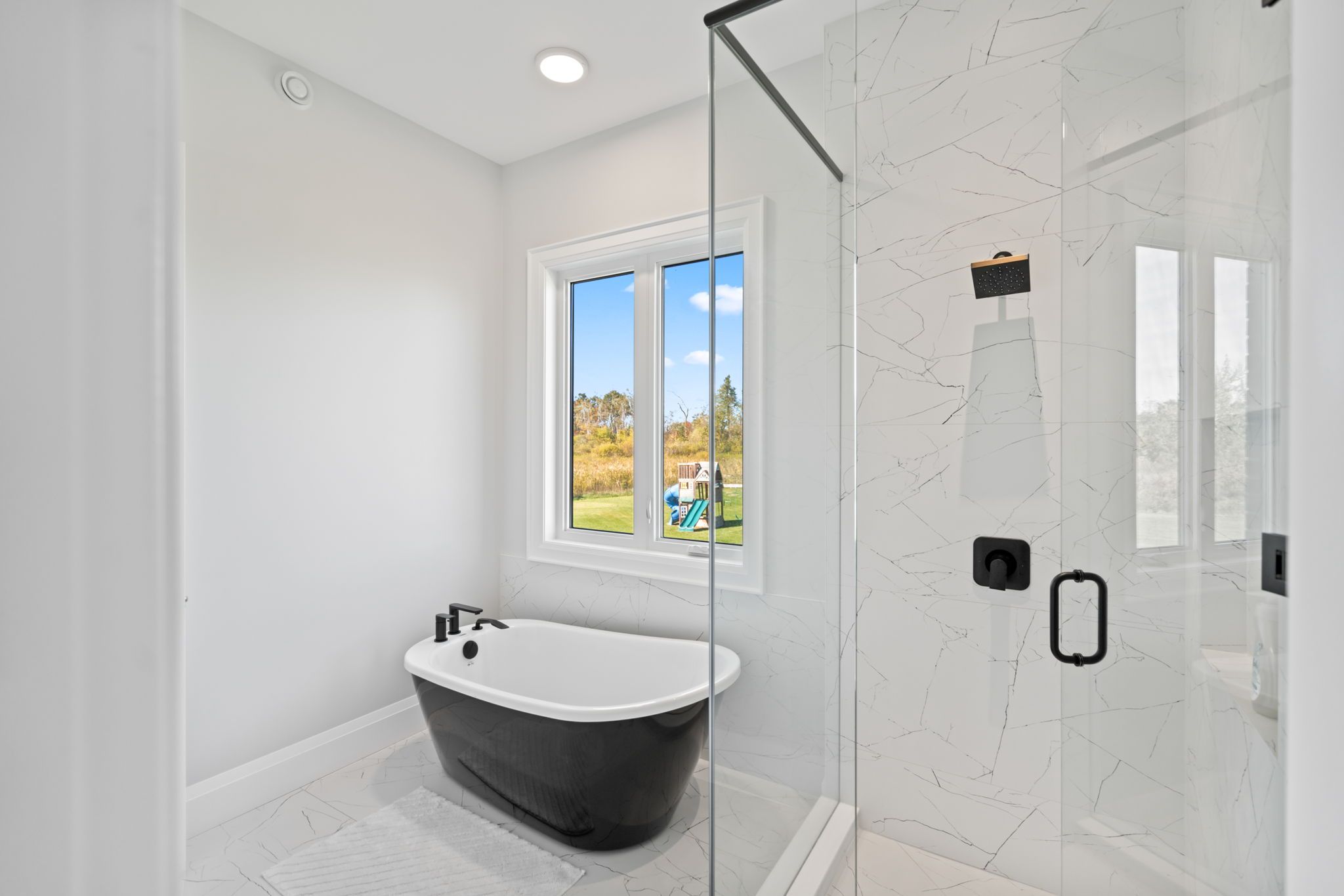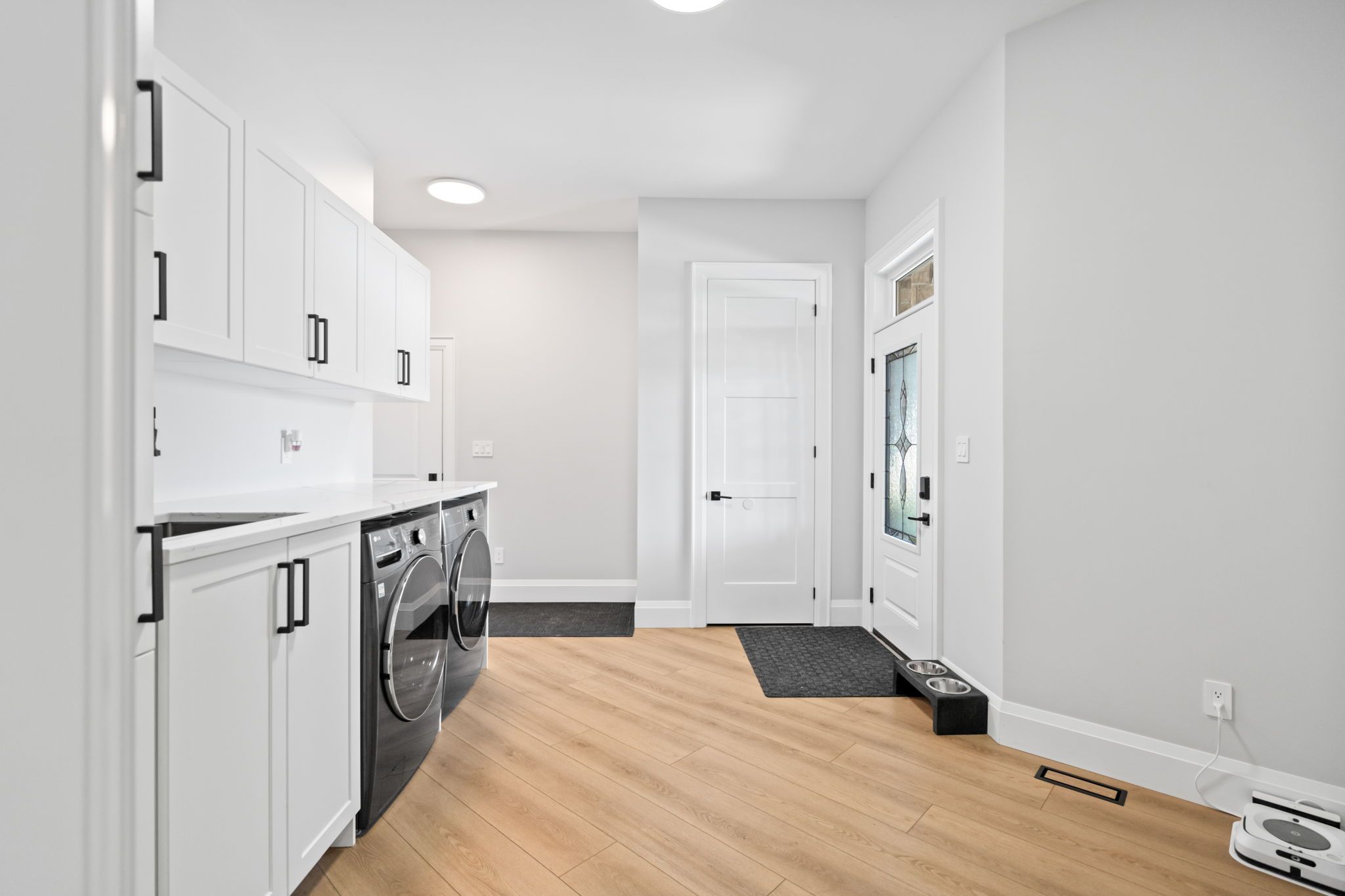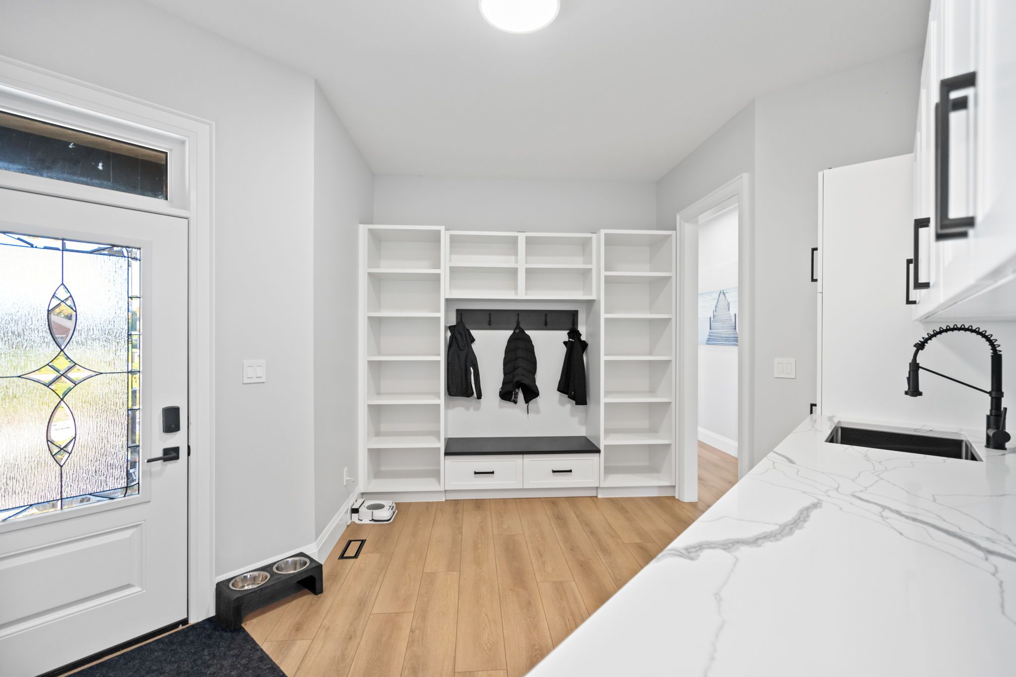 • Modern kitchen with luxurious countertops and a walk-in pantry for convenience.