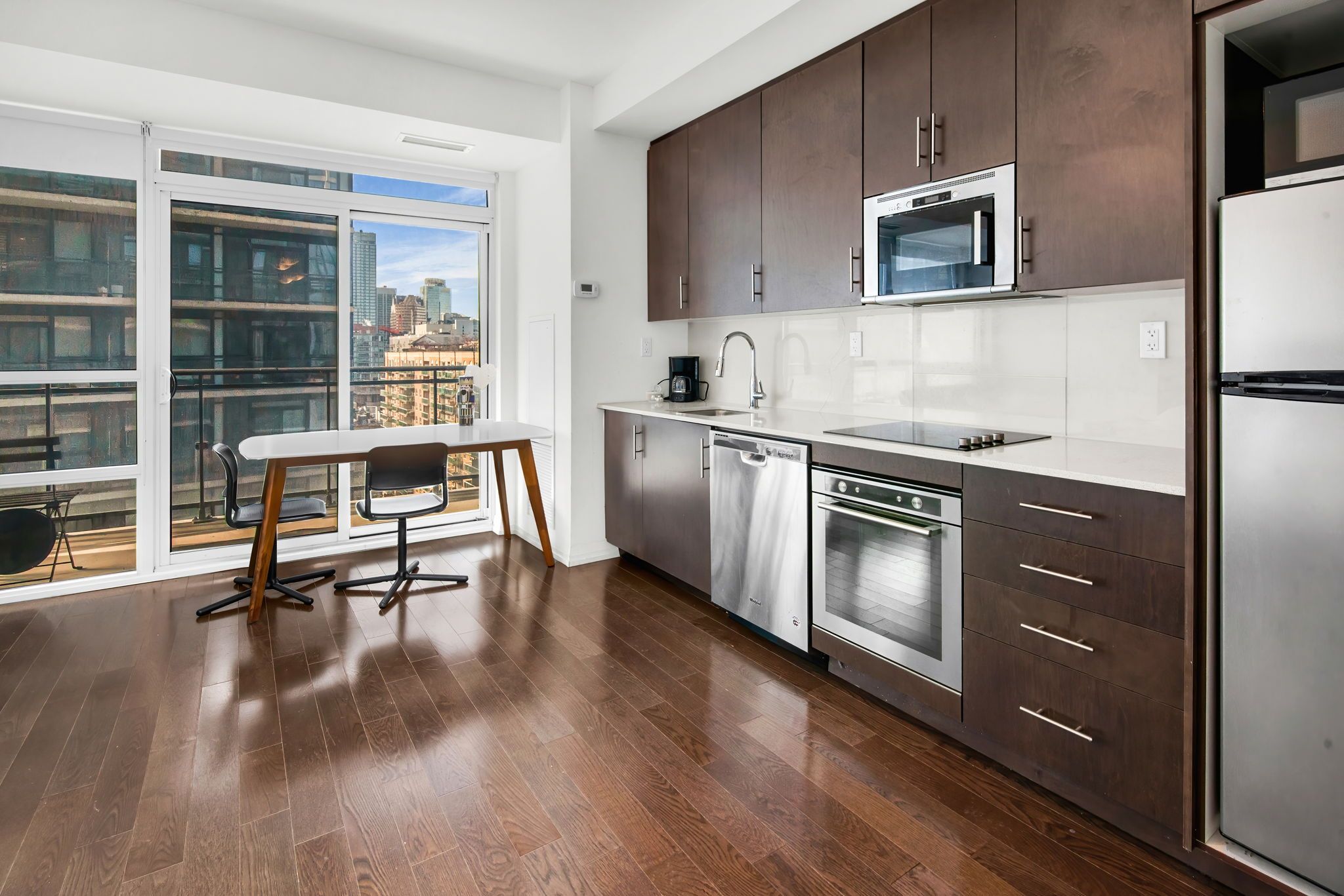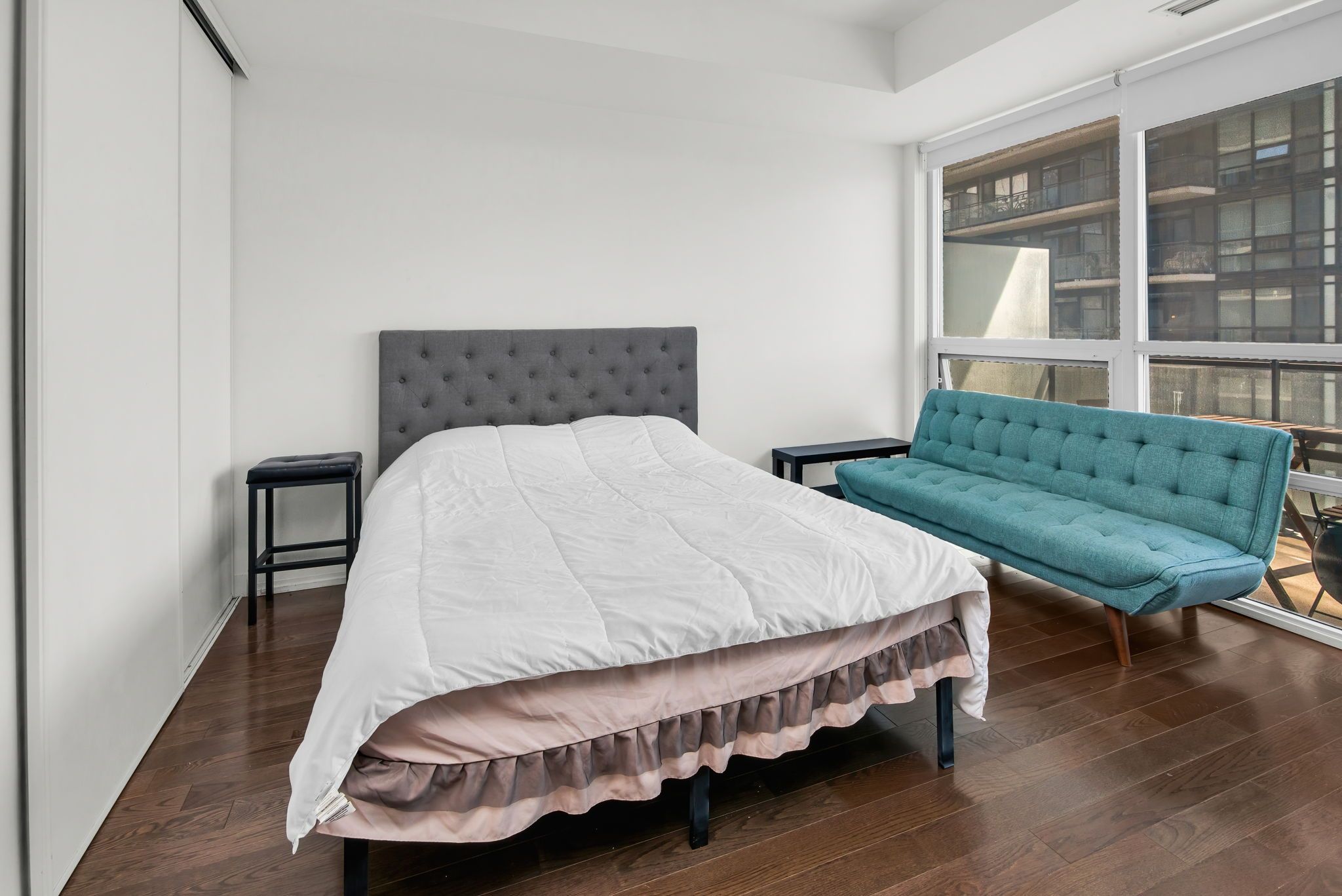 Cozy spacious studio in axiom condo! Enjoy high ceilings with floor to ceiling windows and 90 sq. Ft large balcony! Luxury amenities, 24 hours concierge, guest suites, gym, party room, rooftop deck and more! Convenient downtown location with walking distance to the financial district.