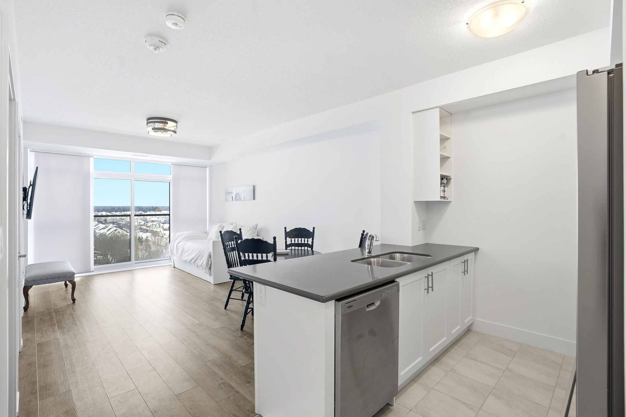 Two owned surface parking spots right out front that set the tone for this exceptional condo! Located at trend living on the 8th floor, this condo is extremely well kept and shows true pride of ownership! Featuring 1 spacious bedroom with a custom california closet and slide out laundry hampers, a bright, airy layout with large windows and a juliet balcony just off of the living room! The functional, modern kitchen features stainless steel appliances, a built-in microwave, and a convenient breakfast bar perfect for everyday living and entertaining. A full 4 piece bathroom, ensuite laundry ,additional closet space for your convenience and an owned locker providing extra storage! Residents enjoy fantastic amenities including a gym, party room with a pool table and a rooftop patio with bbqs. This condo is surrounded by everything you need including major hwy's, the go station only 10 minutes away for easy commutes, schools, parks, shopping, restaurants, and all essential needs! A truly move-in-ready home that has been meticulously cared for! This is condo living at its best.