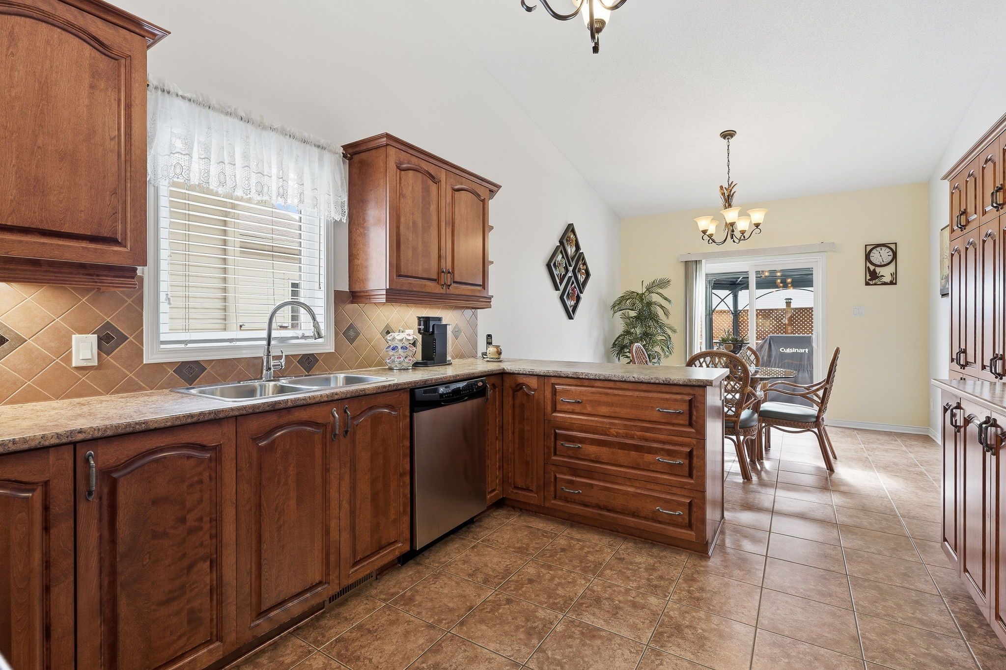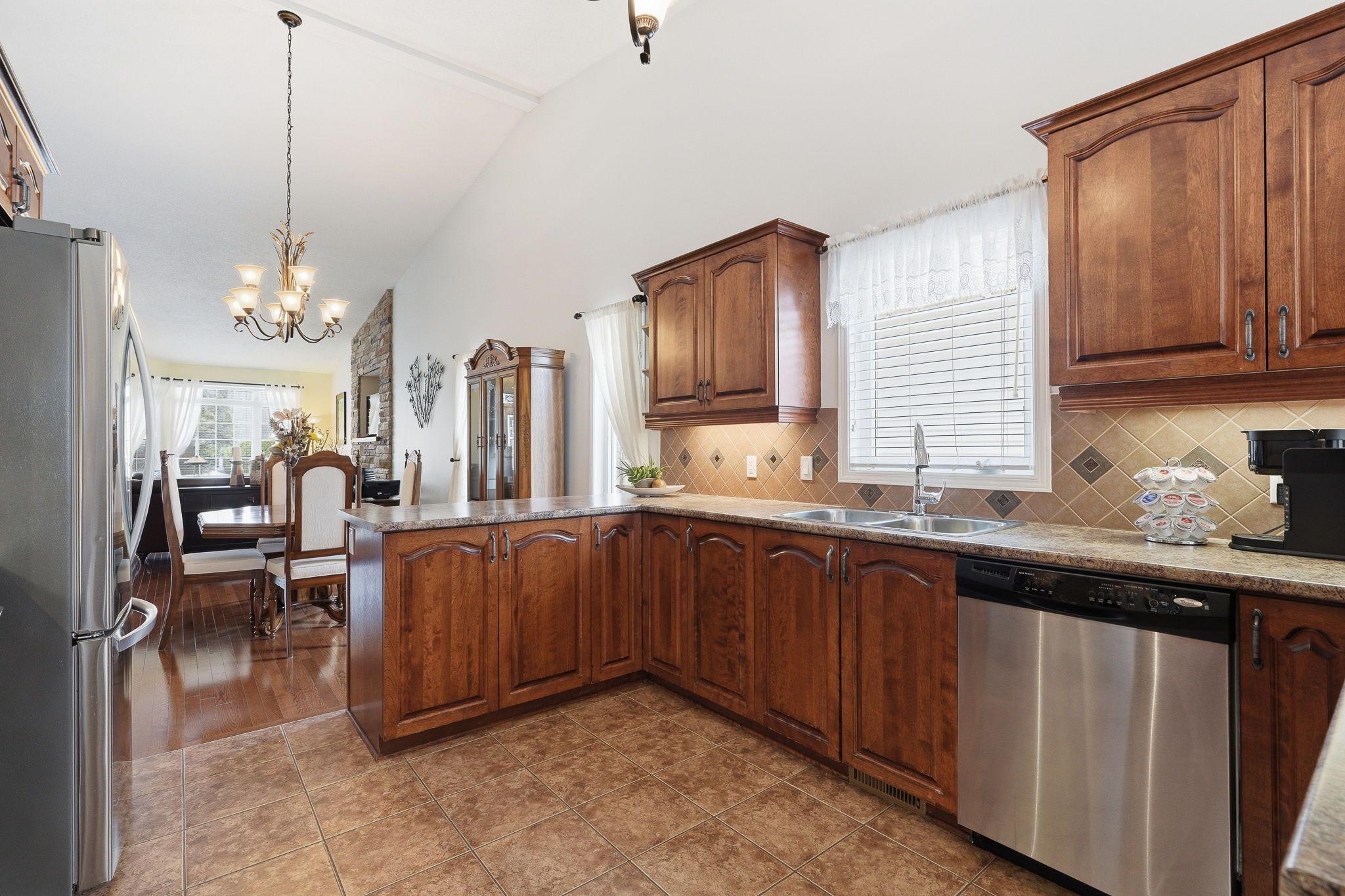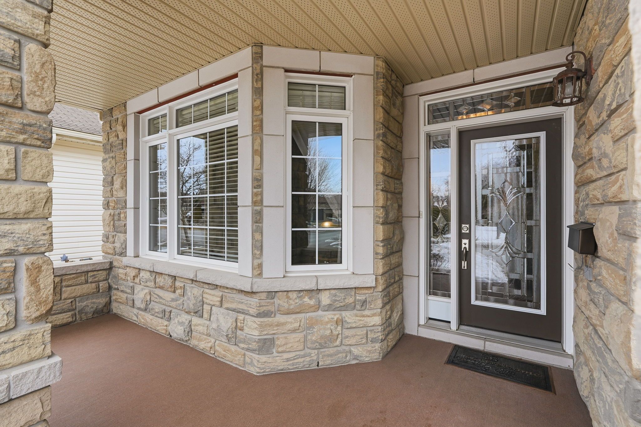 Welcome to this charming bungalow in clarence-rockland, featuring a beautiful stone façade and a bright, open-concept layout. The main floor offers soaring cathedral ceilings and a spacious living and dining area highlighted by a stunning gas stone fireplace that creates a warm and inviting focal point as you enter the home. The kitchen features birch cabinetry with decorative moldings and valance lighting, providing both style and functionality, with a cozy eating area and access to the backyard. The primary bedroom includes a walk-in closet and a private 3-piece ensuite, while the second bedroom is perfect for guests or a home office and is conveniently located near the main 4-piece bathroom. An elegant oak staircase leads to the unfinished basement with a rough-in for a third bathroom, offering excellent potential for future living space. The double gas-heated garage is equipped with insulated garage doors, hot and cold water access, and a floor drain. Outside, enjoy the fully fenced yard with a deck, gazebo, and storage shed, perfect for relaxing or entertaining.
