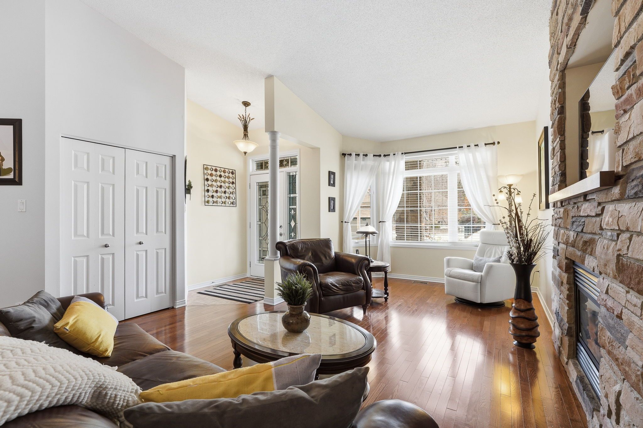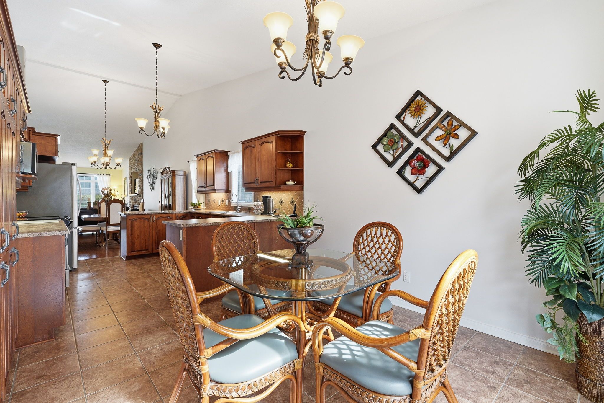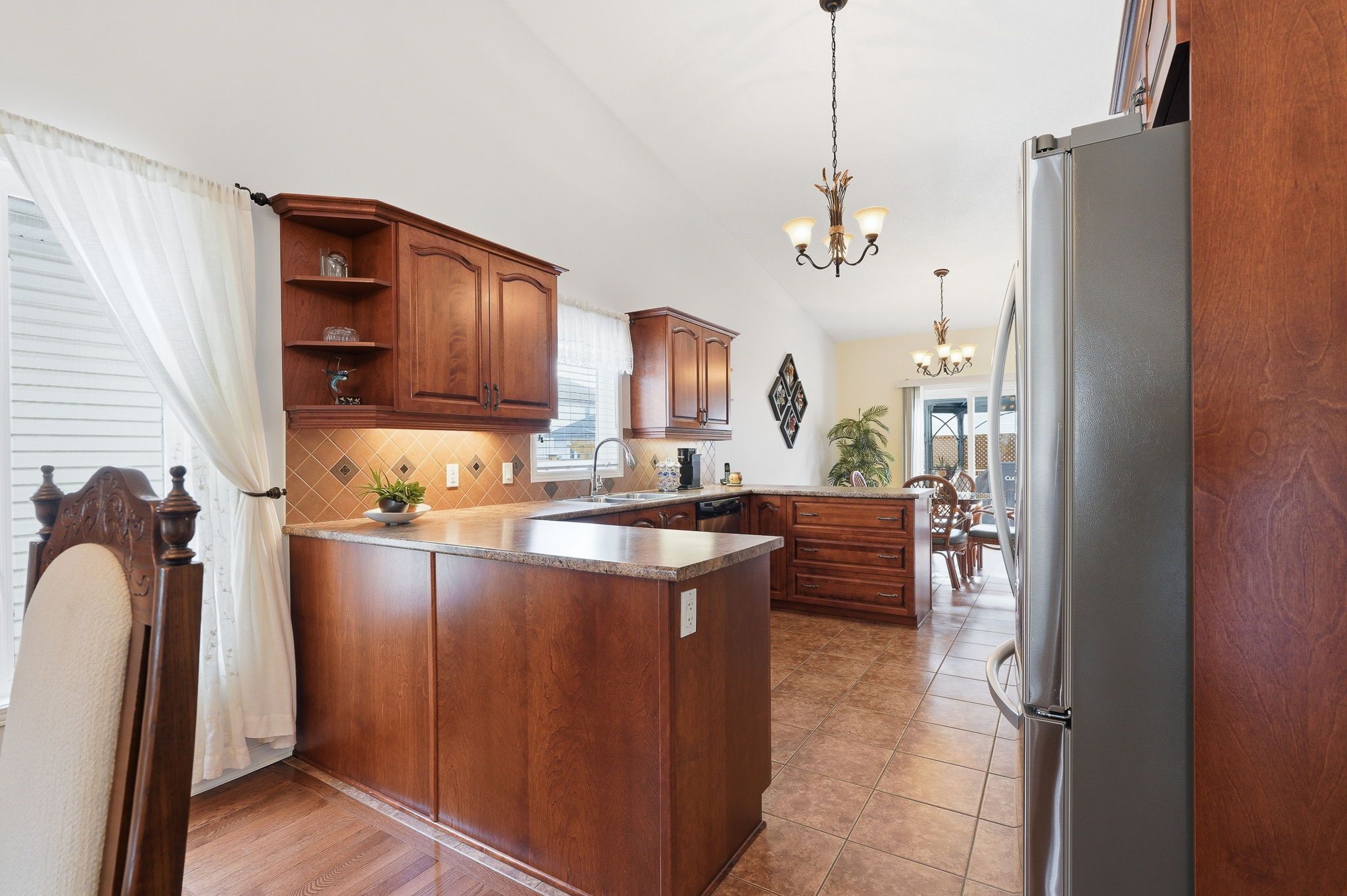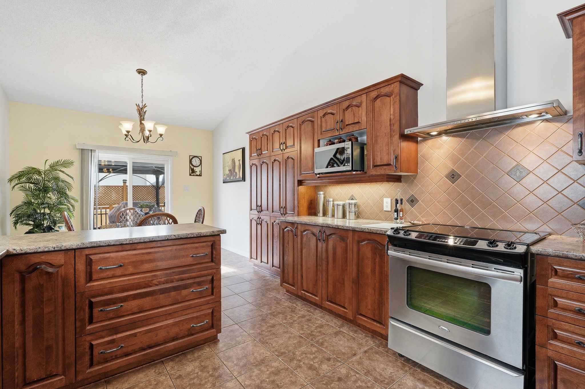 Welcome to this charming bungalow in clarence-rockland, featuring a beautiful stone façade and a bright, open-concept layout. The main floor offers soaring cathedral ceilings and a spacious living and dining area highlighted by a stunning gas stone fireplace that creates a warm and inviting focal point as you enter the home. The kitchen features birch cabinetry with decorative moldings and valance lighting, providing both style and functionality, with a cozy eating area and access to the backyard. The primary bedroom includes a walk-in closet and a private 3-piece ensuite, while the second bedroom is perfect for guests or a home office and is conveniently located near the main 4-piece bathroom. An elegant oak staircase leads to the unfinished basement with a rough-in for a third bathroom, offering excellent potential for future living space. The double gas-heated garage is equipped with insulated garage doors, hot and cold water access, and a floor drain. Outside, enjoy the fully fenced yard with a deck, gazebo, and storage shed, perfect for relaxing or entertaining.