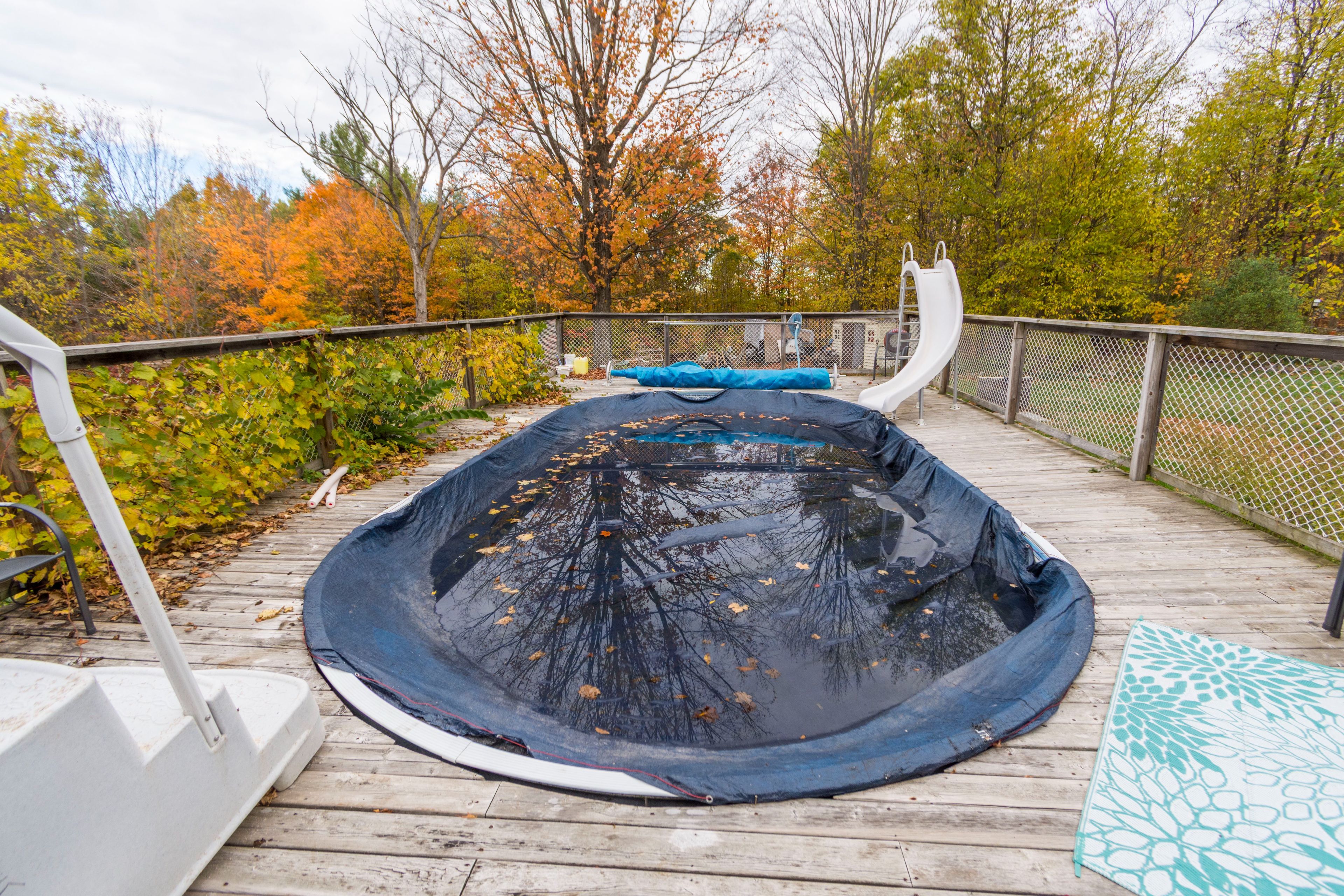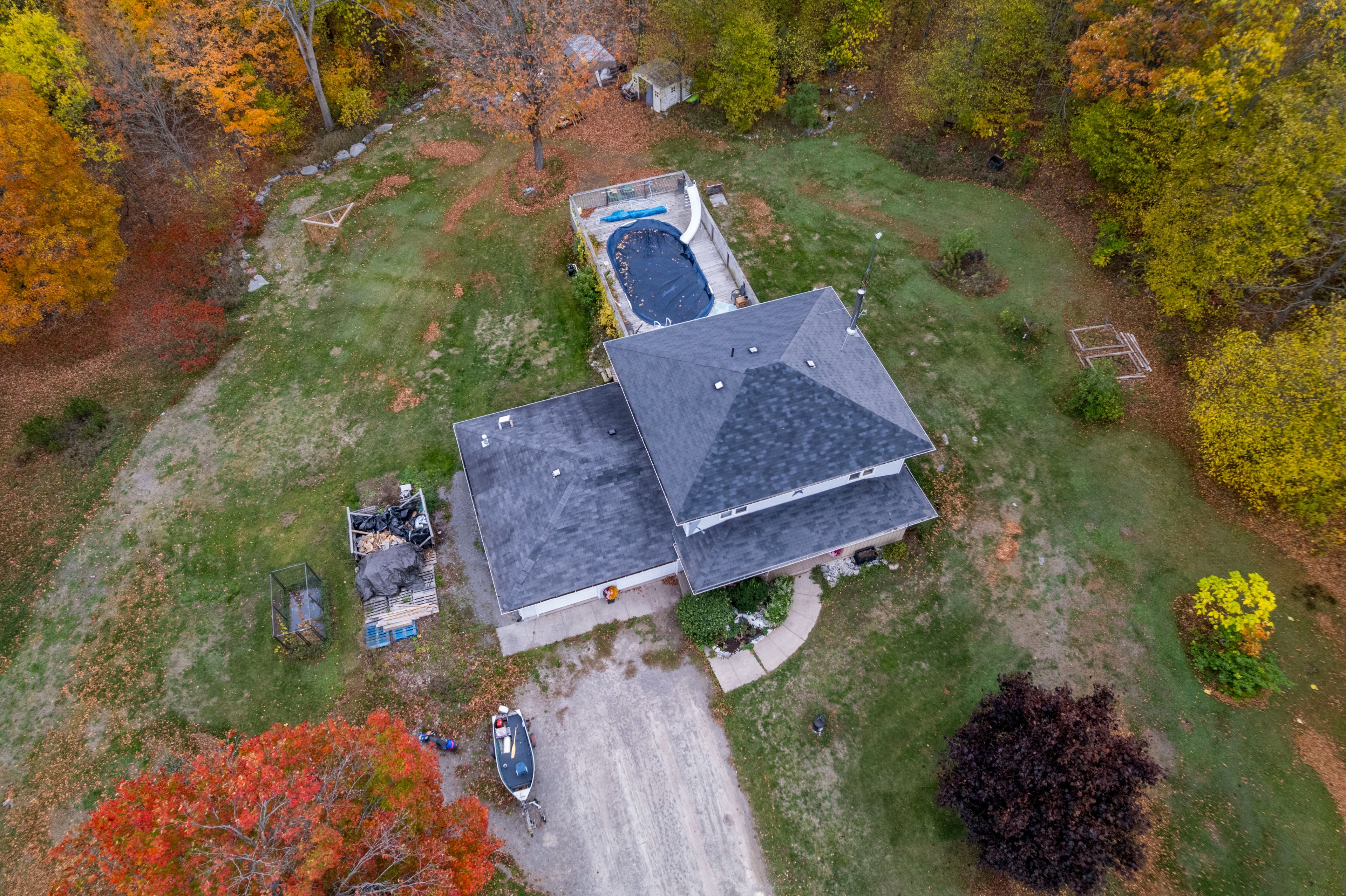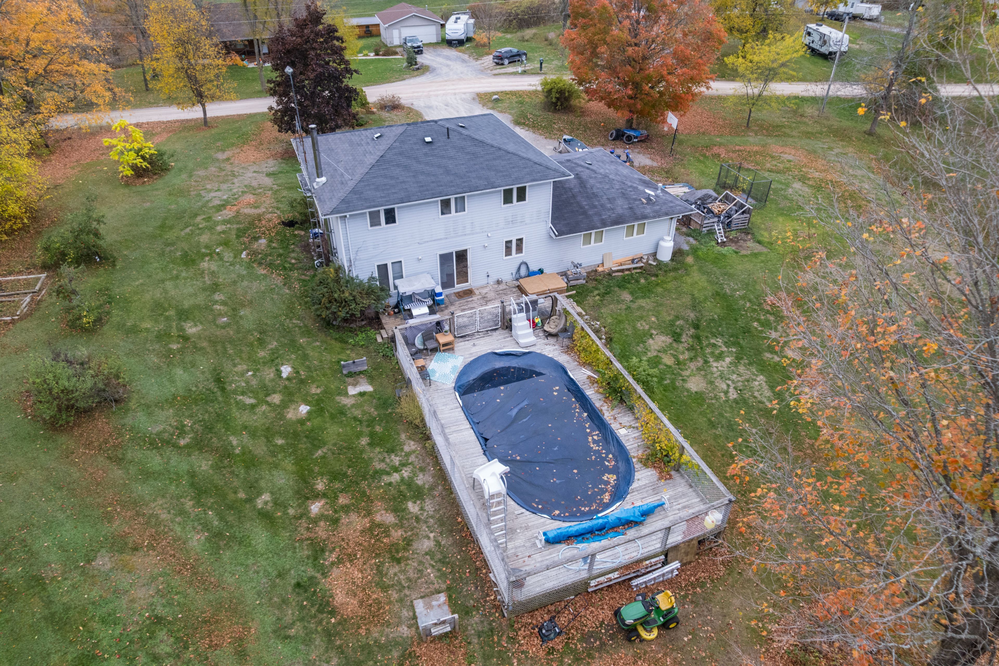 • Backyard features an above-ground pool and hot tub for relaxation.