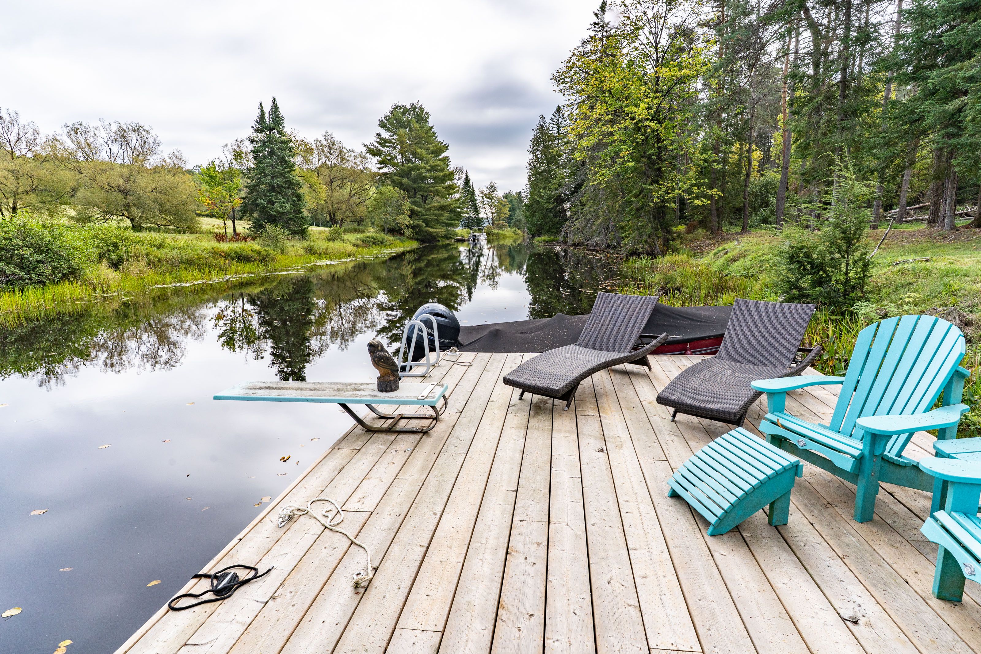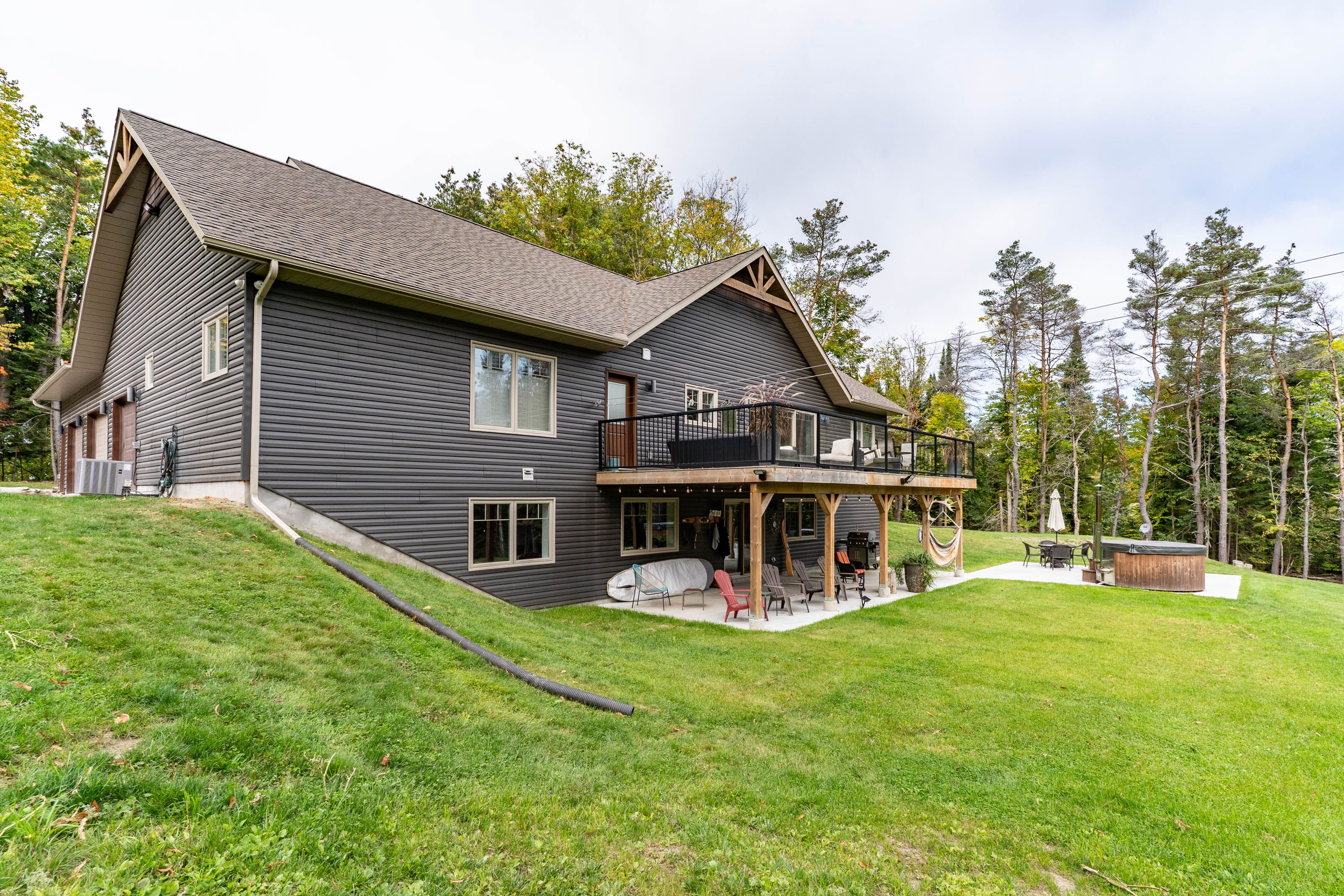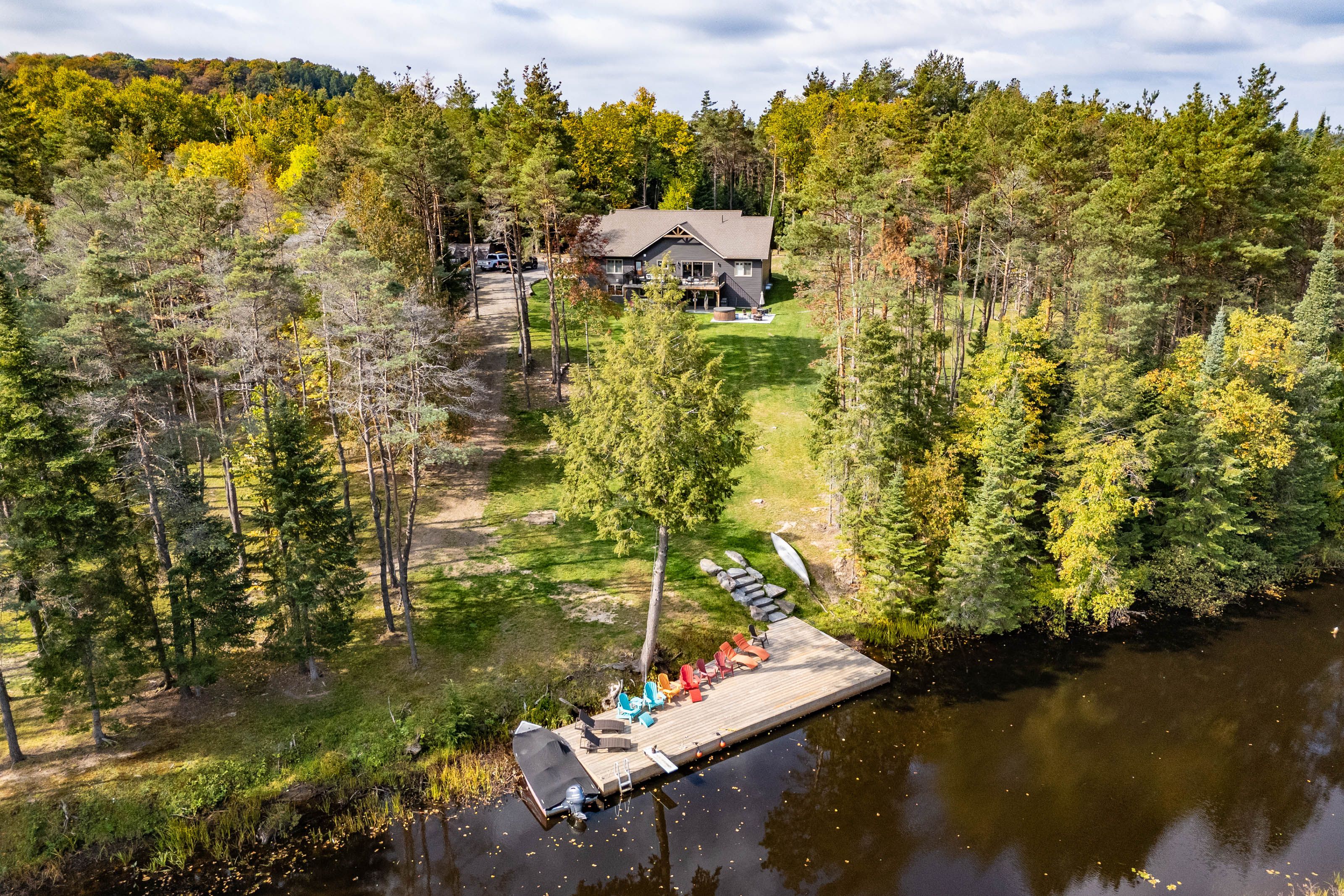 This is it! The complete package, sitting on about 4. 5 acres just minutes from hwy 11 this large custom home has a triple attached garage, walkout basement and around 400' of waterfront just a stones throw from mary lake. Offering direct access to beautiful mary lake and the 4 lake chain, this unique property has quiet and private dockage in the river with no neighbours across spoiling the serene view. The home was custom built in 2019 with quality finishes and a smart layout, it features a main floor primary suite, main floor laundry, a huge deck overlooking the expansive yard and river, and a walkout basement. The triple attached garage has a large loft currently used for storage but could be finished to suit your families needs. The large steel pile dock is great for lounging at the waters edge while the poured concrete patio is perfect for a campfire or to enjoy a soak in the wood fired hot tub under the stars. Extremely private, well thought out and the best of all worlds, this four season home or vacation property ticks so many boxes. Call for your private tour.
