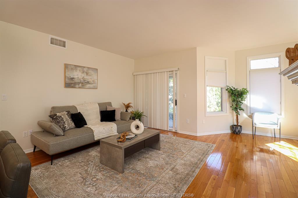• Spacious living room with hardwood floors leading to a backyard deck.