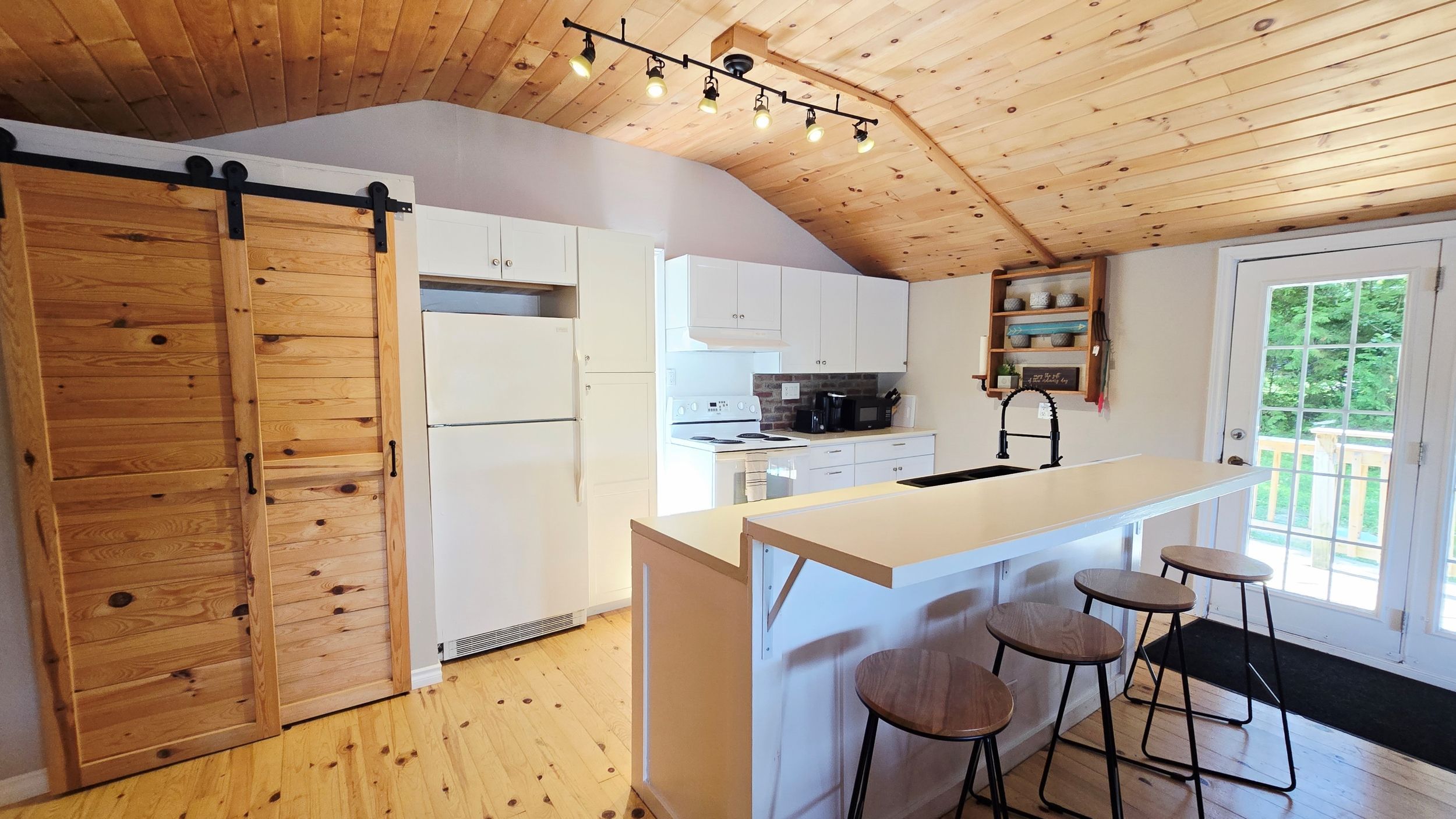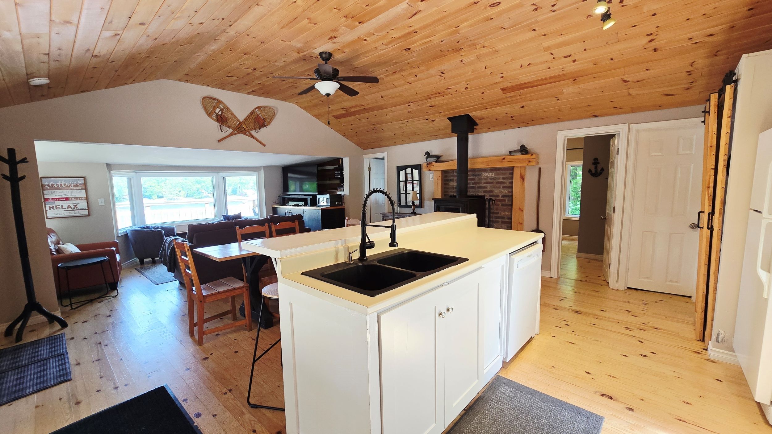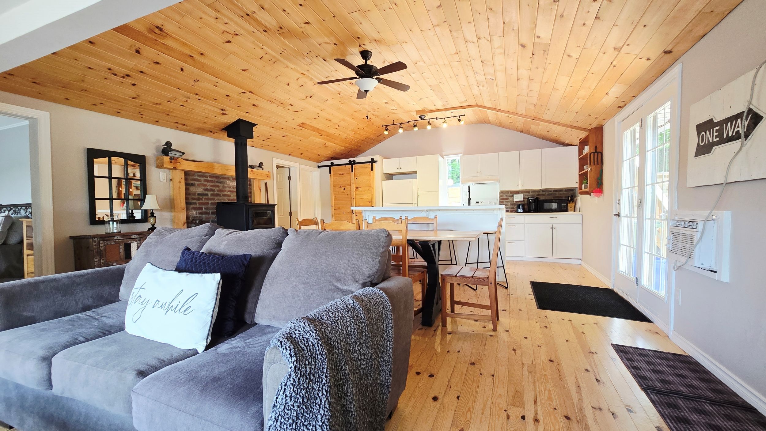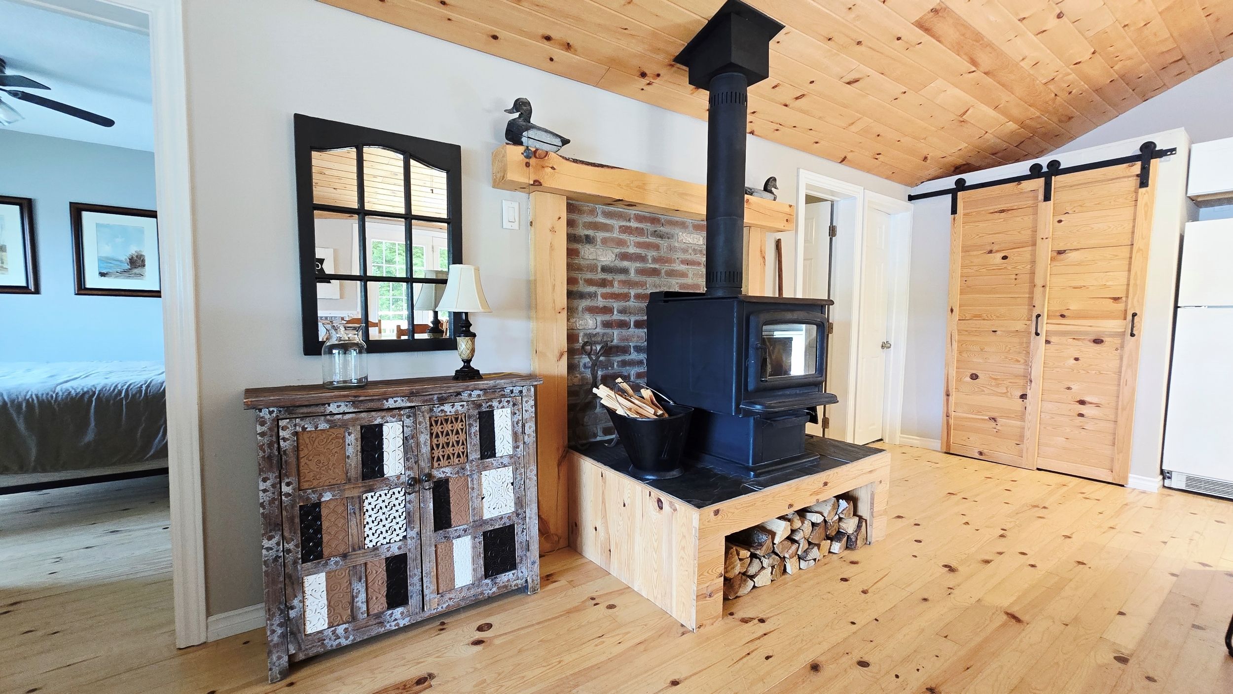 • Cozy open-concept interior with warm wood flooring and woodstove.