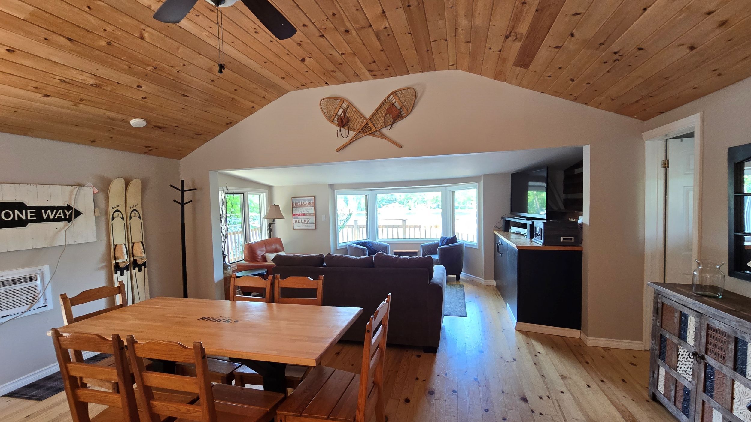 Welcome to an enchanting ottawa riverfront retreat on buckham's bay, boasting 100 feet of pristine shoreline great for docking a large boat and clear deep water for swimming! This cozy and delight 2-bedroom bungalow is the perfect all-year-round escape, featuring an inviting wrap-around deck with breathtaking views. The open-concept interior highlights pine flooring. Enjoy the warmth of a woodstove during chilly days & winter nights, complemented by kitchen with breakfast bar, spacious dining area open to the living room with bow window with stunning water views. Laundry closet next to kitchen. The primary bedroom opens to the waterside deck, ideal for tranquil moments & morning coffees. Updates include landscaping, retaining wall, footings & metal roof (2021), pine flooring & interior paint & some finishings (2021), propane furnace (2019), submersible well pump with heated line (2021) and septic system (2009). Includes appliances, dock and some furnishings. Immerse yourself in endless outdoor activities, from fishing, ice fishing and water sports to bbqs and stargazing by the bonfire. Close to the city, kanata's high tech sector, and the dnd campus, this retreat combines privacy with convenience to city amenities!