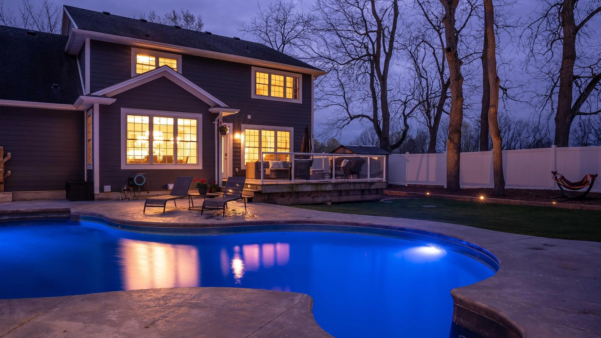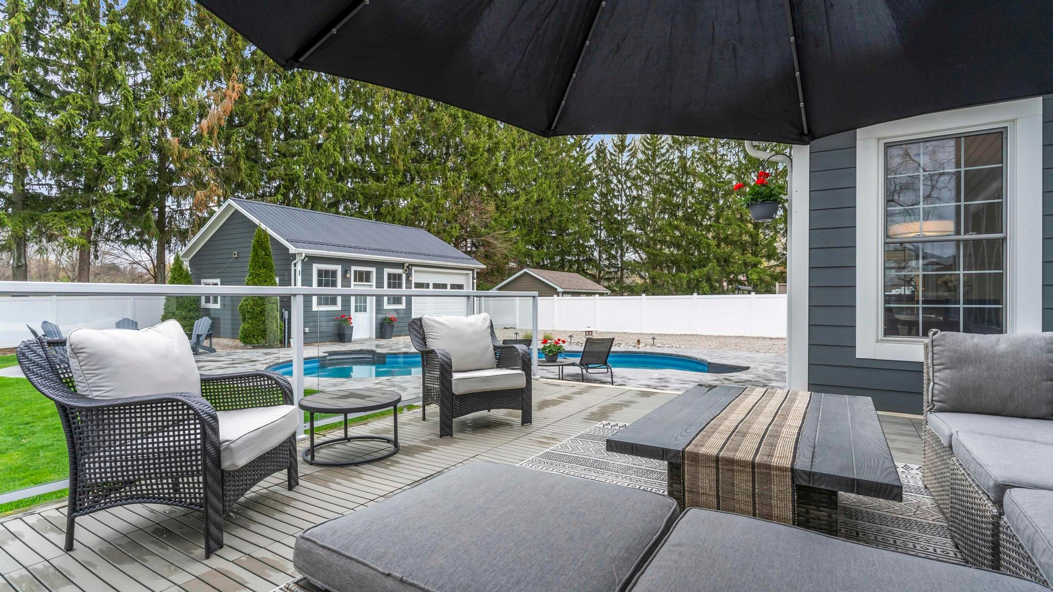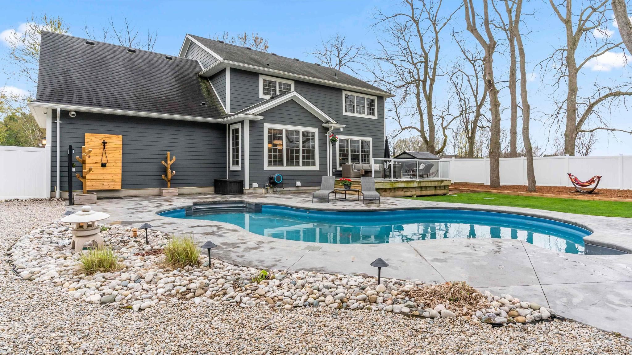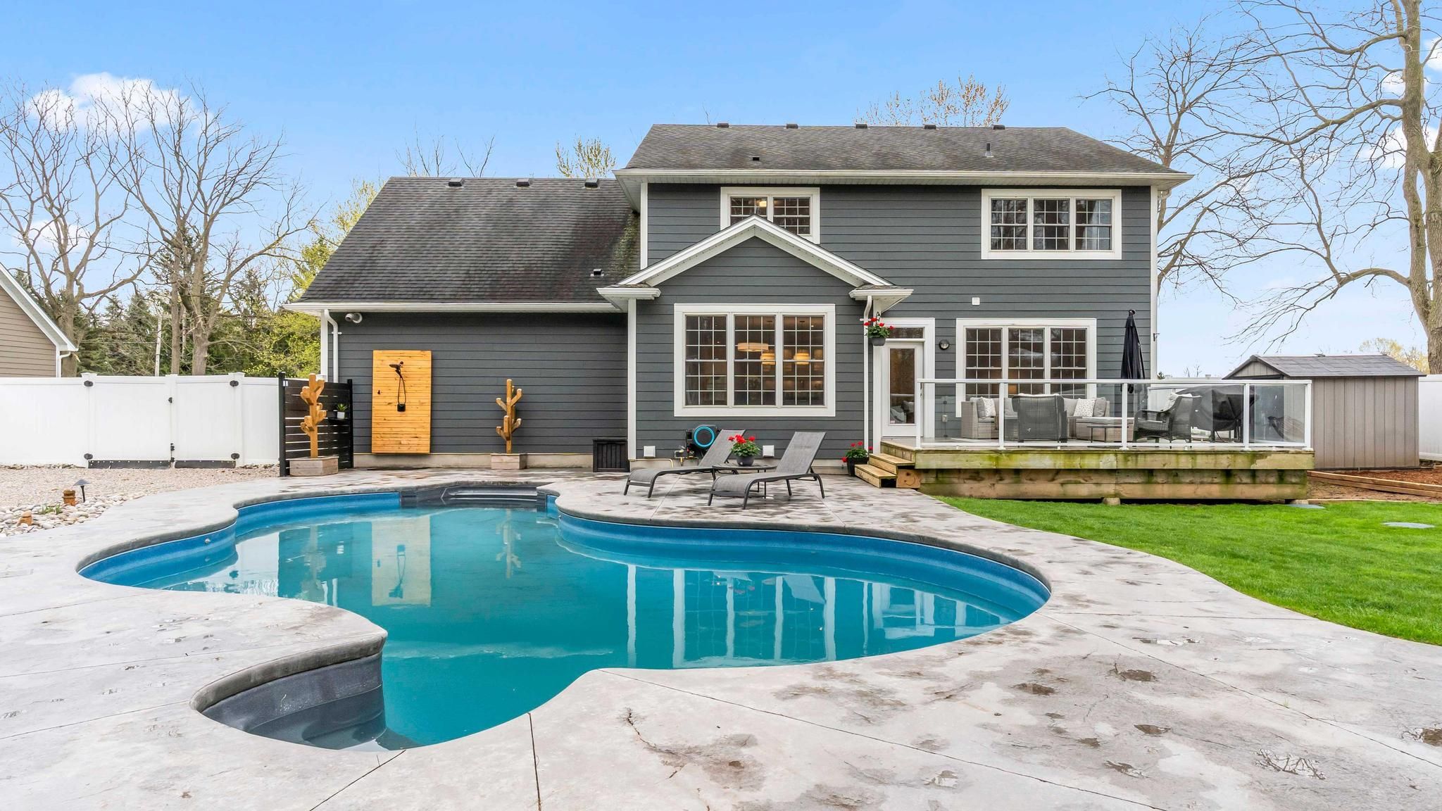 • Private backyard oasis featuring a heated saltwater pool and deck.