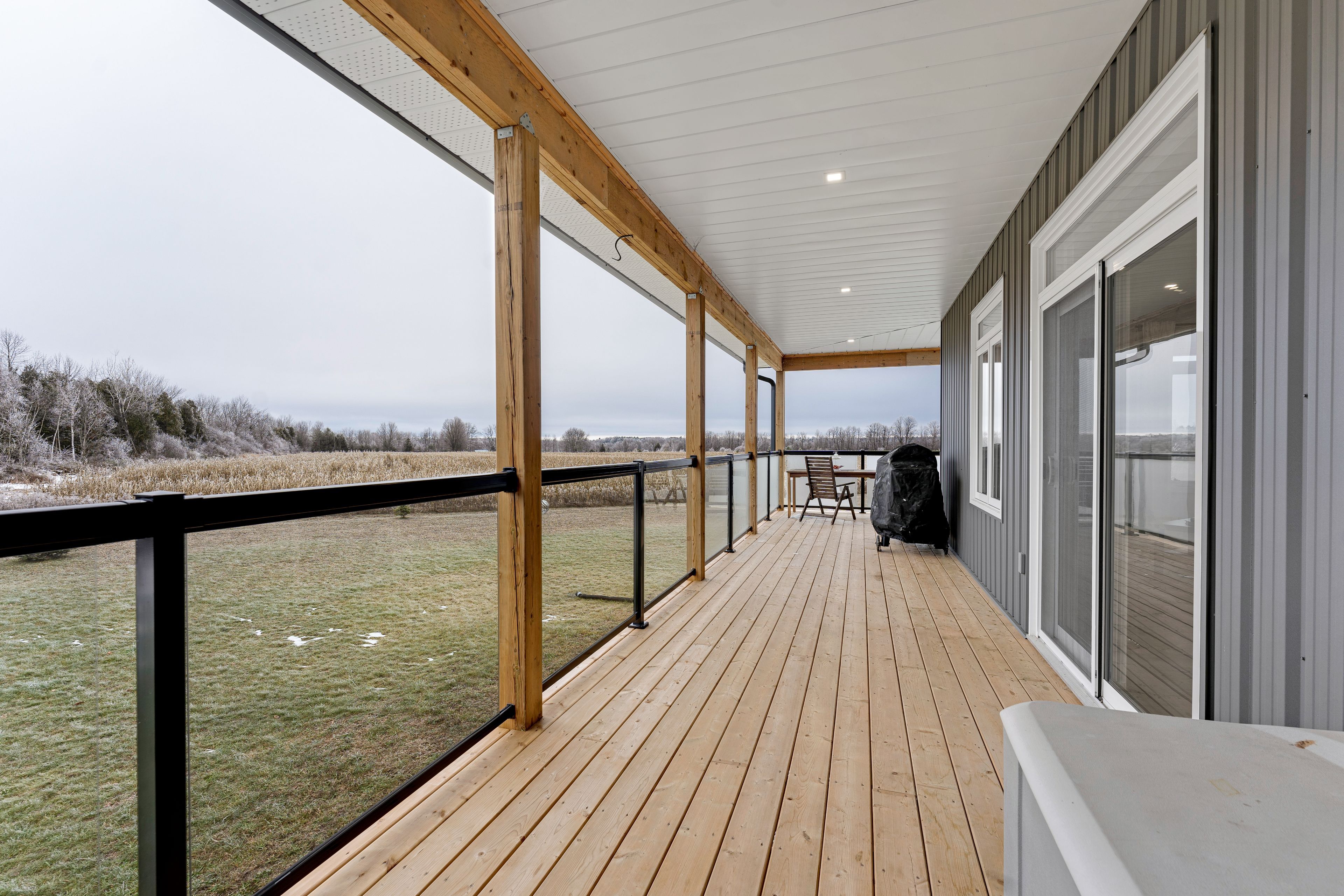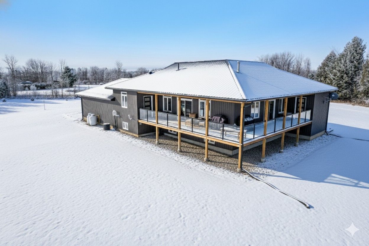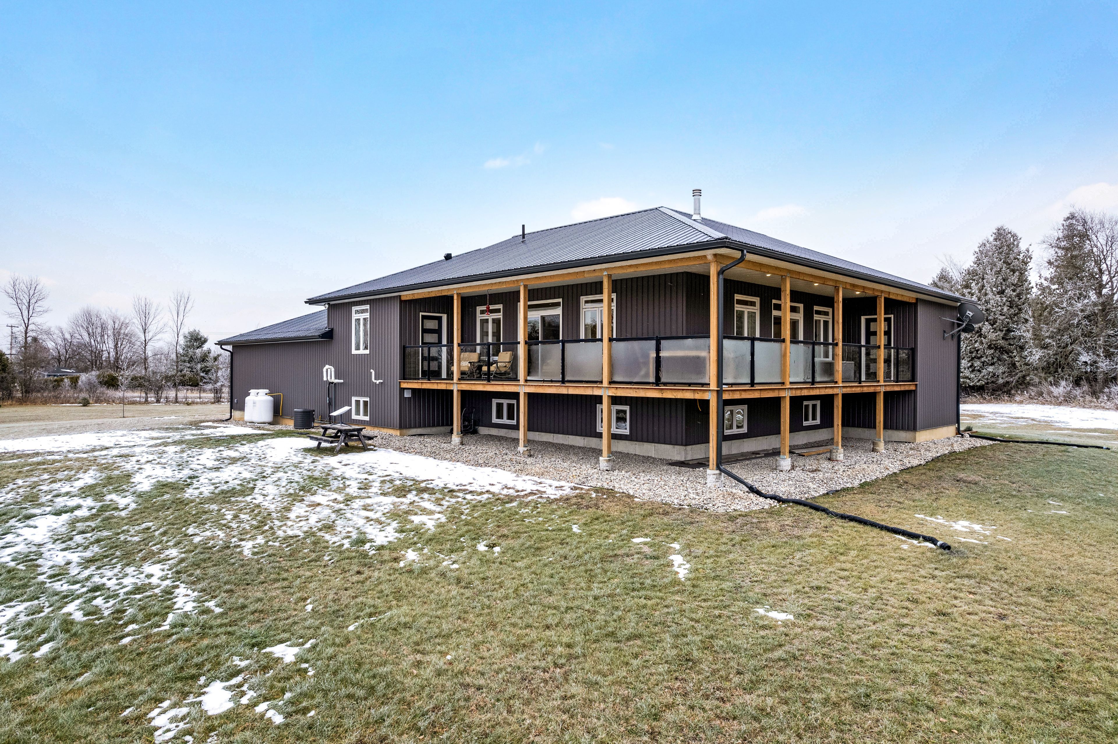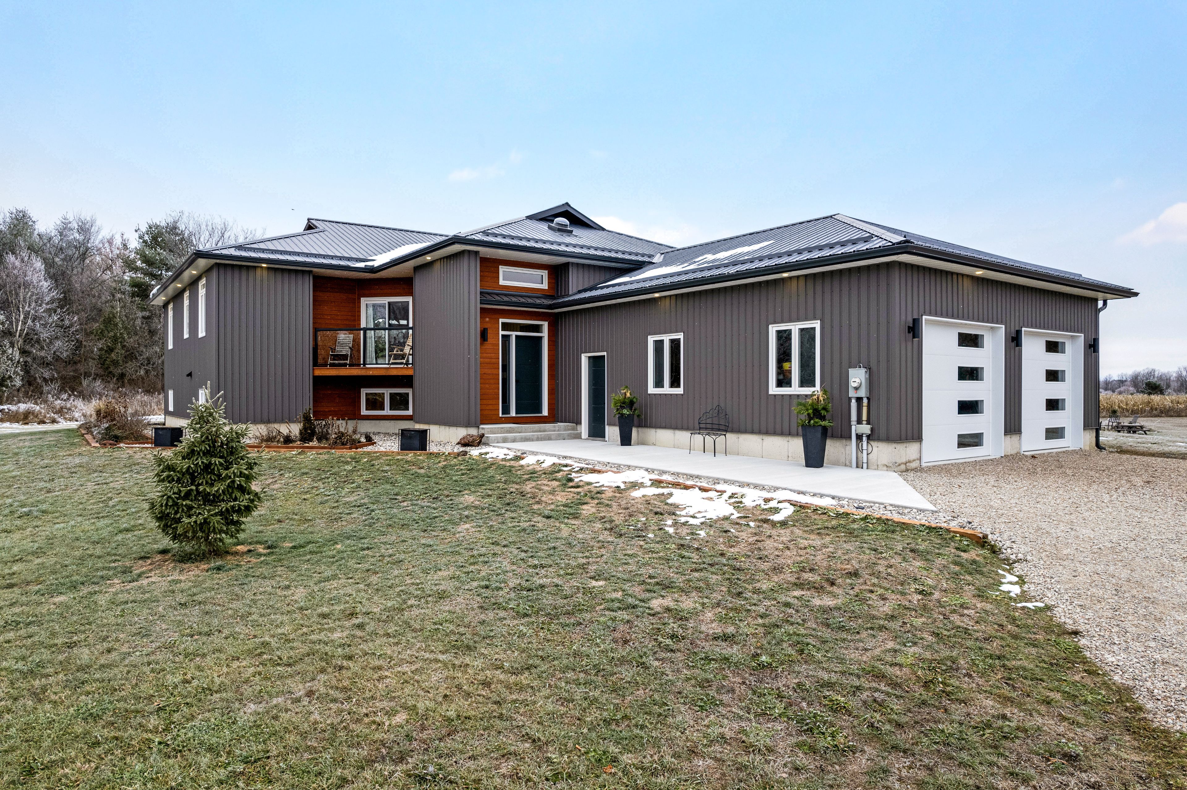 Outstanding. With smooth clean lines this 2022 home offers a sophisticated presence and, its unparalleled construction creates a wealth of efficiencies. The exterior steel siding is eye catching with its attractive slate-hued finish, accented by earthy warm cedar. The design elements blend flawlessly into 3 peaceful country acres. Step inside to the sleek foyer featuring white bright décor enhanced by double closet's charcoal glass panels; elegance added by the porcelain floor and glass chandelier. Flooring thru-out 3+1 bed, 2 full bath home is porcelain tile plus, luxury vinyl plank with cork cushioning for sound absorption - you will appreciate this with every step. Ceilings 9' high, light cascades inside thru big windows and living spaces insulated for sound separation from the bedrooms. Livingroom linear propane fireplace is surrounded by showcase porcelain wall. Impeccable gourmet kitchen most welcoming with cambria quartz countertops, custom deslaurier cabinetry, generous breakfast bar and premium bosch appliances including two built-in ovens. Adjoining butler's pantry and sitting area. Primary suite calming retreat with two large closets and luxurious 5-pc ensuite porcelain floor, two-sink quartz vanity, rainhead glass shower with body-spray tower and deluxe soaker tub. Two more bedrooms and well-appointed 4-pc bathroom also with porcelain floor, quartz vanity, touchscreen mirror and rainhead shower with body-spray. Lower level 8' ceilings, r22 insulation and potential for in-law suite with rough-ins for kitchen and bathroom. From lower level, direct access to double attached garage with hookup for overhead propane heater. Adding to home's ultra-modern design and commitment to quality is superior steel roof with protective membrane & r60 insulation. Steel fascia has recessed soffit lighting. High energy-efficient kohltech windows & propane furnace. Underground hydro line from road to home. On paved township road. Cell service & hi-speed. 10 mins perth.